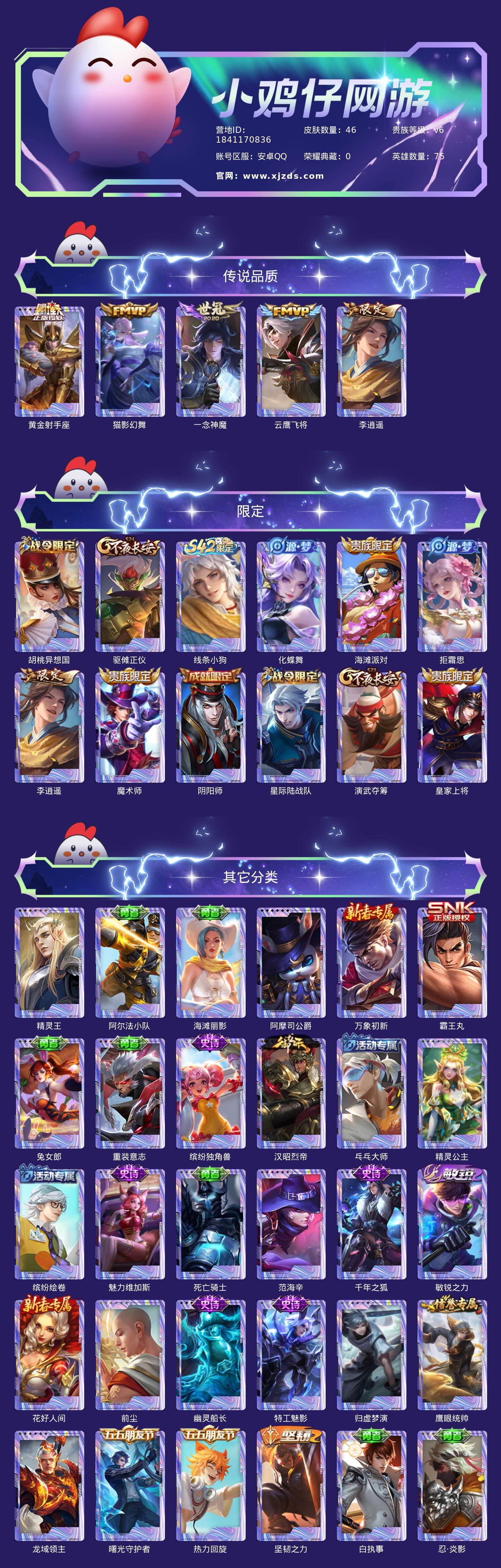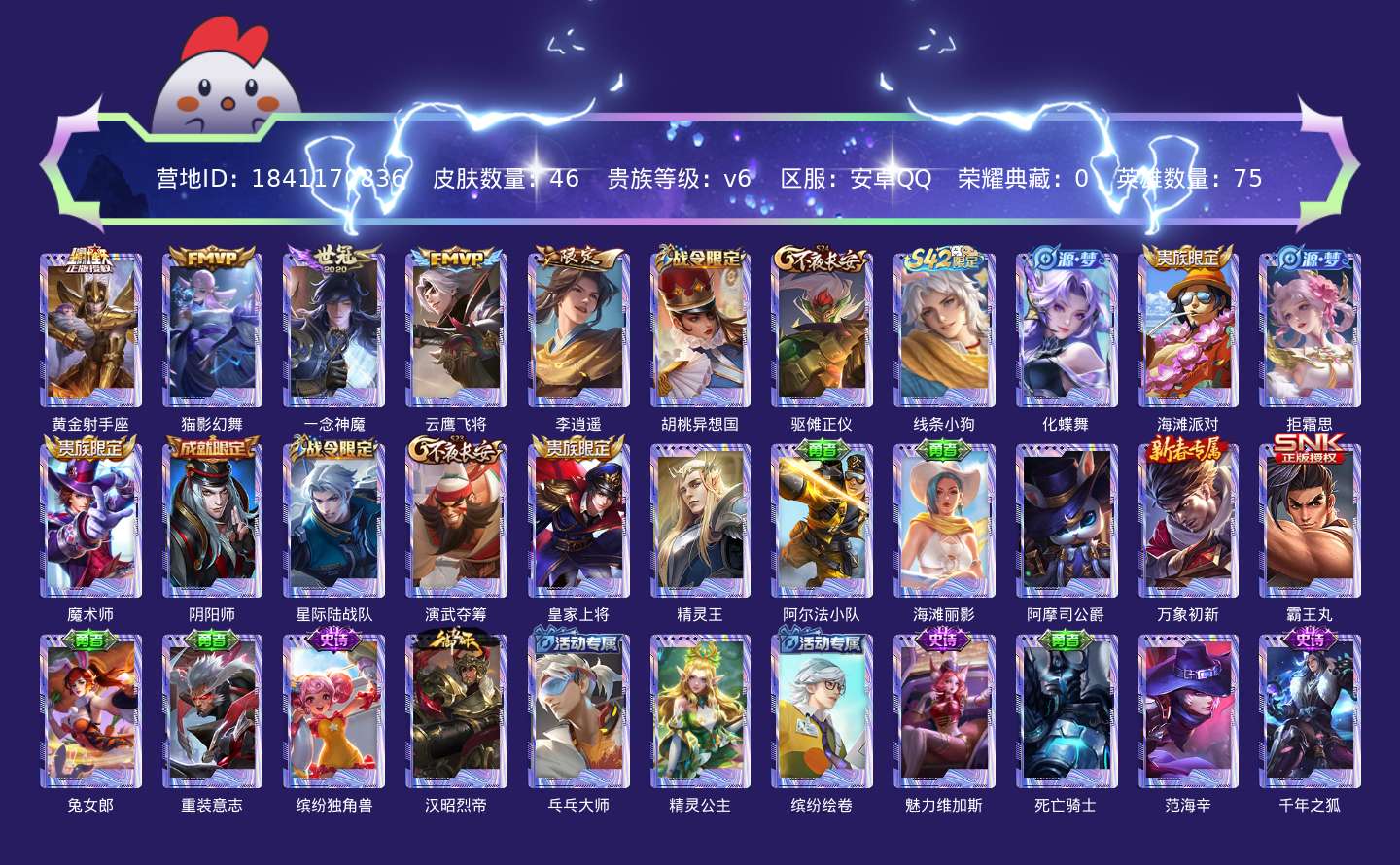 贵族等级:v6皮肤数:46传说品质5 英雄数:75
