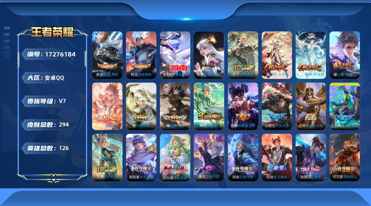 贵族等级:v7皮肤数:294传说品质12 生肖限定3 情人节限定2 珍品传说1 荣耀典藏2 英雄数:126