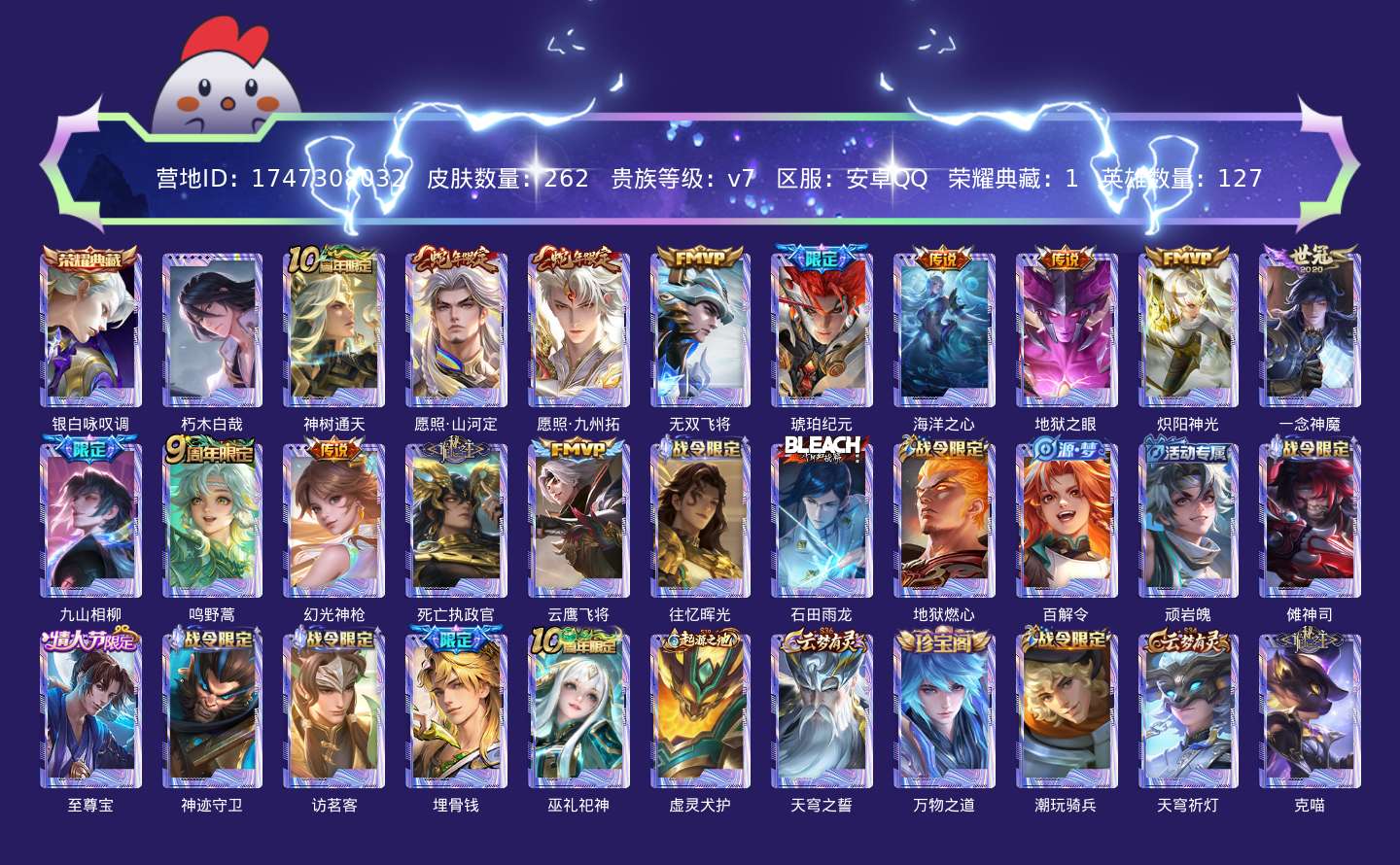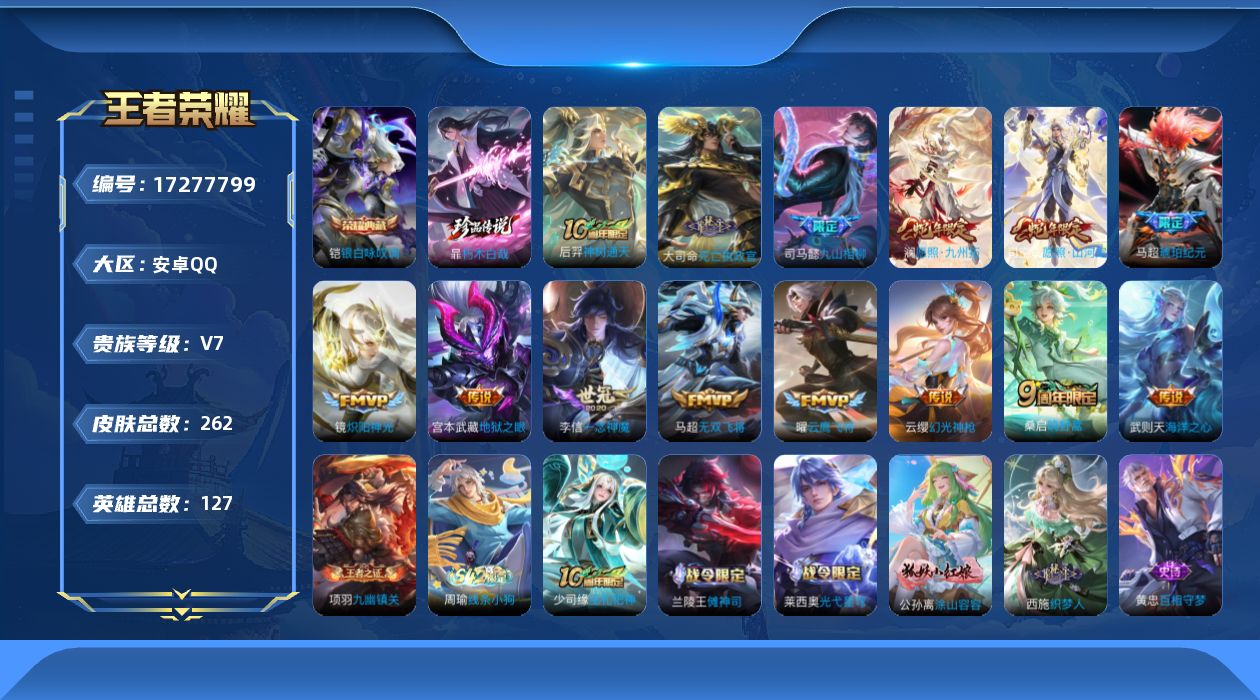 贵族等级:v7皮肤数:262传说品质14 生肖限定3 情人节限定1 珍品传说1 荣耀典藏1 英雄数:127