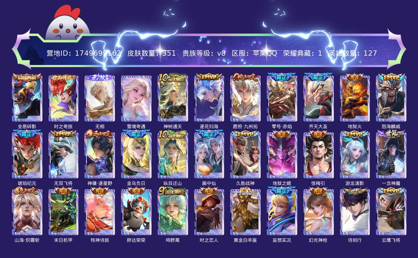 传说品质_后羿_神树通天传说品质_澜_逐花归海传说品质_澜_愿照·九州拓传说品质_孙悟空_零号·赤焰传说品质_孙悟空_齐天大圣传说品质_孙悟空_地狱火传说品质_吕布_怒海麟威传说品质_马超_琥珀纪元传说品质_马超_无双飞将传说品质_马超_神骥·逐星野传说品质_海月_金乌负日传说品质_杨戬_纵目迁山传说品质_干将莫邪_画中仙传说品质_干将莫邪_久胜战神传说品质_宫本武藏_地狱之眼传说品质_宫本武藏_惊梅引传说品质_西施_游龙清影传说品质_李信_一念神魔传说品质_李信_山海·炽霜斩传说品质_孙尚香_末日机甲传说品质_庄周_牧神诗旅传说品质_梦奇_胖达荣荣传说品质_桑启_鸣野蒿传说品质_刘备_时之恋人传说品质_张良_黄金白羊座传说品质_马可波罗_妄想实况传说品质_云缨_幻光神枪传说品质_李白_诗剑行传说品质_曜_云鹰飞将传说品质_狄仁杰_超时空战士传说品质_达摩_黄金狮子座传说品质_虞姬_启明星使传说品质_裴擒虎_祥瑞亨通传说品质_王昭君_乞巧织情