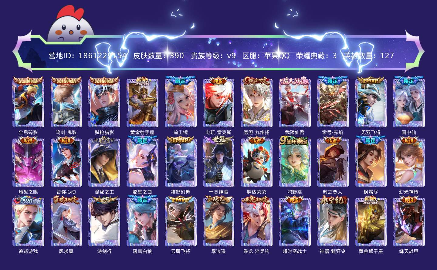 传说品质_后羿_黄金射手座传说品质_娜可露露_前尘镜传说品质_澜_电玩·雷克斯传说品质_澜_愿照·九州拓传说品质_诸葛亮_武陵仙君传说品质_孙悟空_零号·赤焰传说品质_马超_无双飞将传说品质_干将莫邪_画中仙传说品质_宫本武藏_地狱之眼传说品质_周瑜_音你心动传说品质_元歌_诡秘之主传说品质_花木兰_燃星之曲传说品质_貂蝉_猫影幻舞传说品质_李信_一念神魔传说品质_梦奇_胖达荣荣传说品质_桑启_鸣野蒿传说品质_刘备_时之恋人传说品质_橘右京_枫霜尽传说品质_云缨_幻光神枪传说品质_亚瑟_追逃游戏传说品质_李白_凤求凰传说品质_李白_诗剑行传说品质_亚连_落雪白狼传说品质_曜_云鹰飞将传说品质_曜_李逍遥 传说品质_孙策_乘龙·淬吴钩传说品质_狄仁杰_超时空战士传说品质_狄仁杰_神器·狴犴令传说品质_达摩_黄金狮子座传说品质_铠_绛天战甲传说品质_虞姬_启明星使传说品质_百里玄策_白虎志传说品质_韩信_踏浪归传说品质_赵云_淬星耀世传说品质_裴擒虎_祥瑞亨通