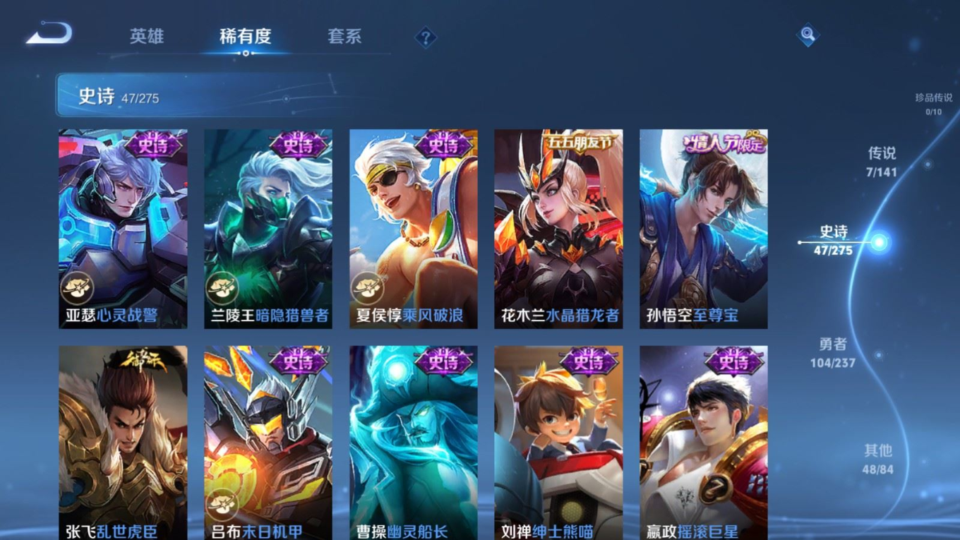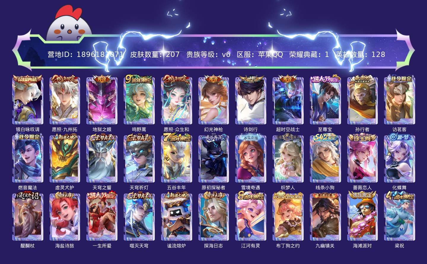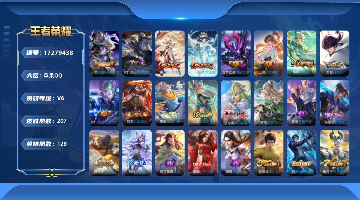 贵族等级:v6皮肤数:207传说品质7 生肖限定2 情人节限定2 荣耀典藏1 英雄数:128