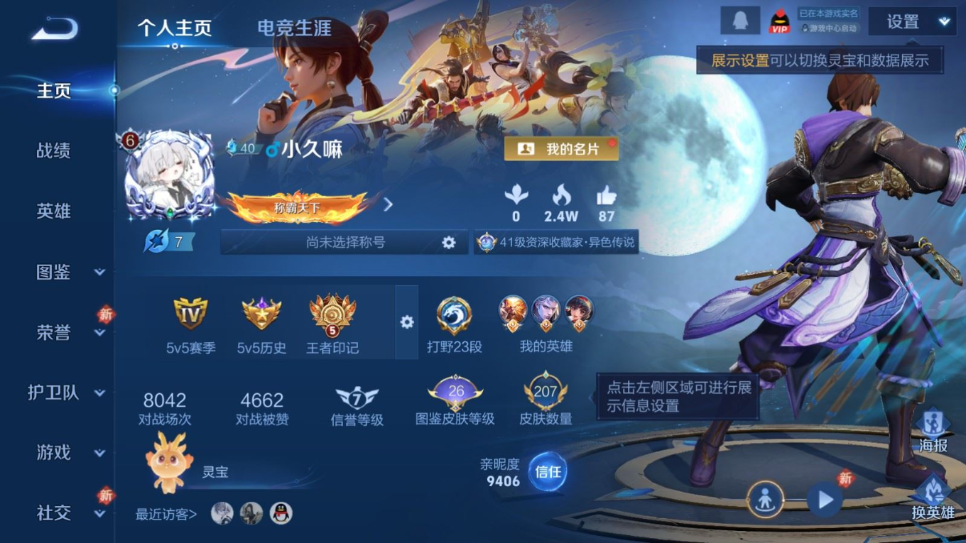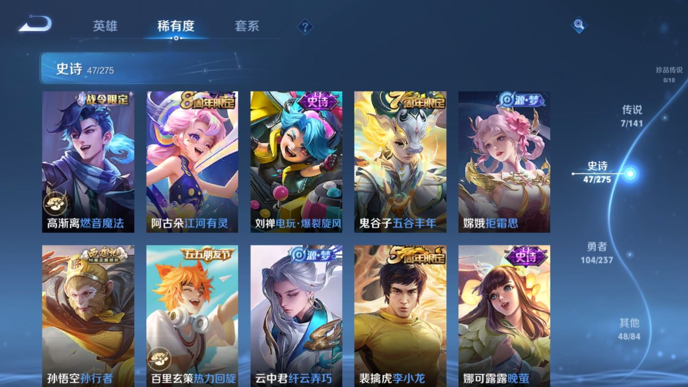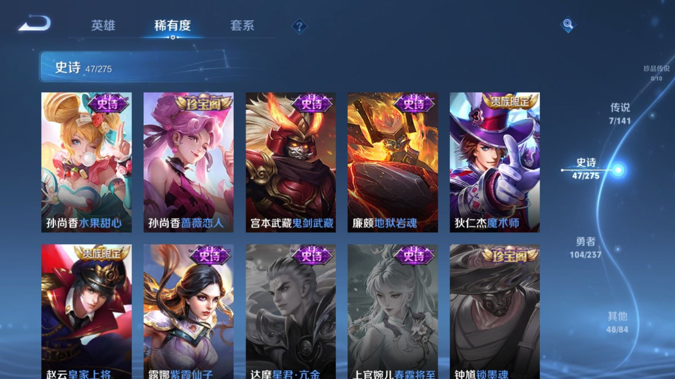 贵族等级:v6皮肤数:207传说品质7 生肖限定2 情人节限定2 荣耀典藏1 英雄数:128