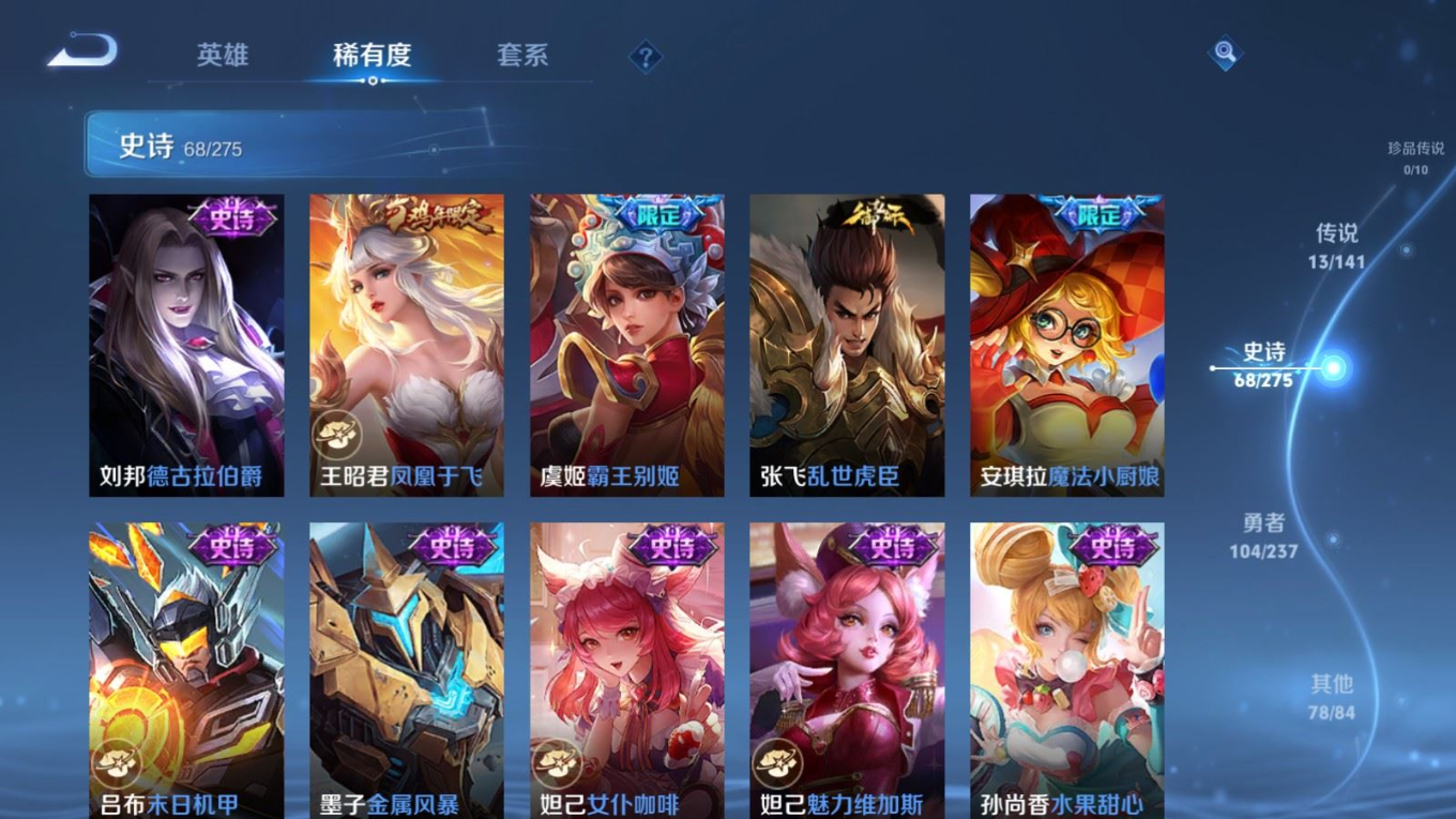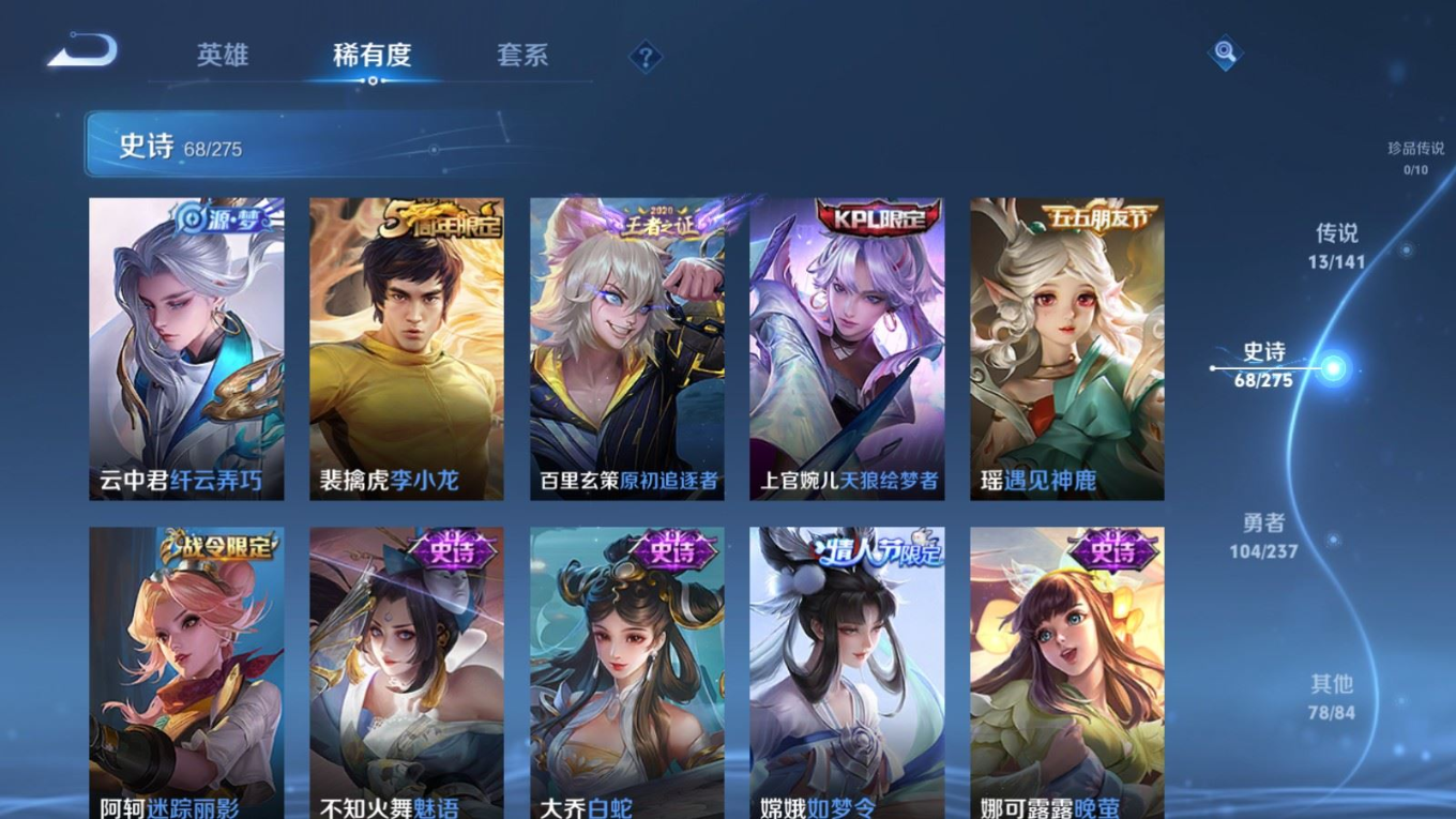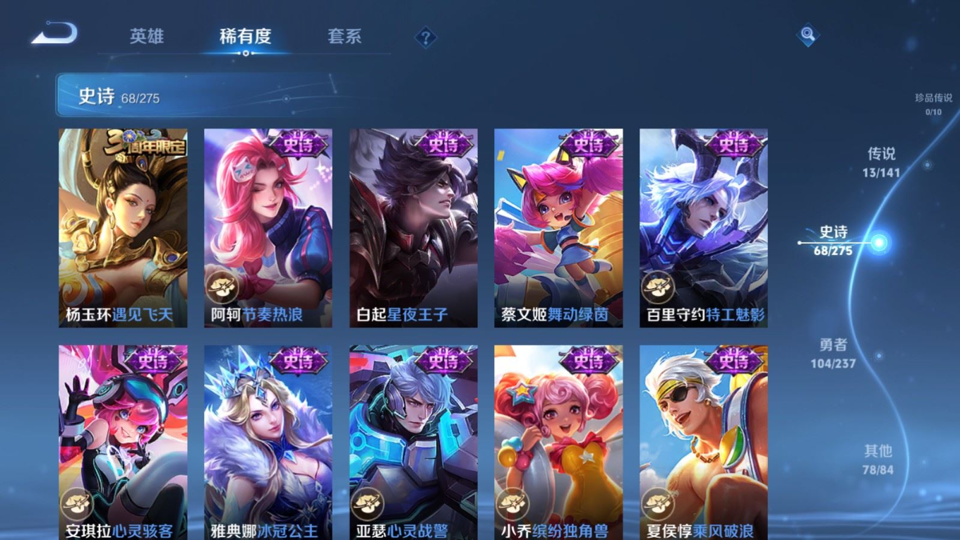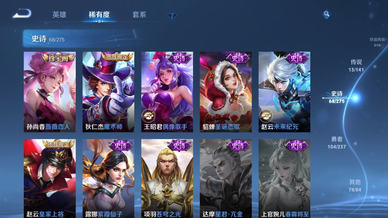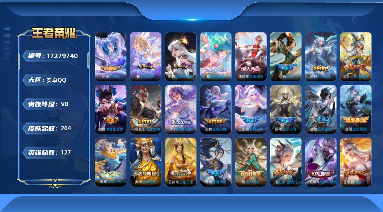 贵族等级:v8皮肤数:264传说品质13 情人节限定3 荣耀典藏1 生肖限定4 英雄数:127