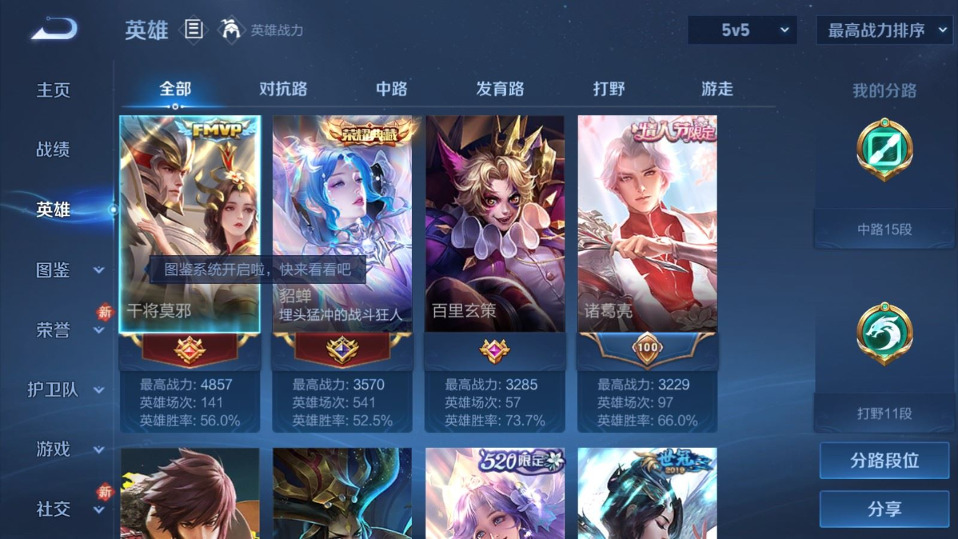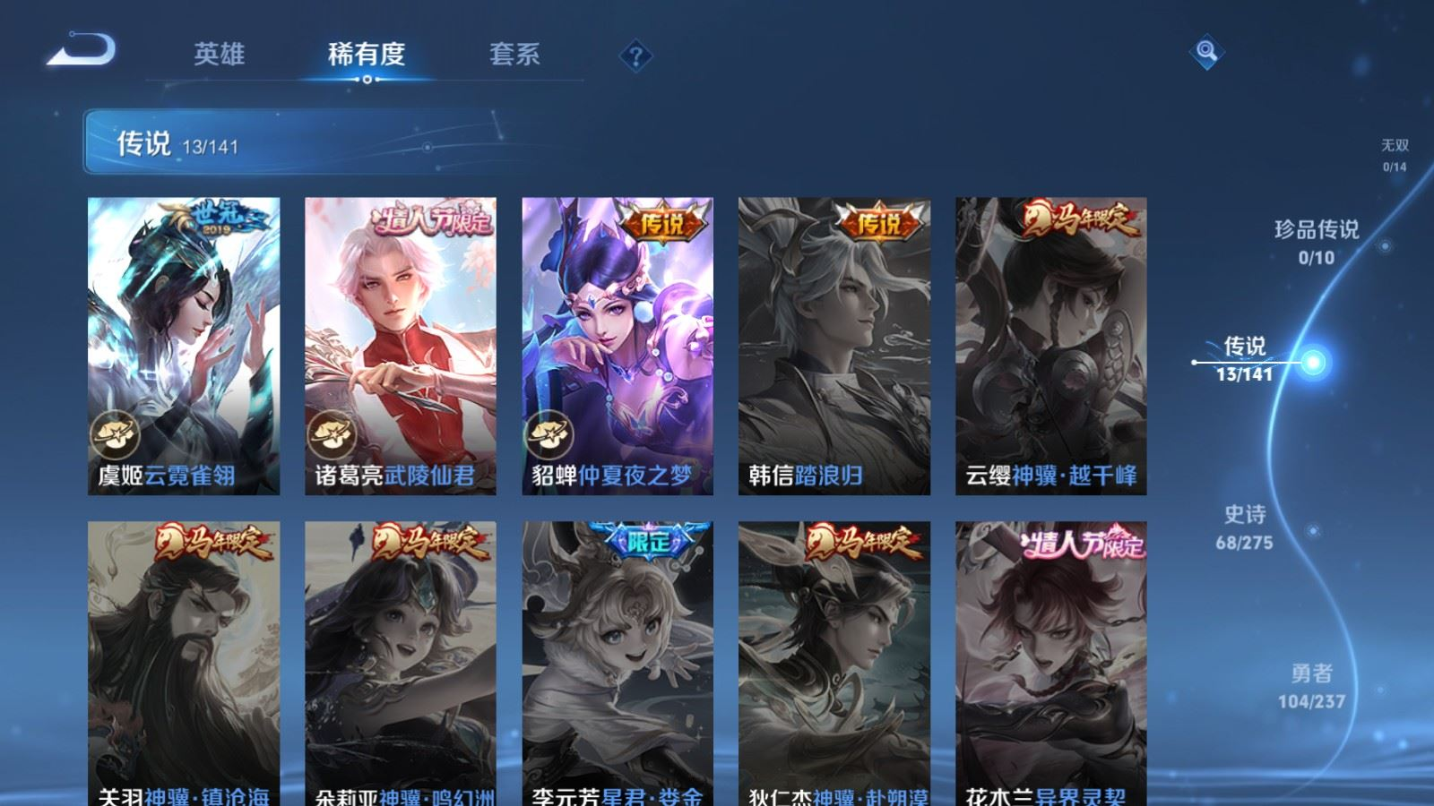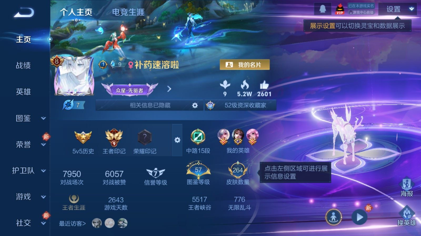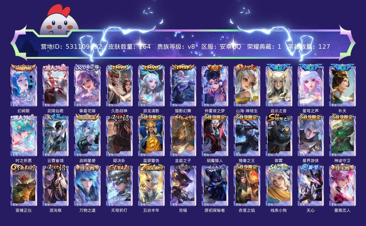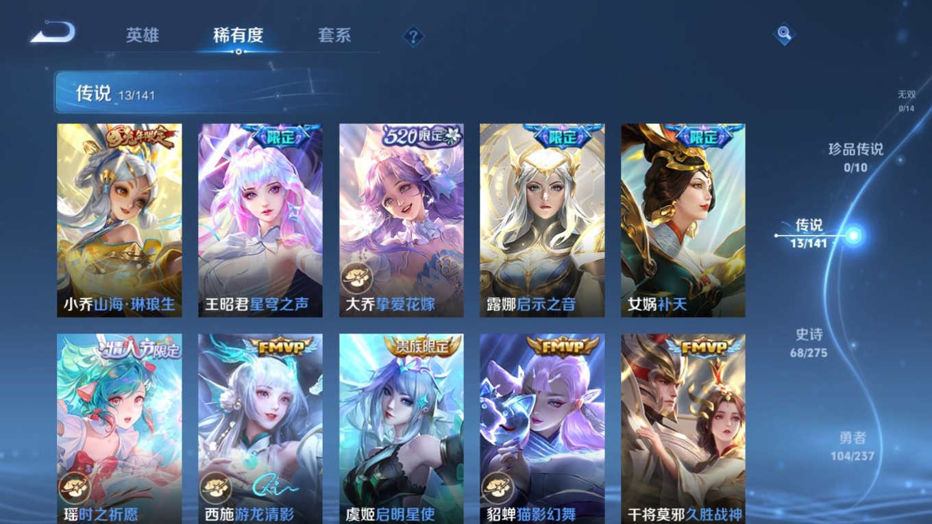贵族等级:v8皮肤数:264传说品质13 情人节限定3 荣耀典藏1 生肖限定4 英雄数:127