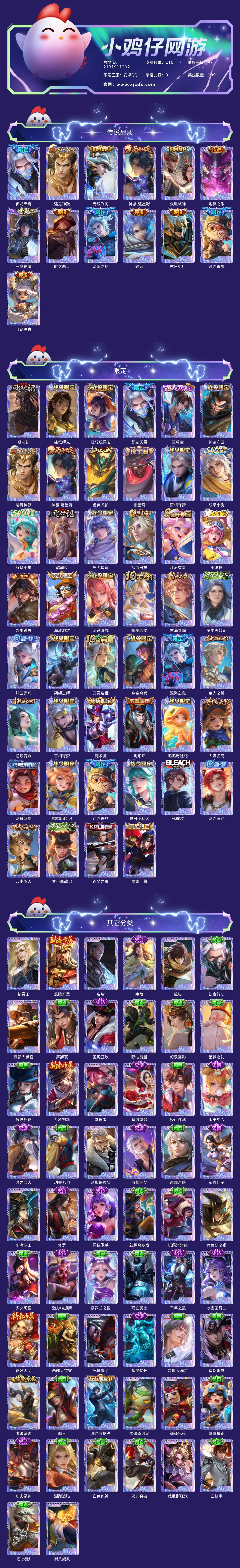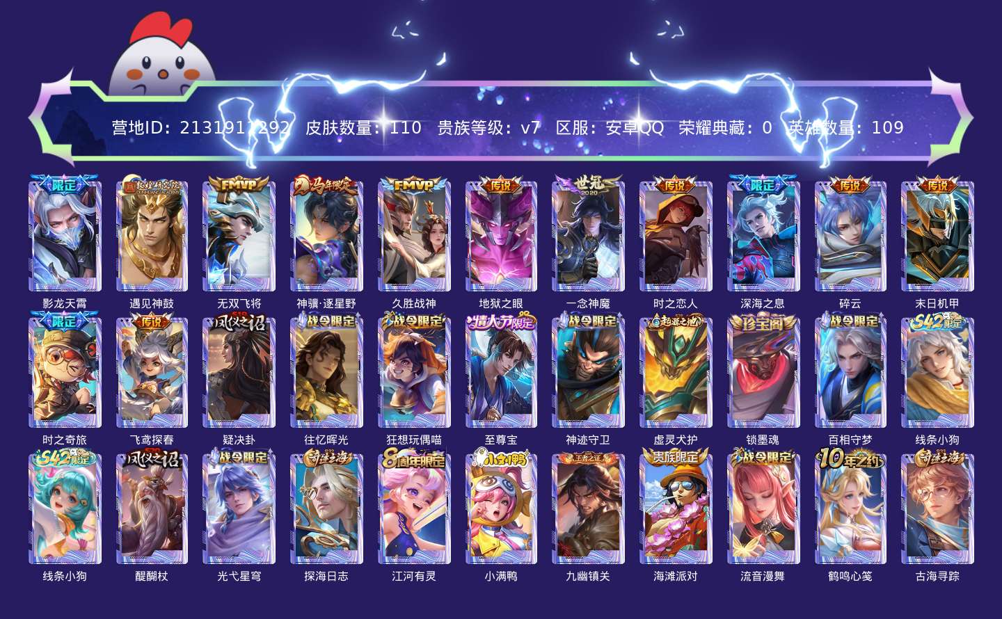 贵族等级:v7皮肤数:110传说品质13 情人节限定1 生肖限定1 英雄数:109