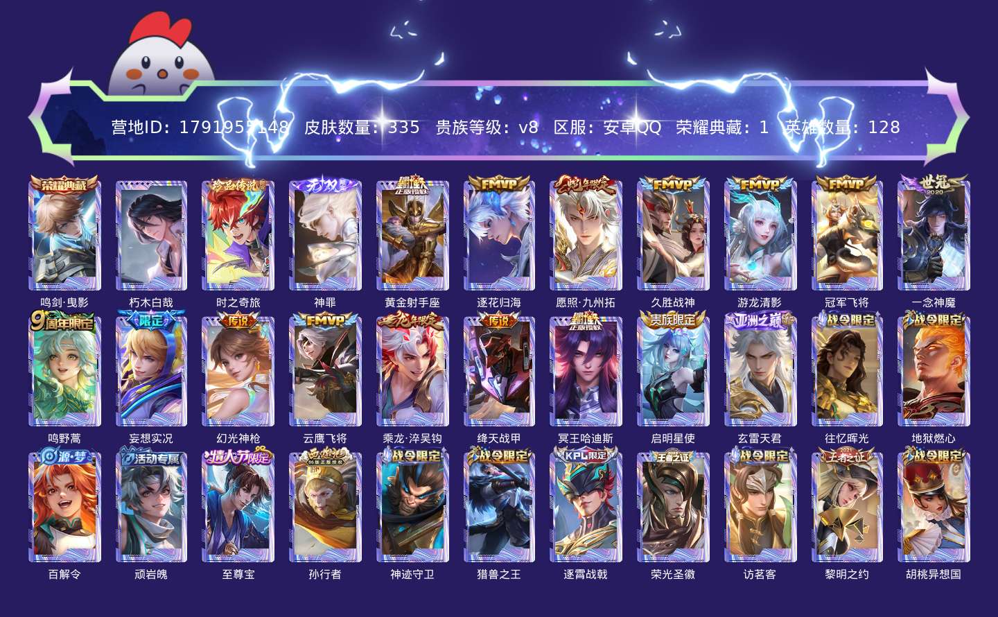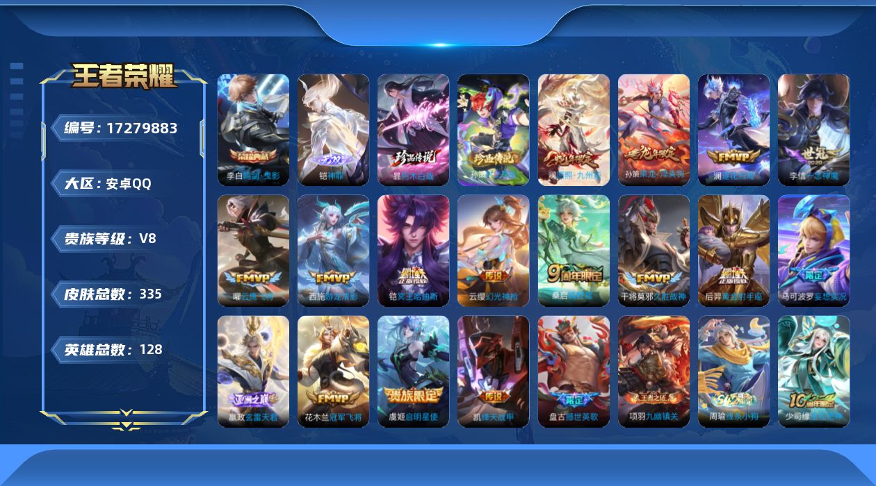 贵族等级:v8皮肤数:335传说品质16 生肖限定5 情人节限定1 珍品传说2 荣耀典藏1 无双1 英雄数:128