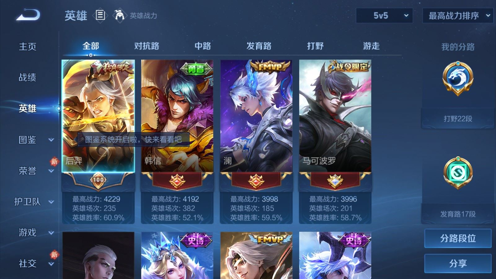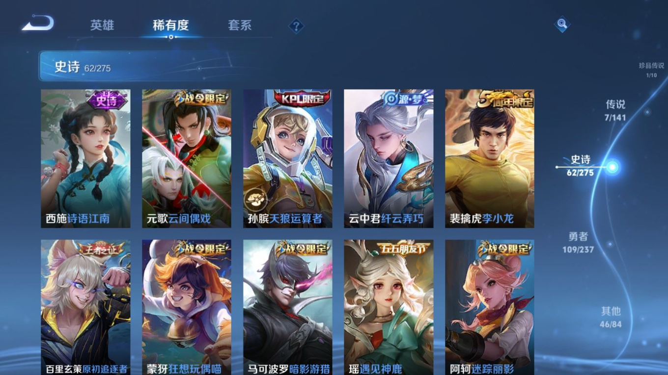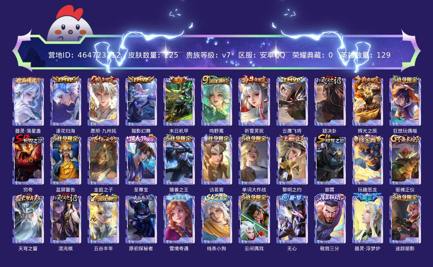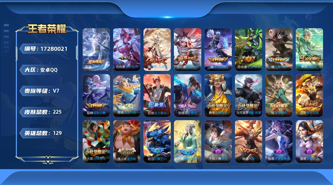 贵族等级:v7皮肤数:225生肖限定4 传说品质7 情人节限定1 珍品传说1 英雄数:129