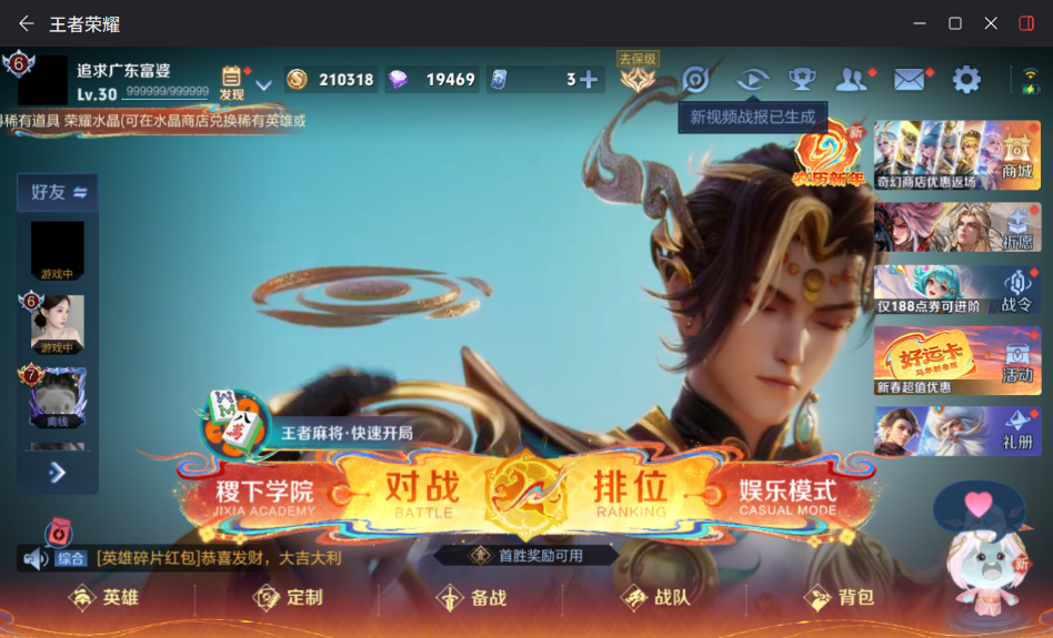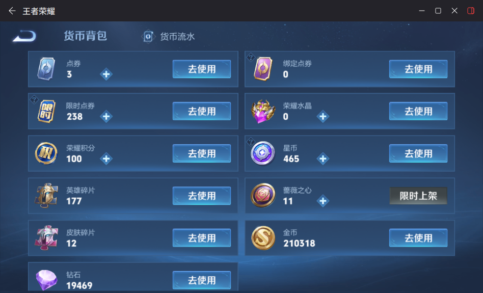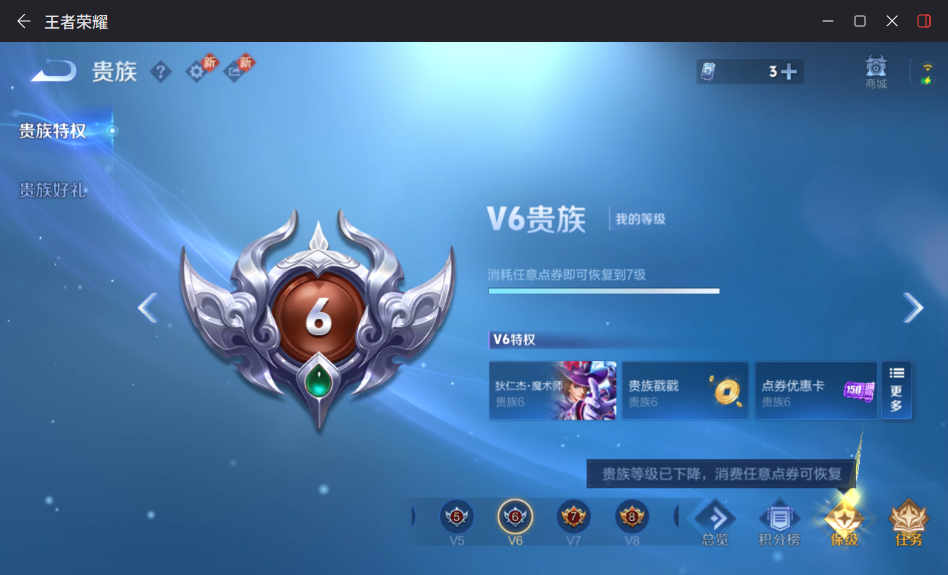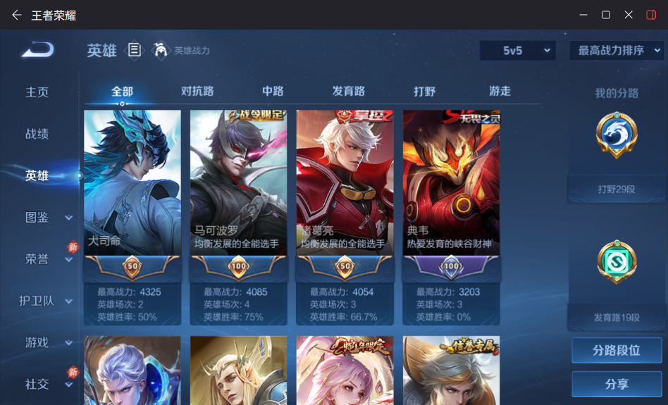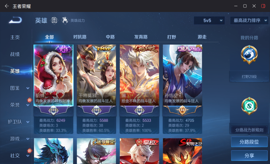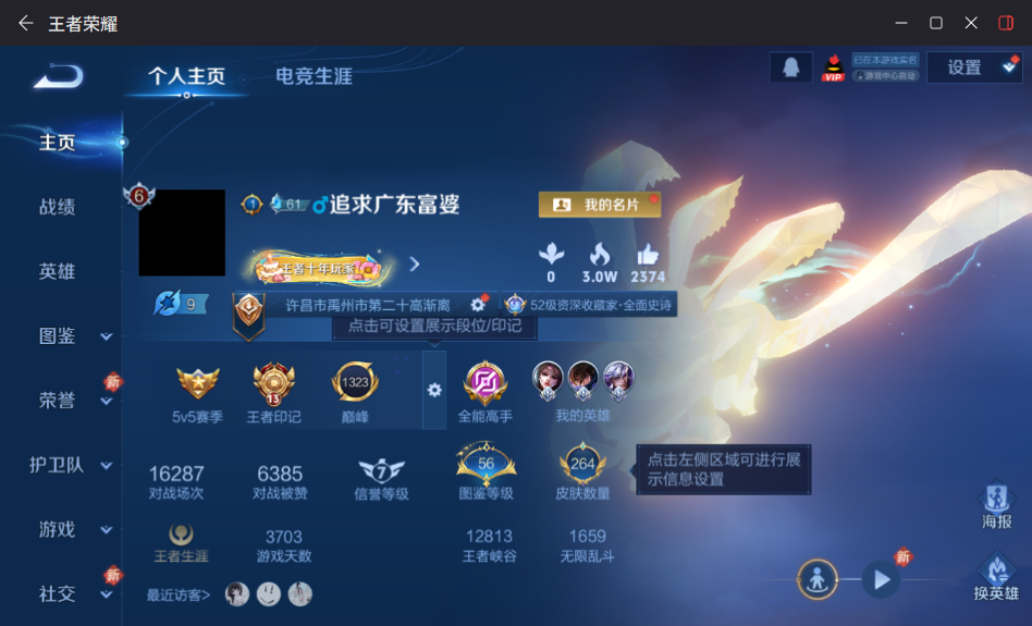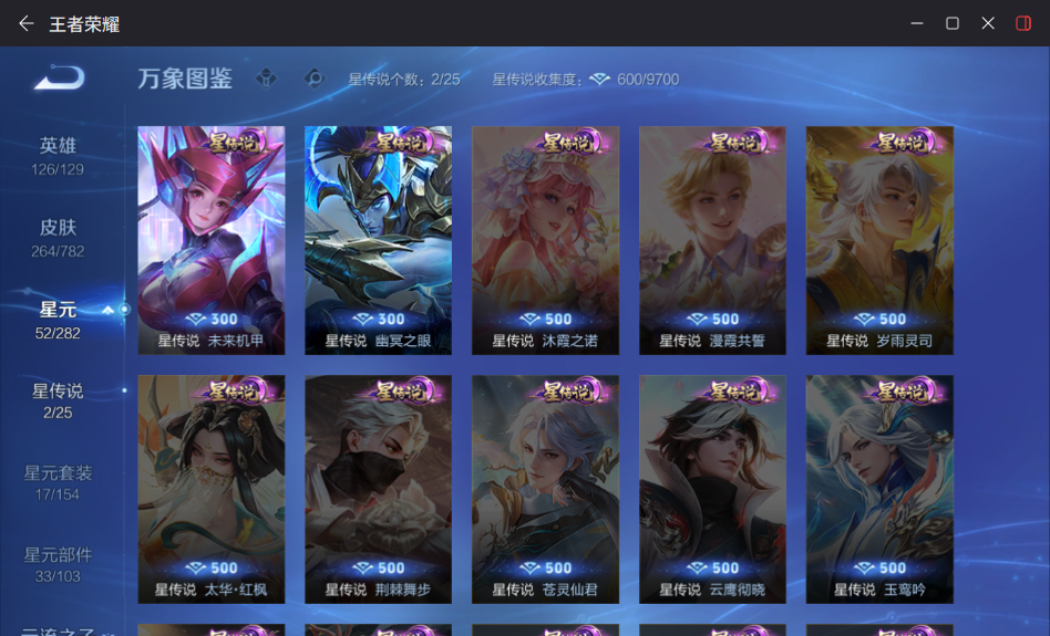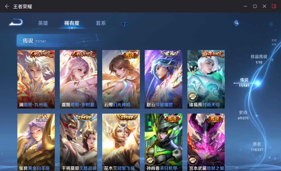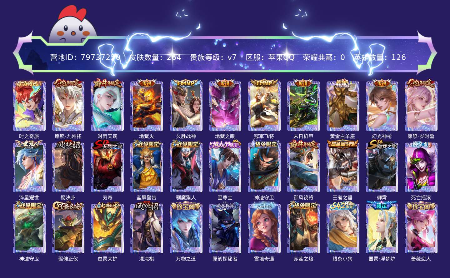 贵族等级:v7皮肤数:264传说品质11 生肖限定7 情人节限定1 珍品传说1 英雄数:126
