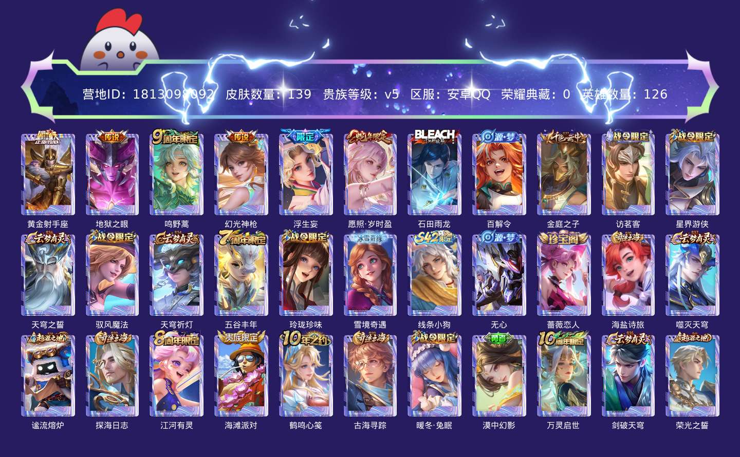 贵族等级:v5皮肤数:139传说品质6 生肖限定1 英雄数:126