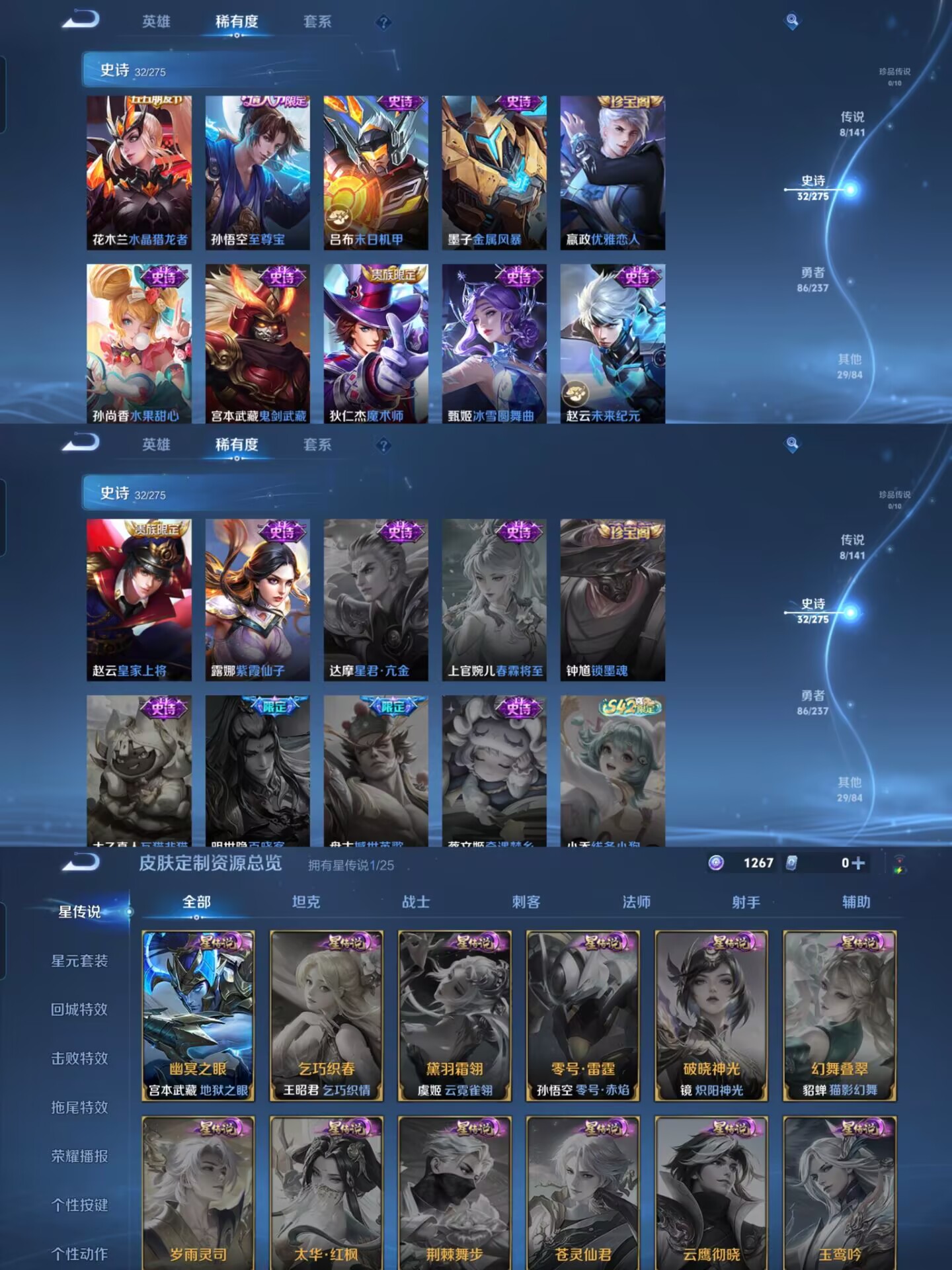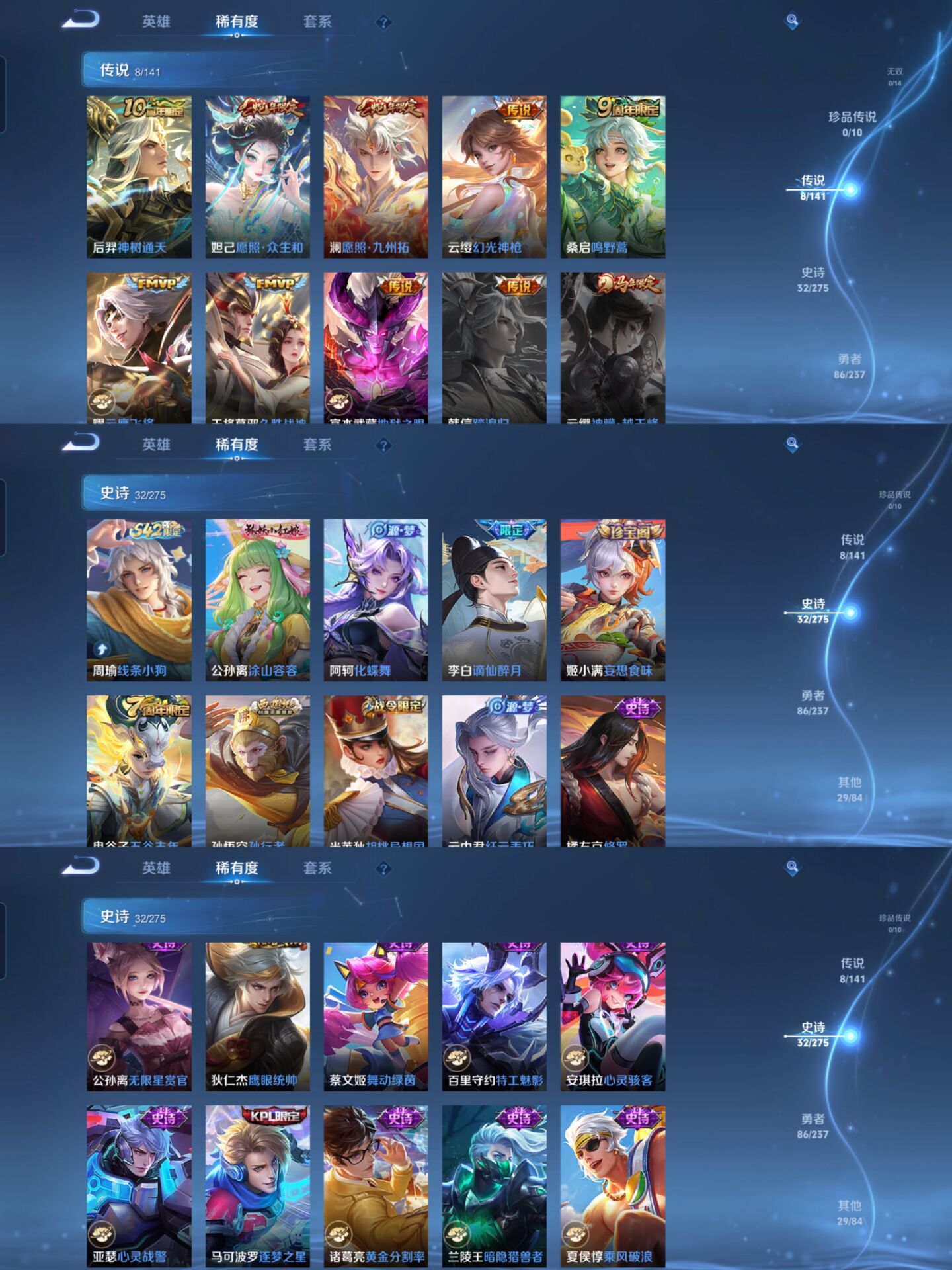 贵族等级:v6皮肤数:156传说品质8 生肖限定2 情人节限定1 荣耀典藏1 英雄数:127