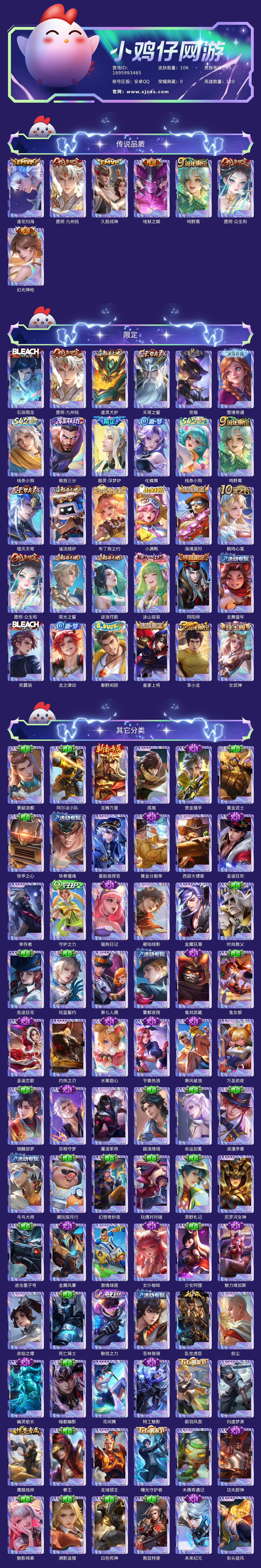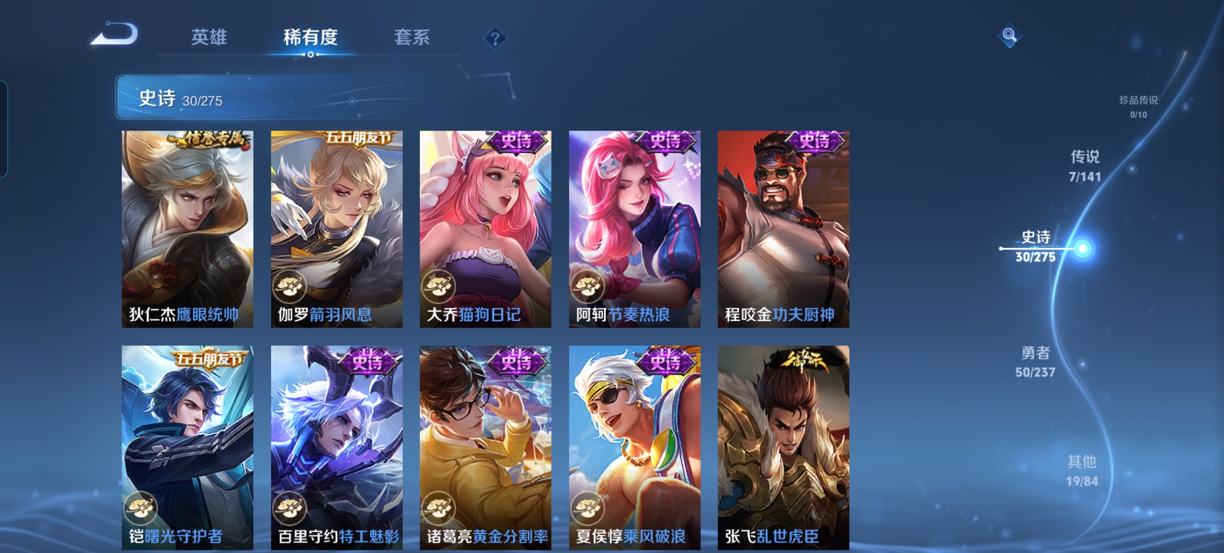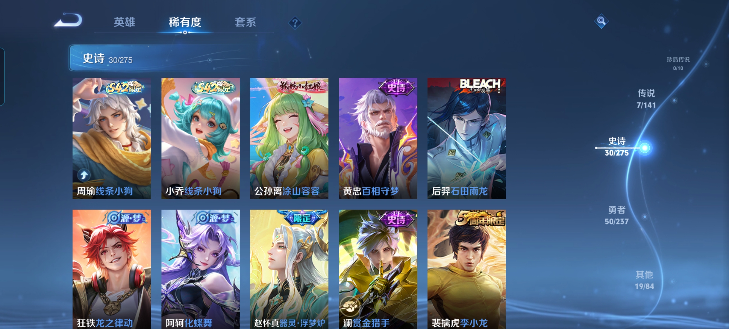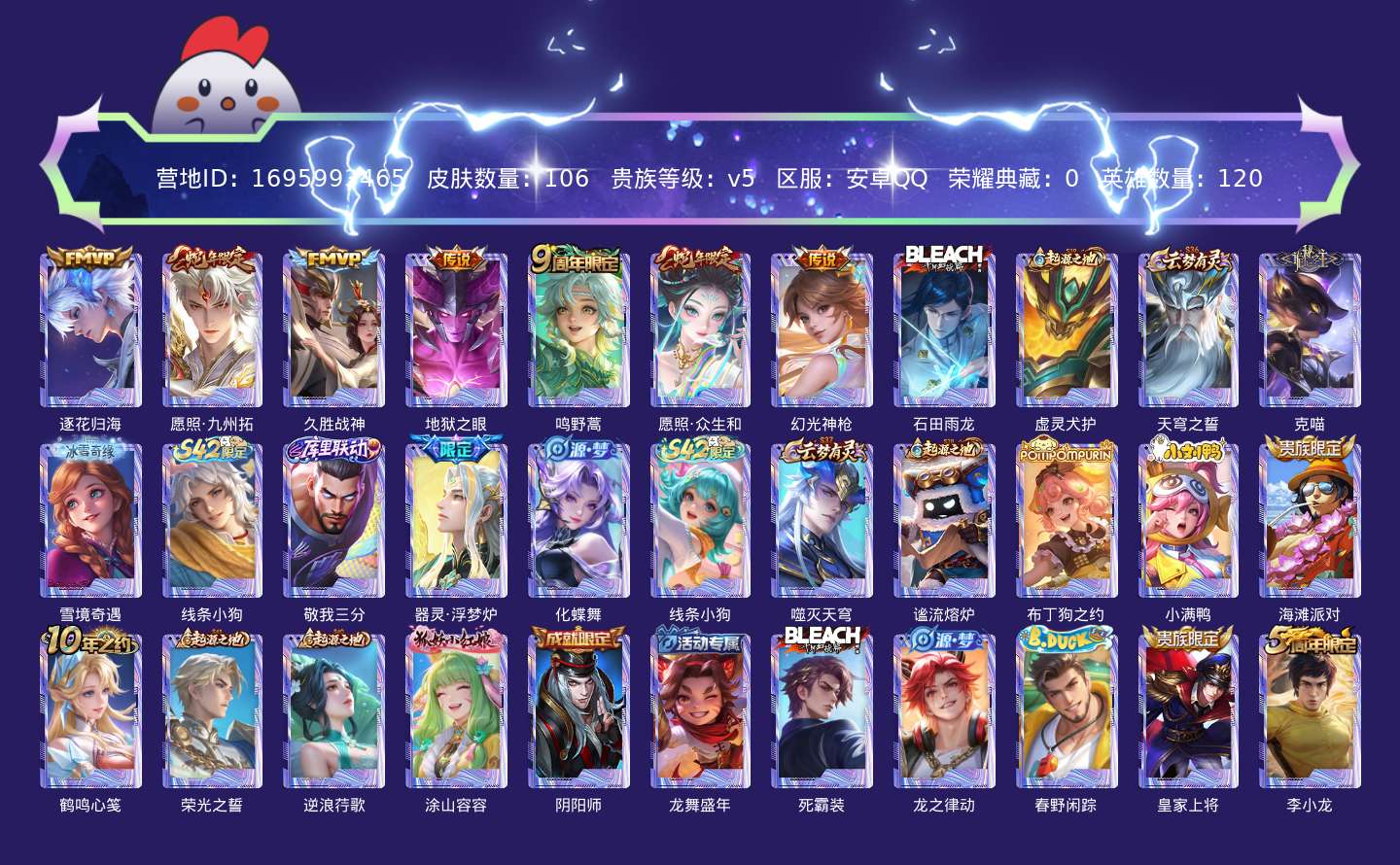 贵族等级:v5皮肤数:106传说品质7 生肖限定2 英雄数:120
