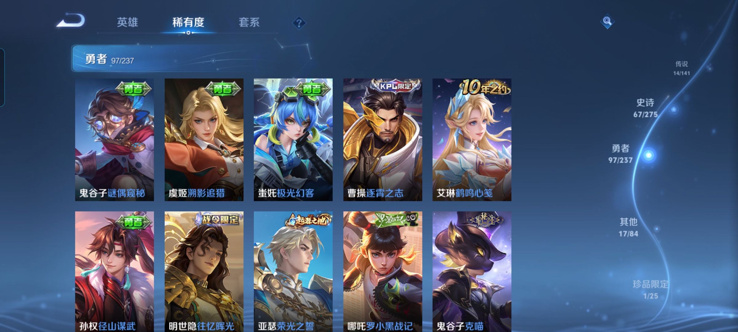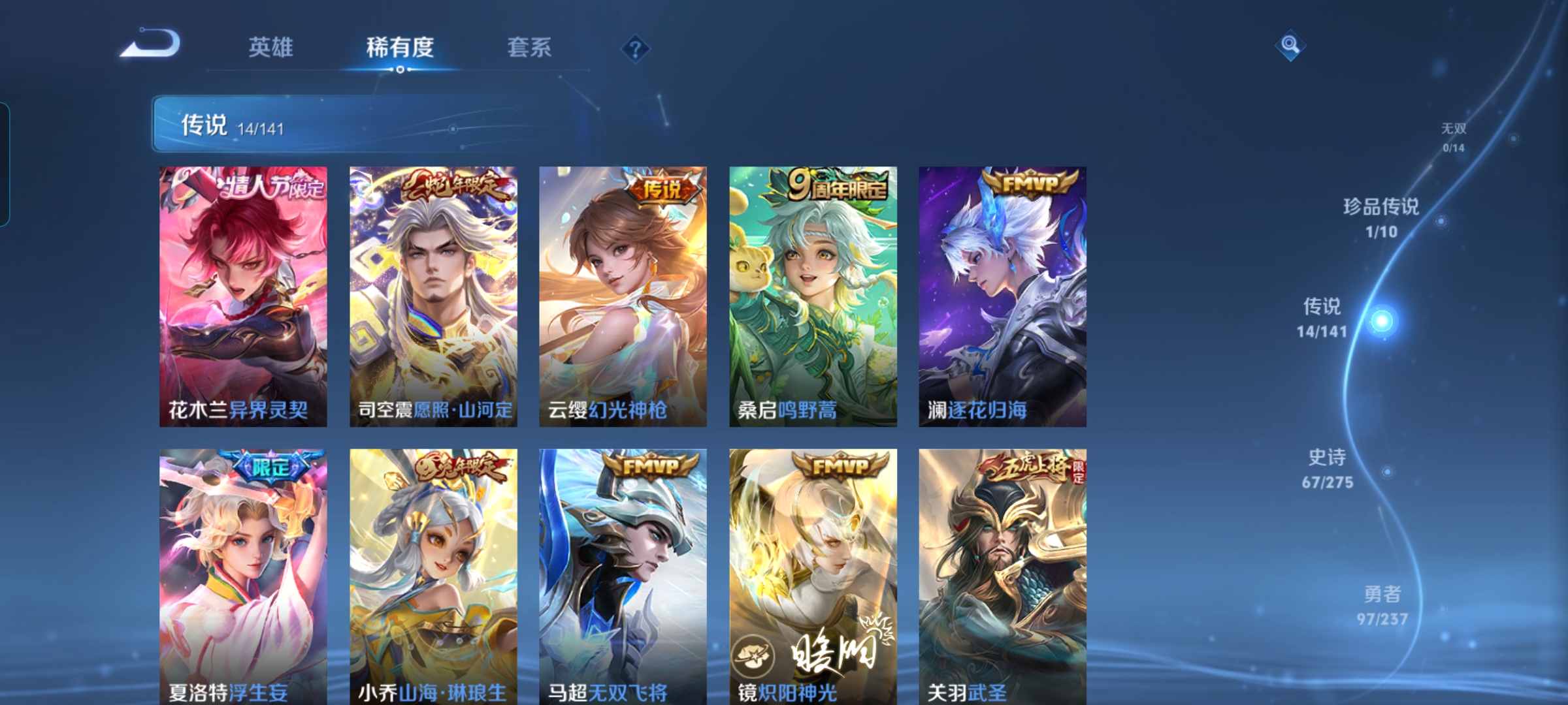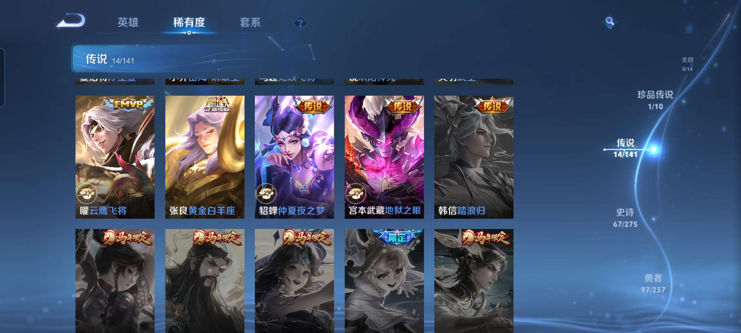 贵族等级:v7皮肤数:197传说品质14 生肖限定2 情人节限定3 珍品传说1 荣耀典藏1 英雄数:127