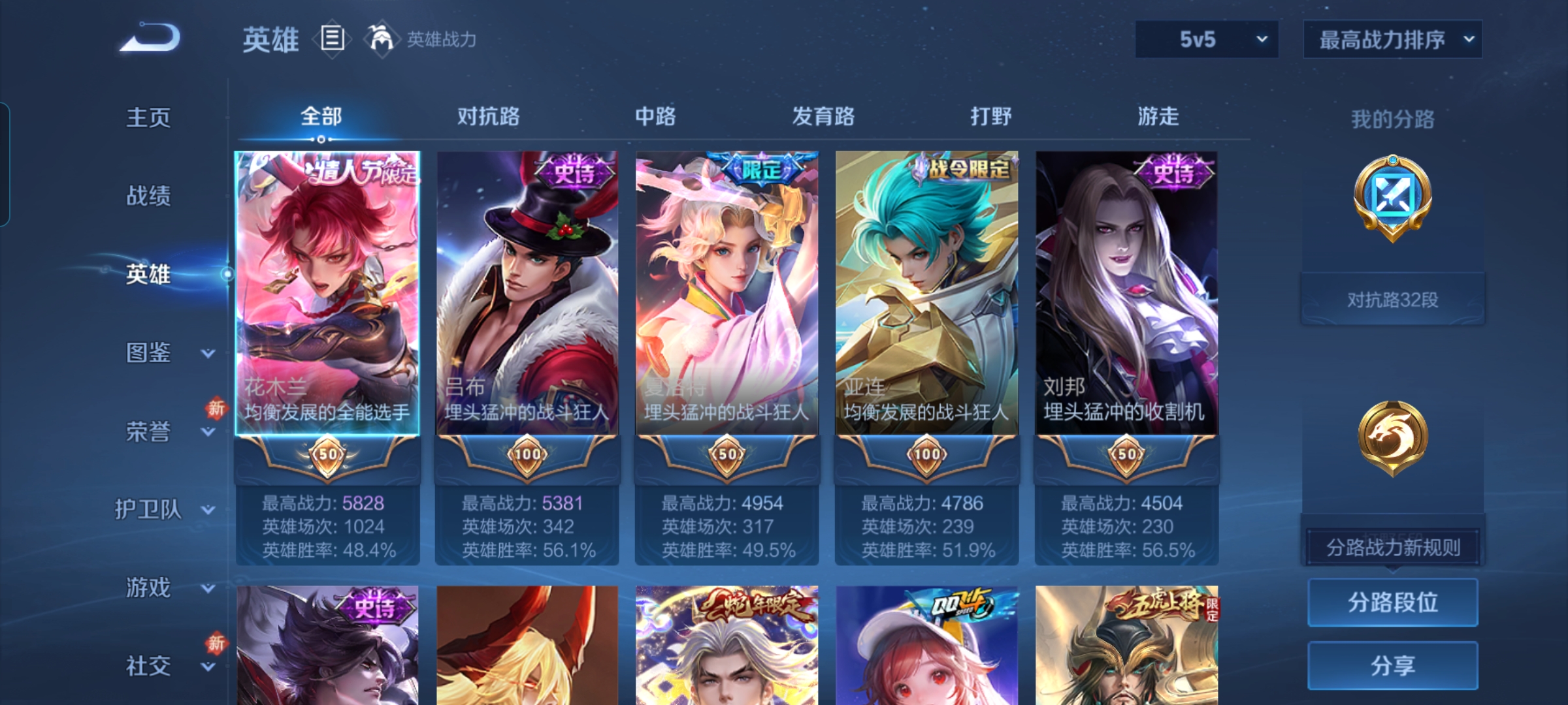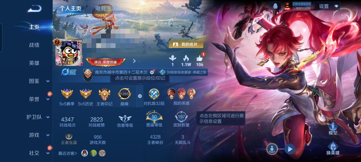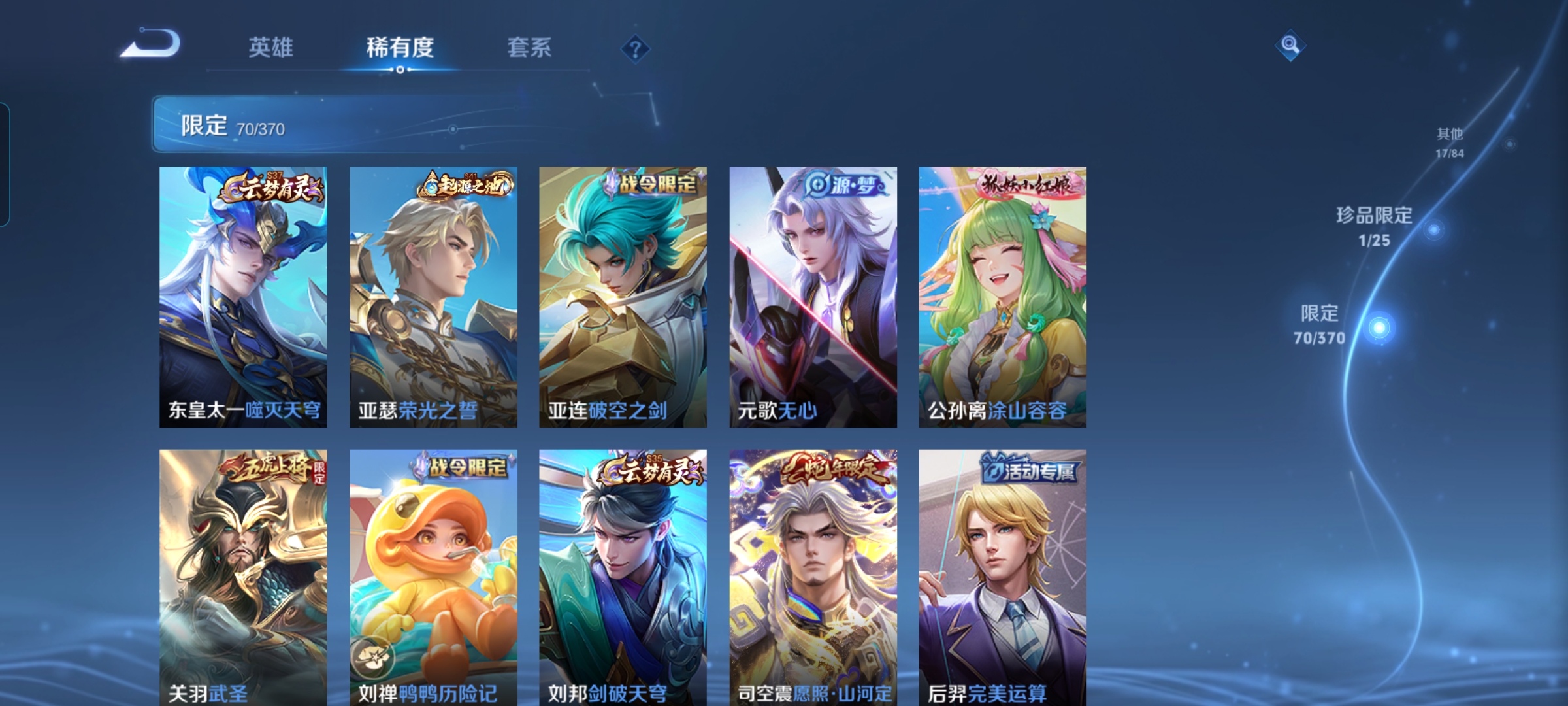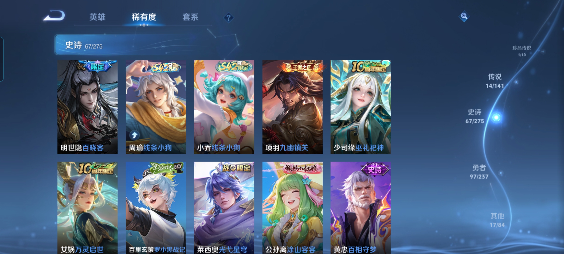 贵族等级:v7皮肤数:197传说品质14 生肖限定2 情人节限定3 珍品传说1 荣耀典藏1 英雄数:127