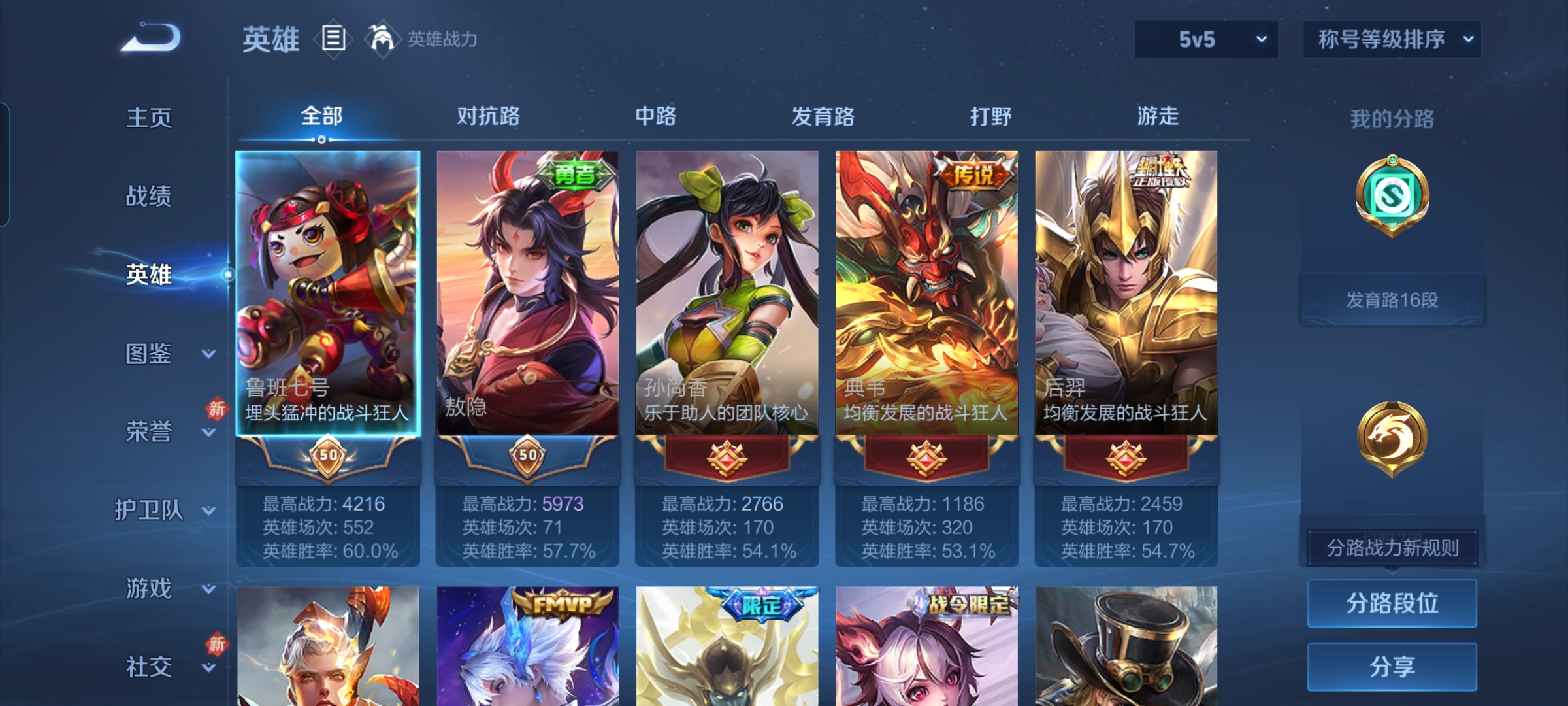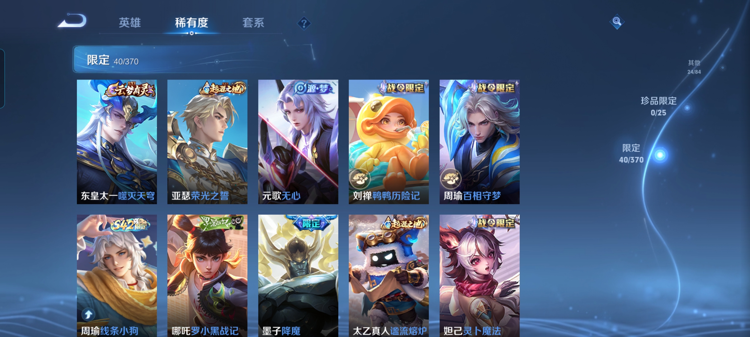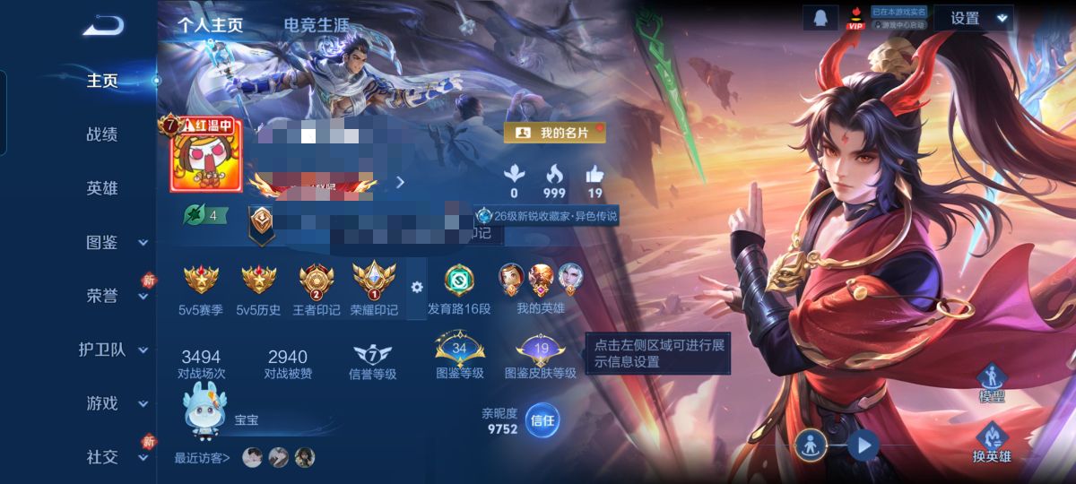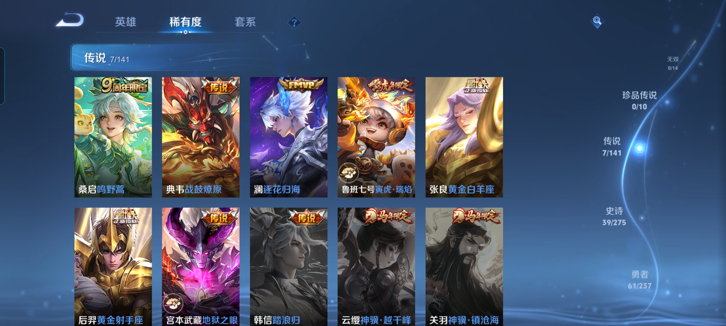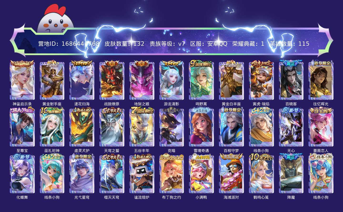 贵族等级:v7皮肤数:133传说品质8 情人节限定1 生肖限定1 荣耀典藏1 英雄数:115