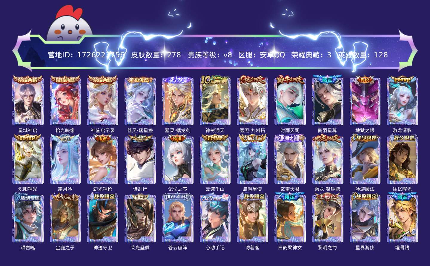 贵族等级:v8皮肤数:278传说品质15 生肖限定4 荣耀典藏3 珍品传说1 无双1 英雄数:128