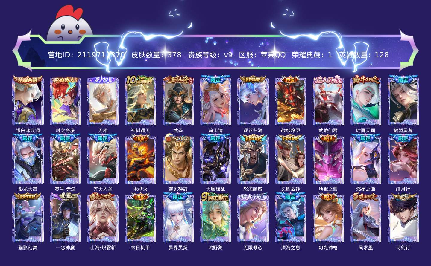 贵族等级:v9皮肤数:379情人节限定8 传说品质45 生肖限定18 无双1 珍品传说1 荣耀典藏1 英雄数:128