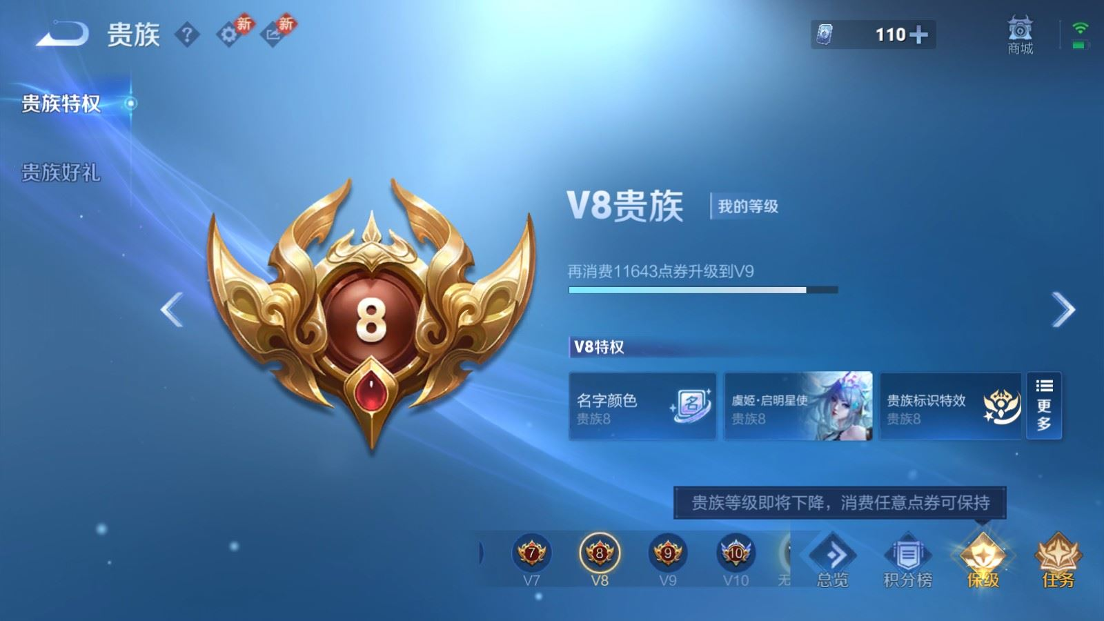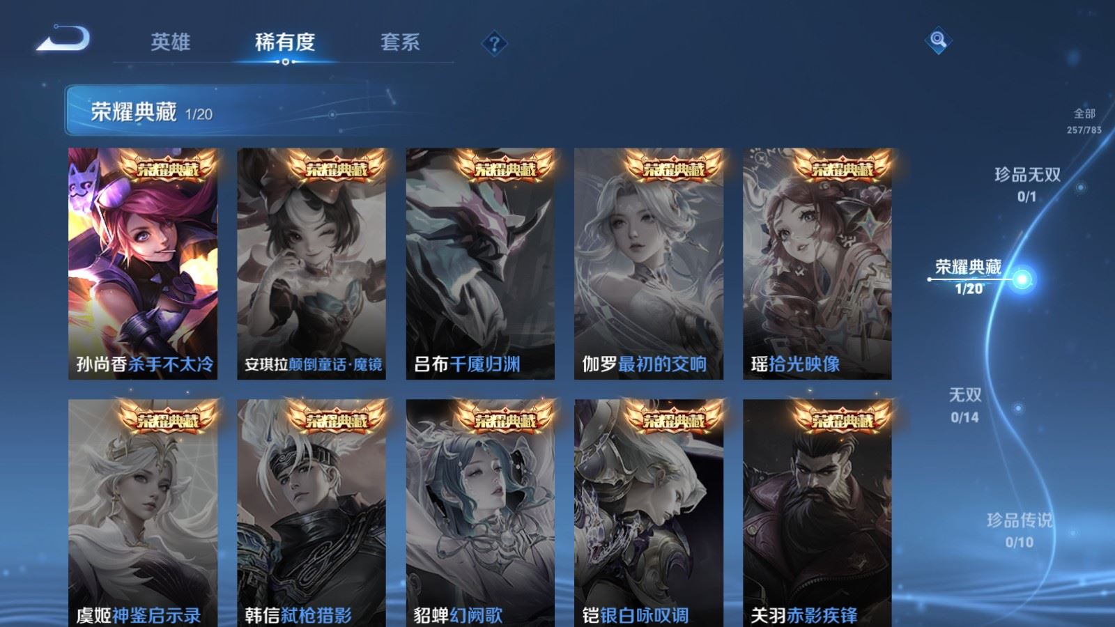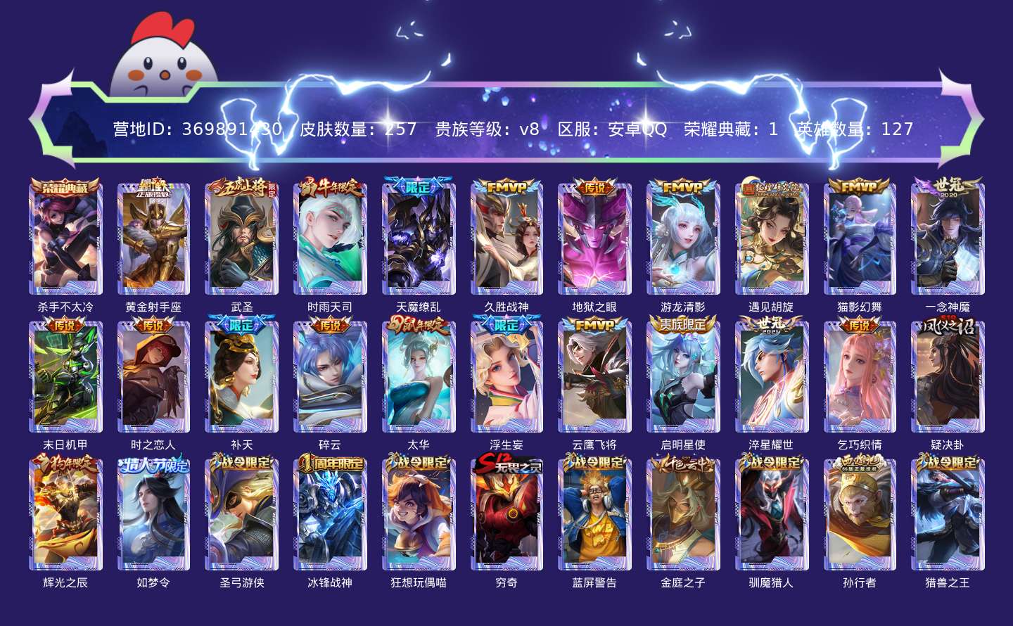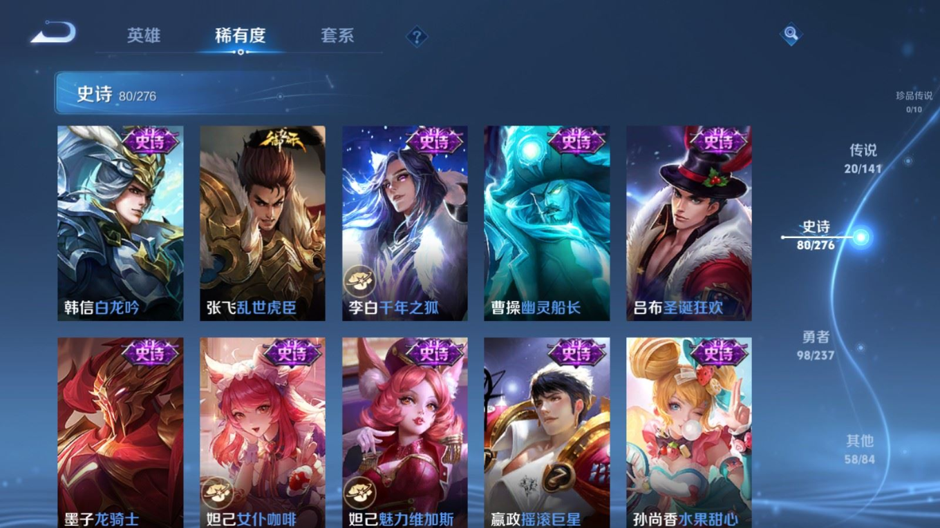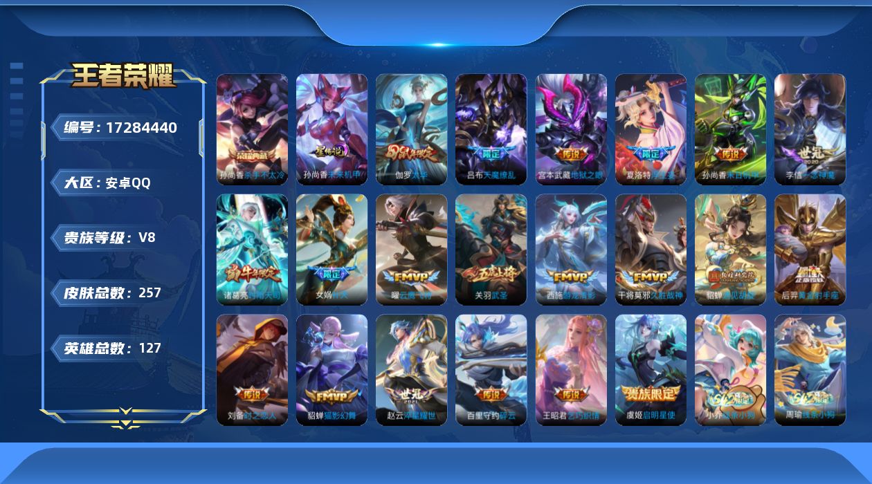 贵族等级:v8皮肤数:257生肖限定3 传说品质20 情人节限定2 荣耀典藏1 英雄数:127