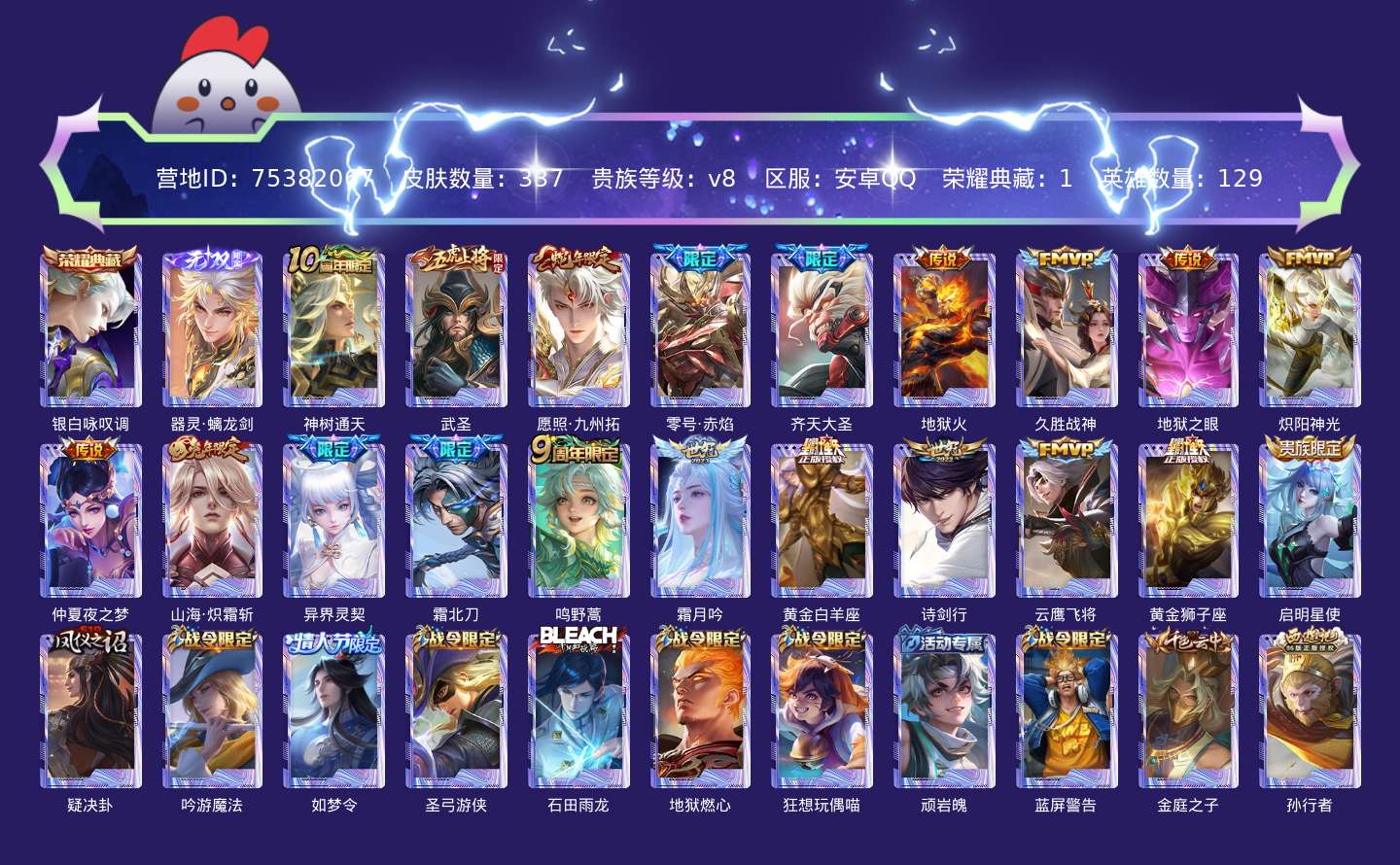 贵族等级:v8皮肤数:337情人节限定1 传说品质20 生肖限定3 无双1 荣耀典藏1 英雄数:129