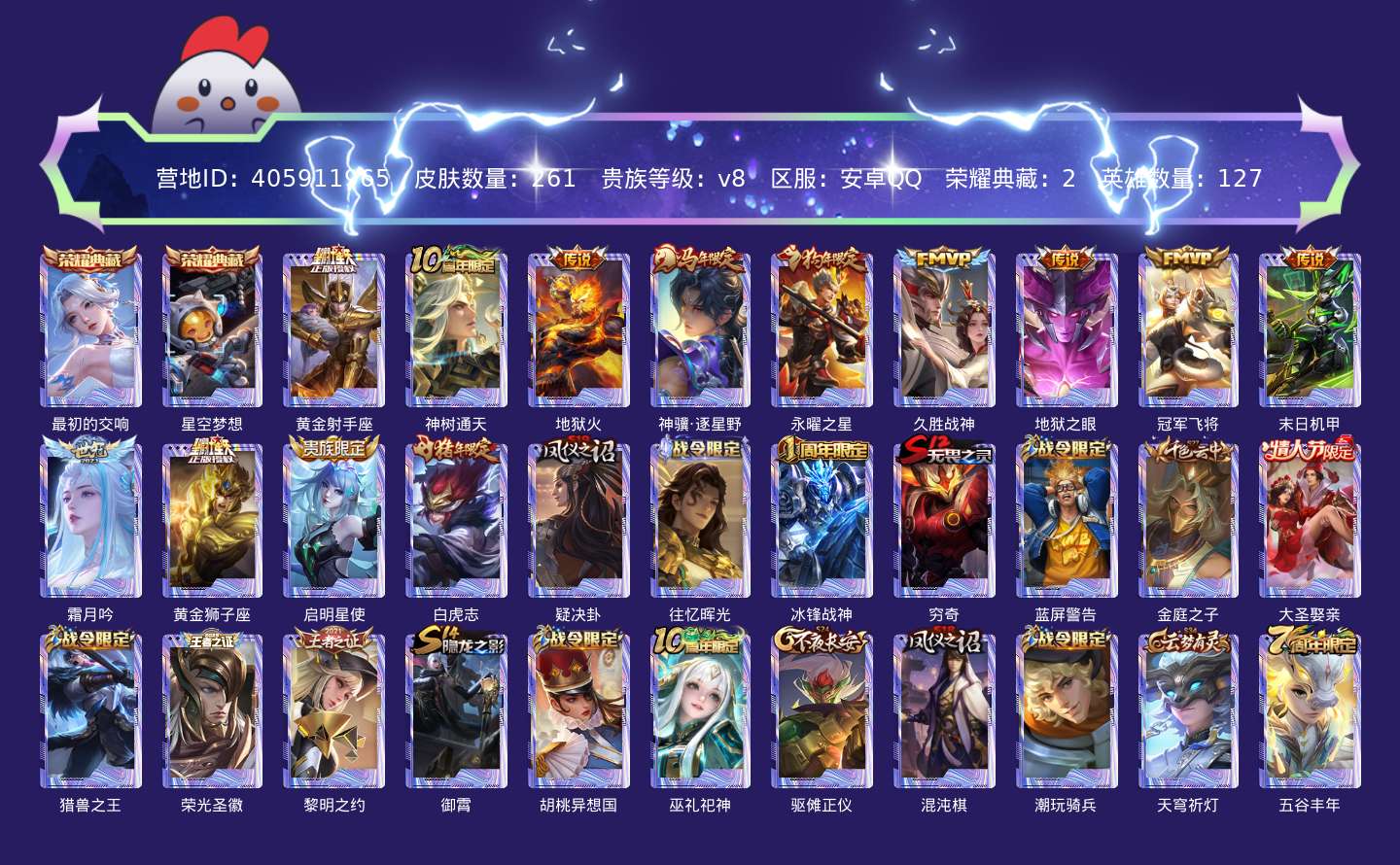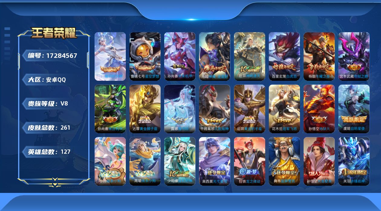 贵族等级:v8皮肤数:261传说品质13 情人节限定1 生肖限定4 荣耀典藏2 英雄数:127