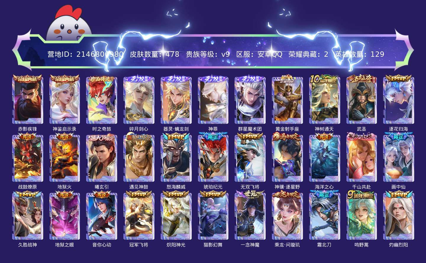 贵族等级:v9皮肤数:478生肖限定15 传说品质42 情人节限定4 荣耀典藏2 无双4 珍品传说1 英雄数:129