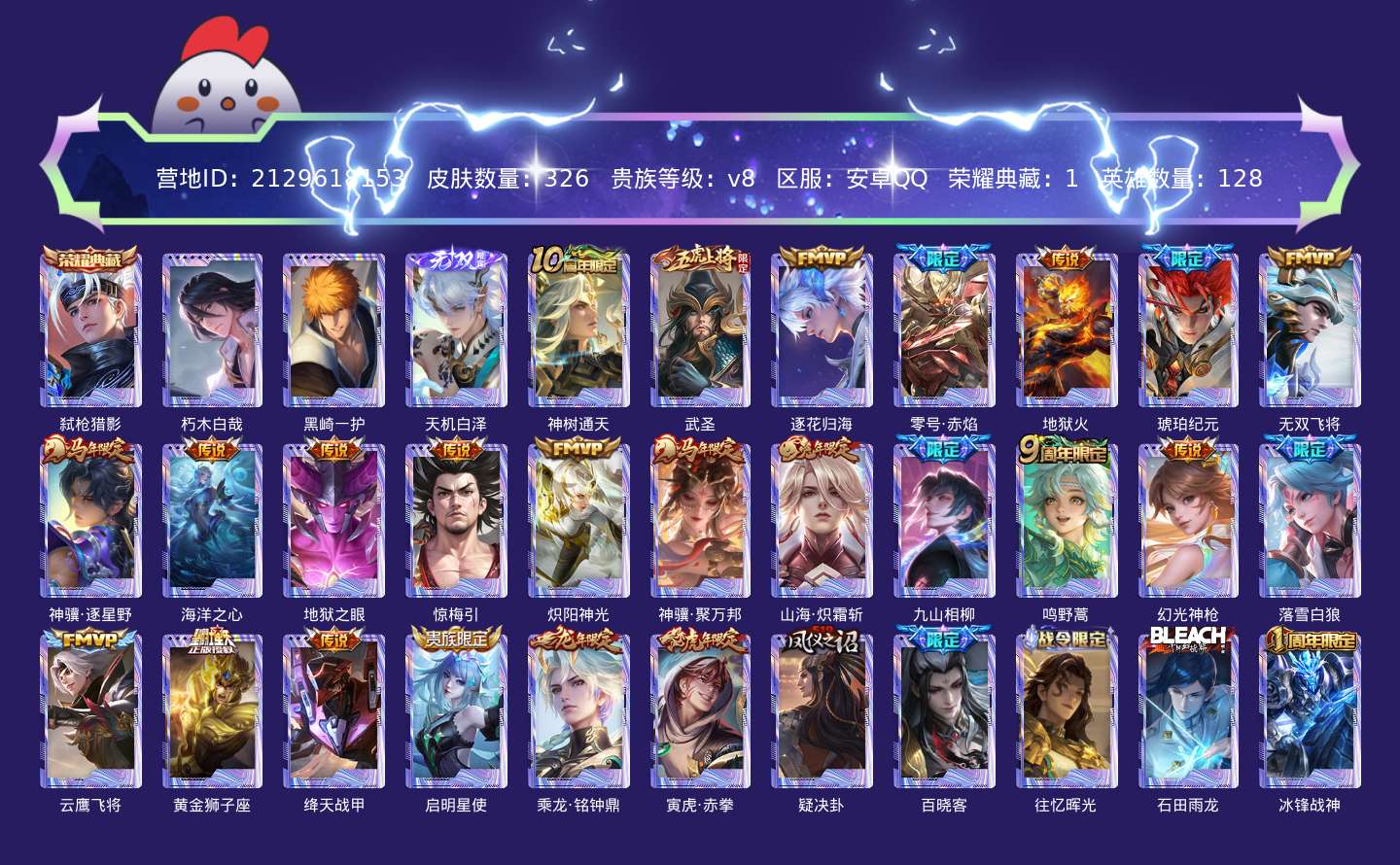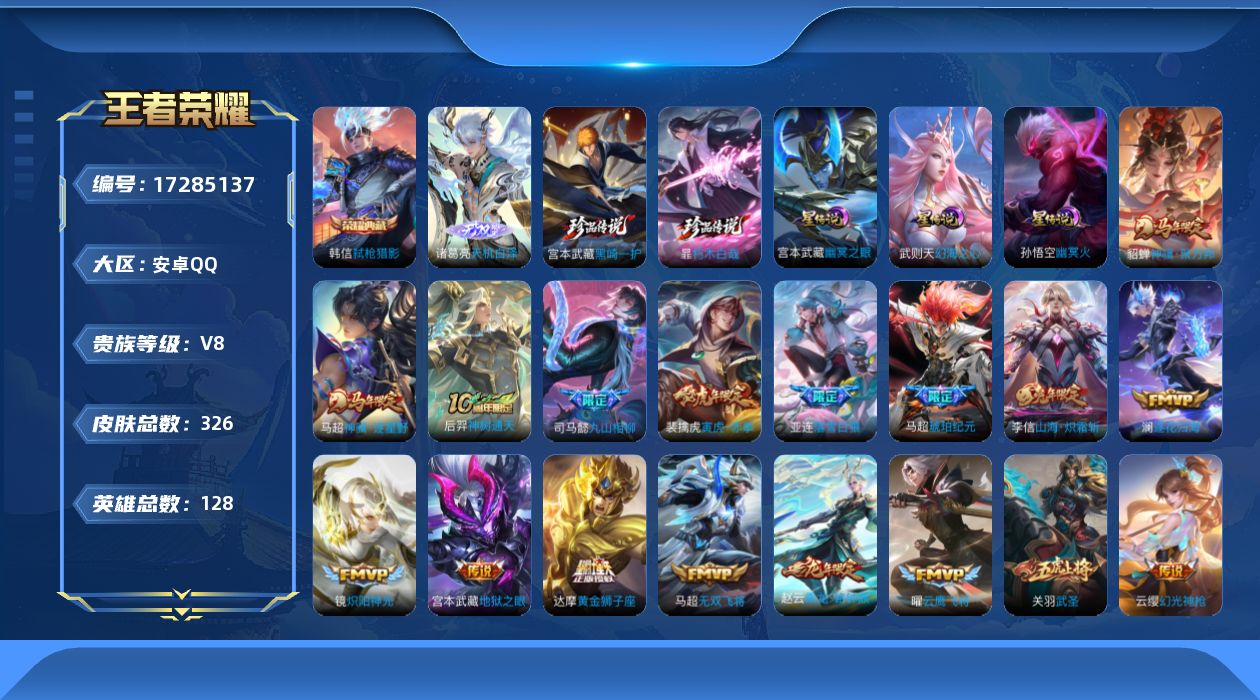 贵族等级:v8皮肤数:326传说品质24 无双1 情人节限定2 生肖限定5 珍品传说2 荣耀典藏1 英雄数:128