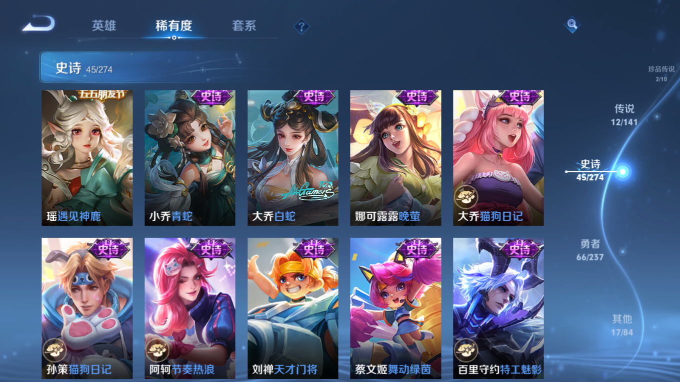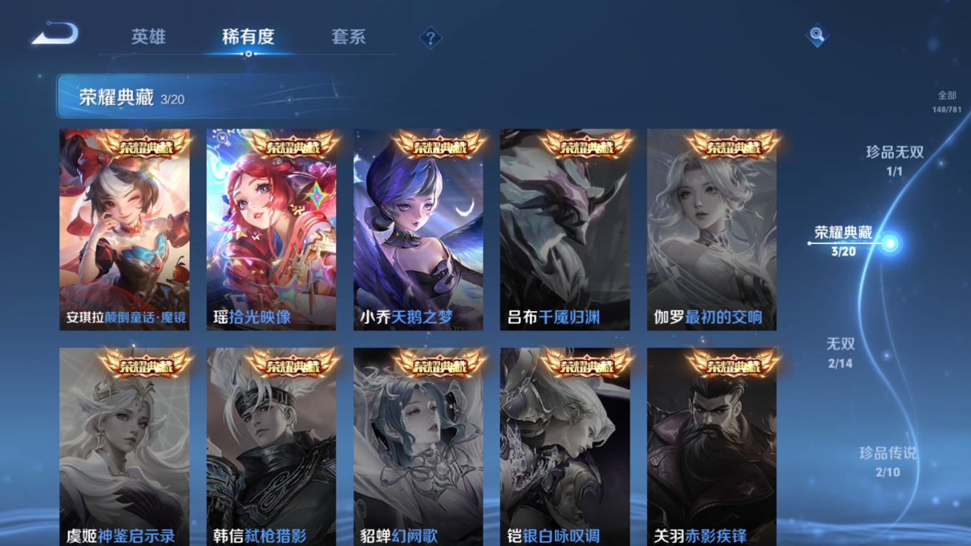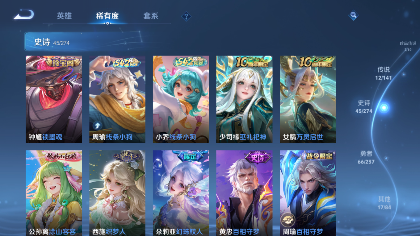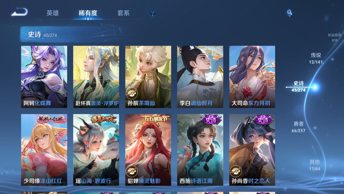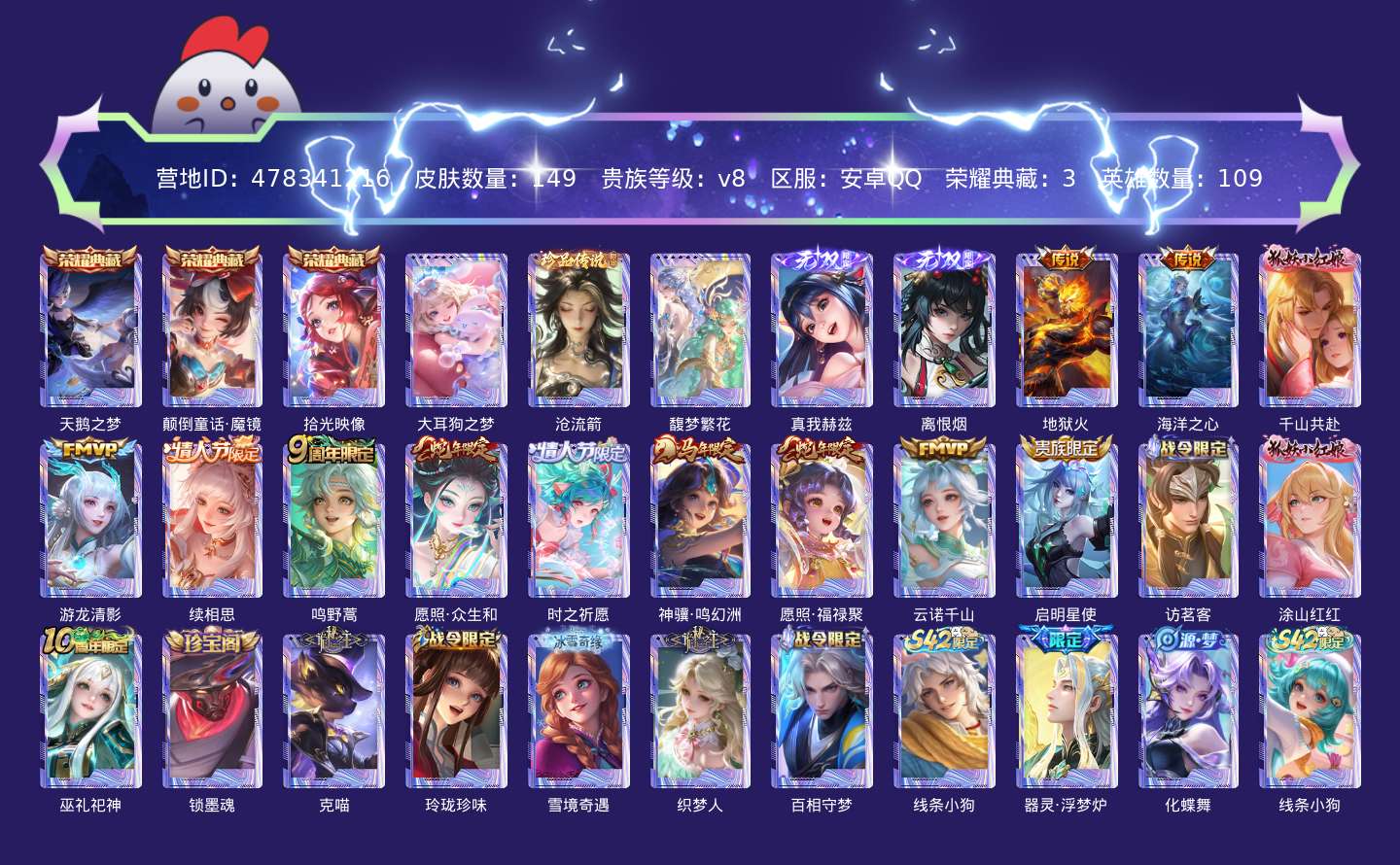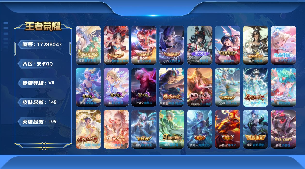 贵族等级:v8皮肤数:149传说品质12 情人节限定2 珍品无双1 荣耀典藏3 生肖限定4 无双2 珍品传说2 英雄数:109