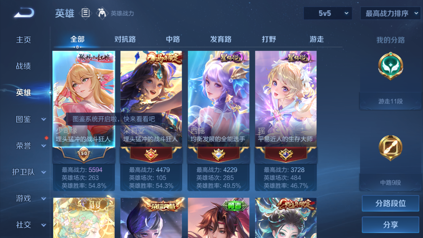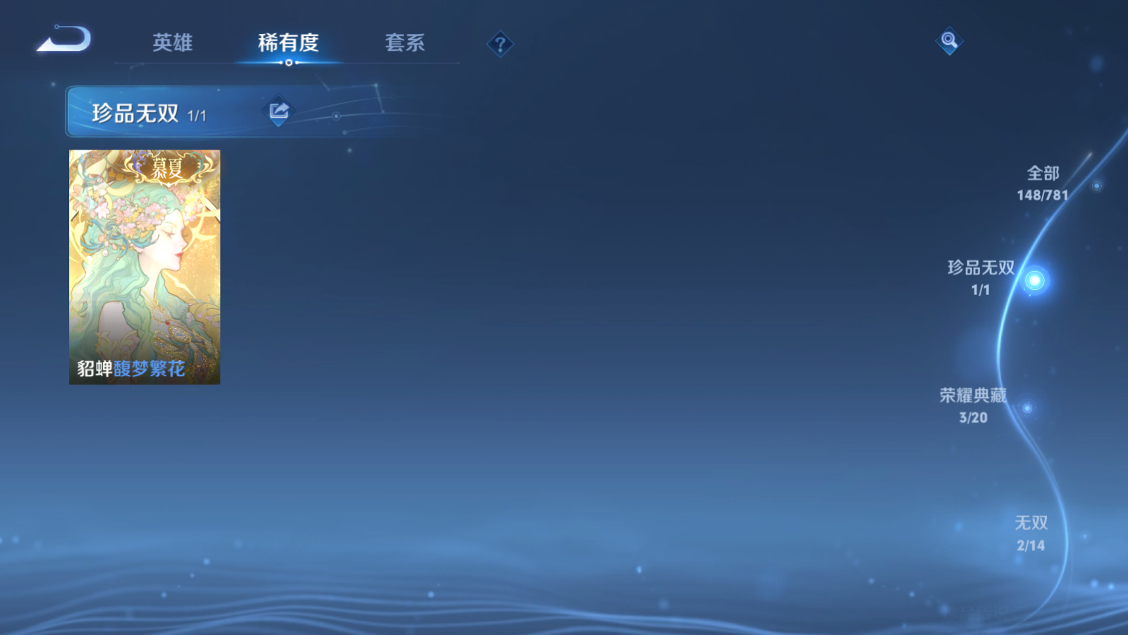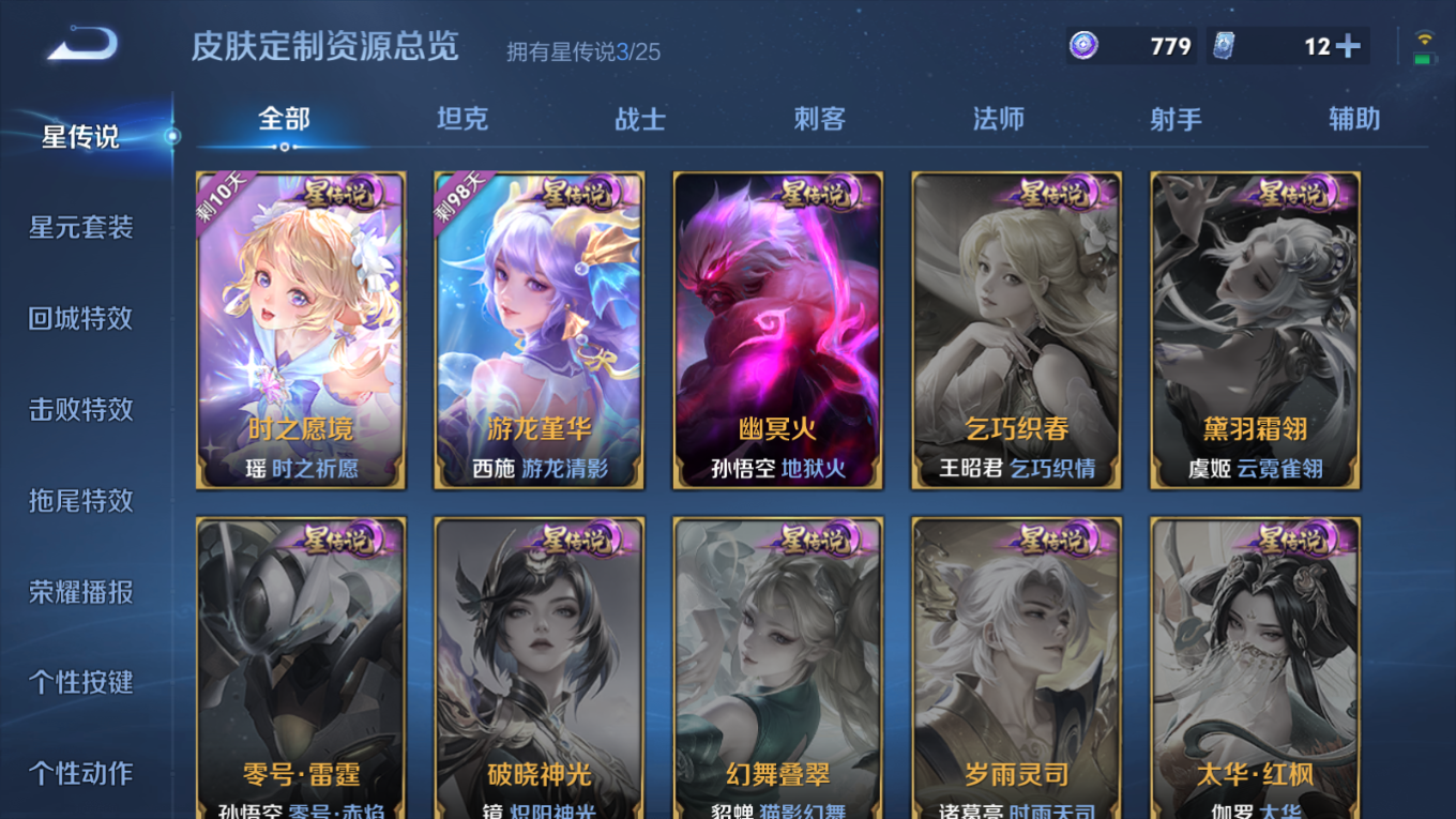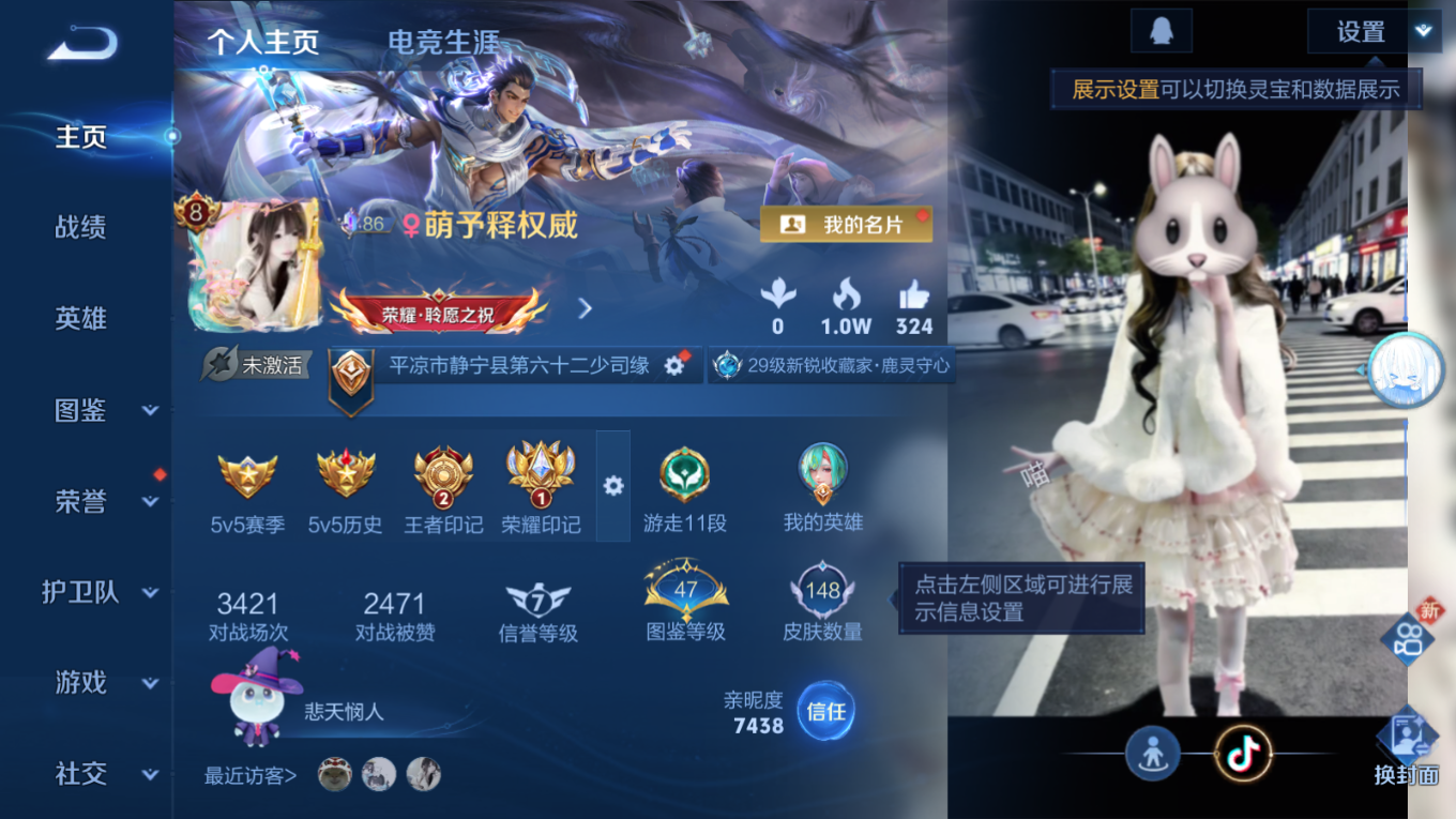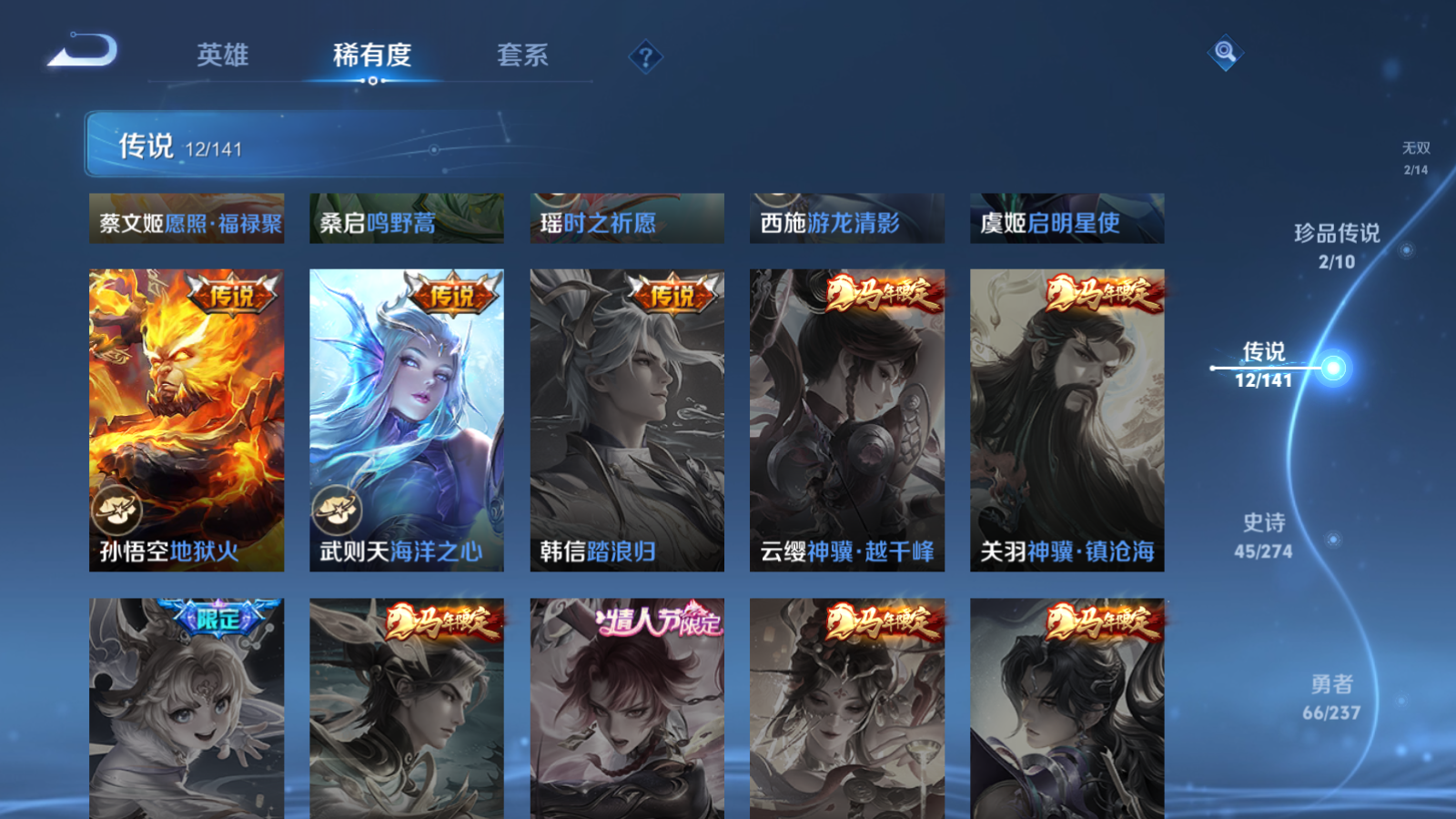 贵族等级:v8皮肤数:149传说品质12 情人节限定2 珍品无双1 荣耀典藏3 生肖限定4 无双2 珍品传说2 英雄数:109