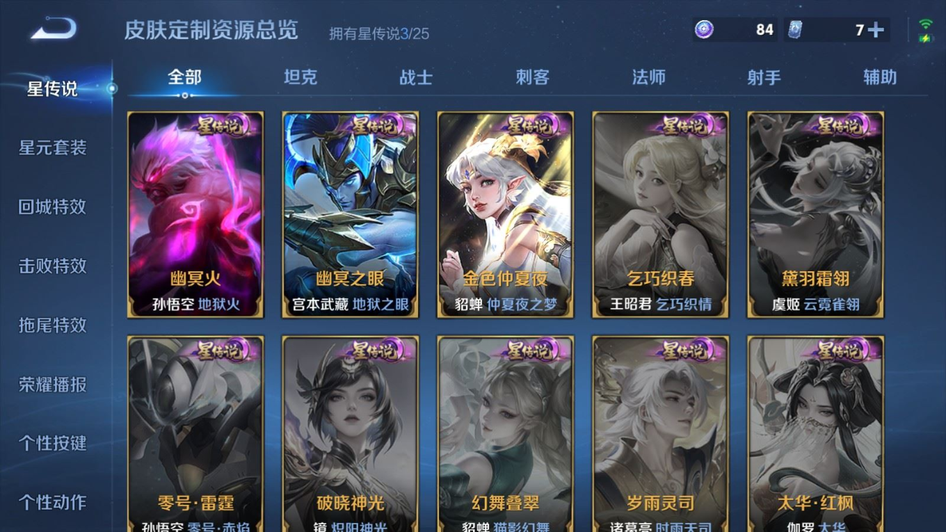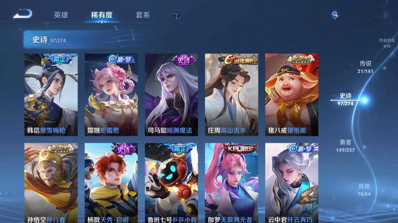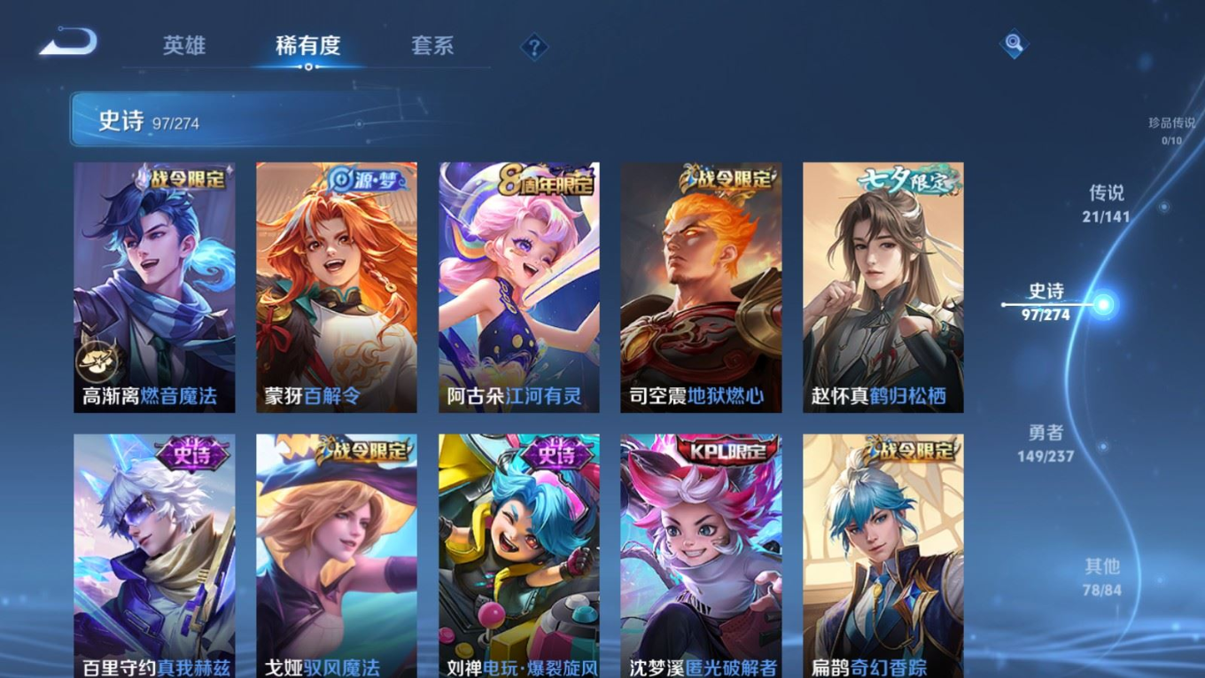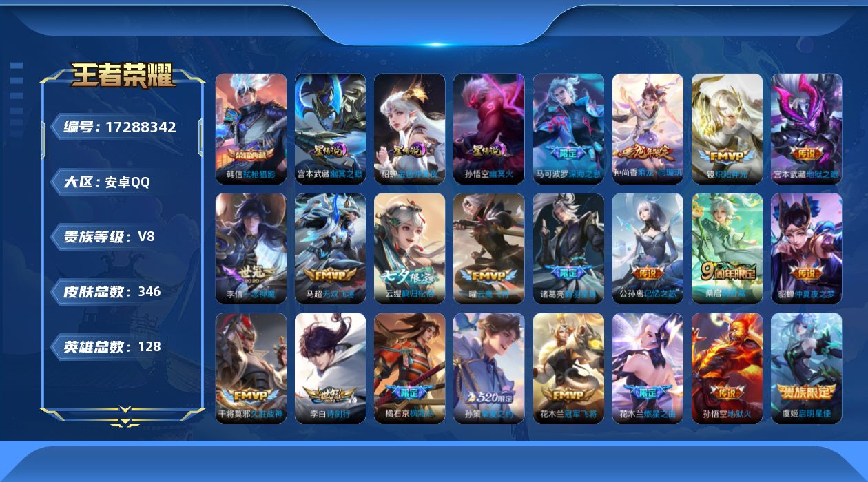 贵族等级:v8皮肤数:346生肖限定3 传说品质21 情人节限定1 荣耀典藏1 英雄数:128