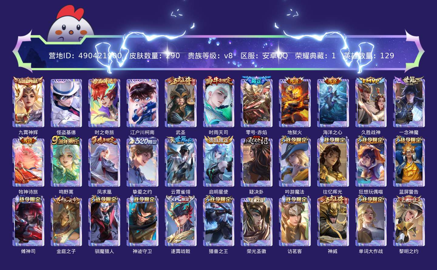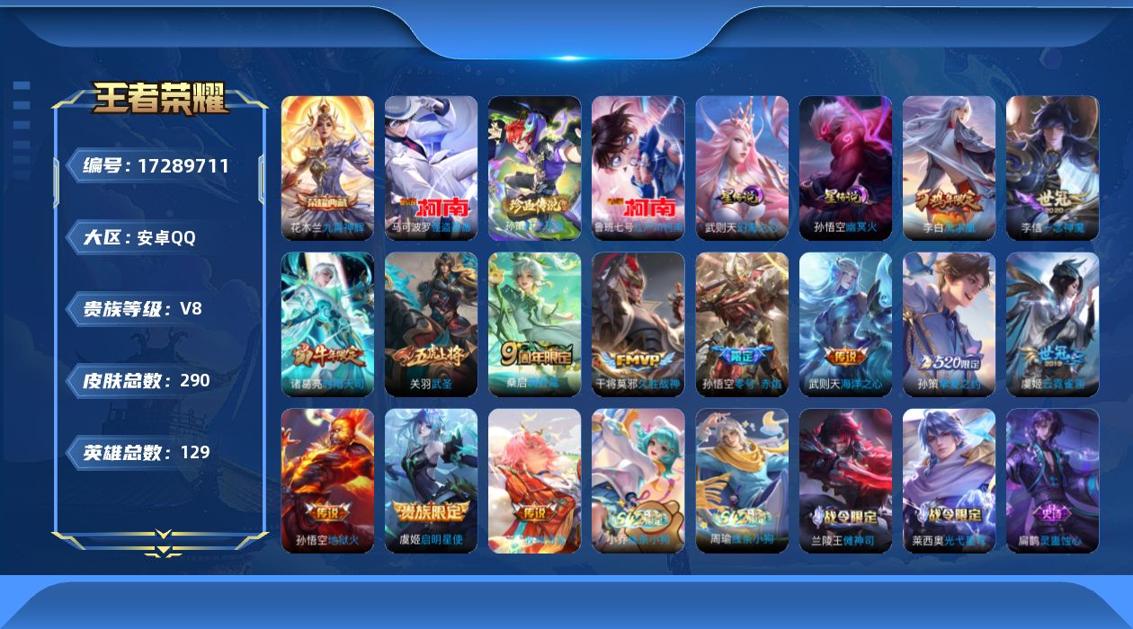 贵族等级:v8皮肤数:290传说品质13 生肖限定3 荣耀典藏1 珍品传说3 英雄数:129