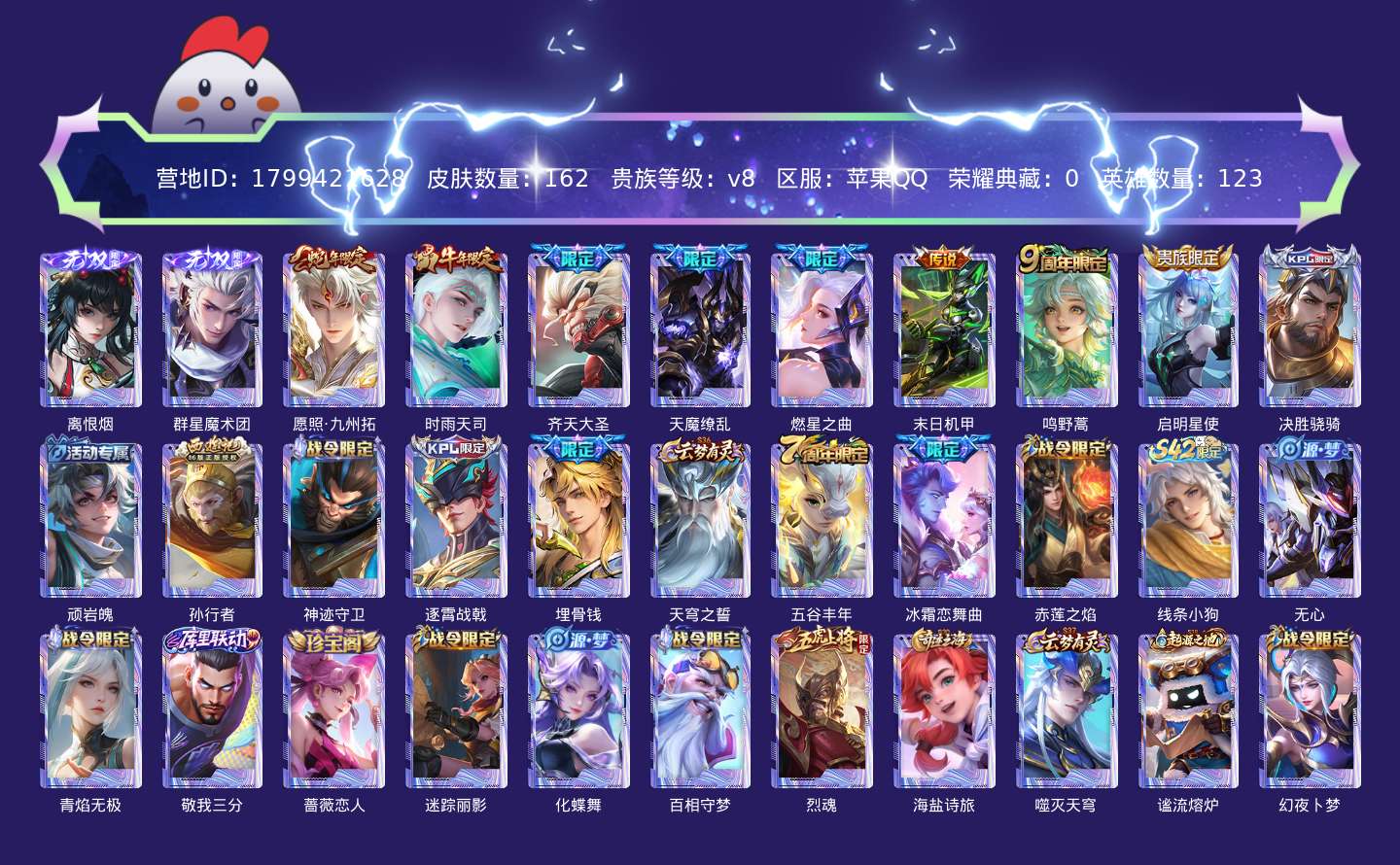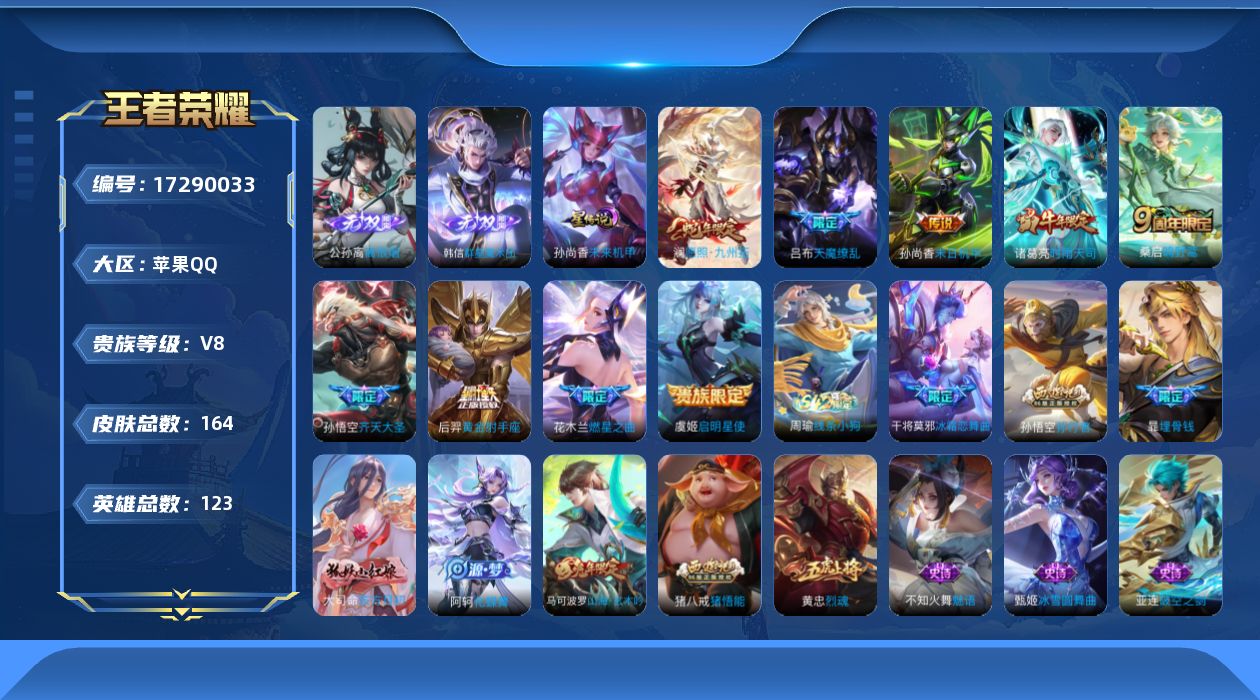 贵族等级:v8皮肤数:164传说品质9 生肖限定3 无双2 英雄数:123