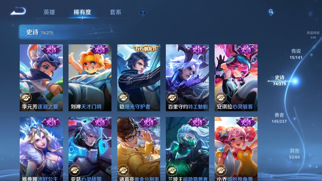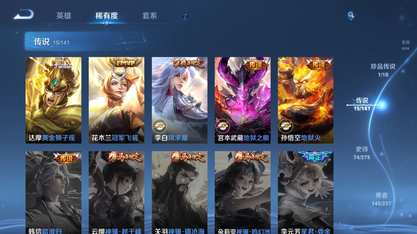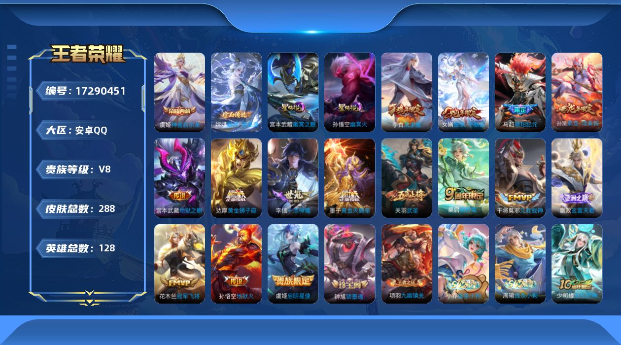 贵族等级:v8皮肤数:288传说品质15 生肖限定4 情人节限定1 珍品传说1 荣耀典藏1 英雄数:128