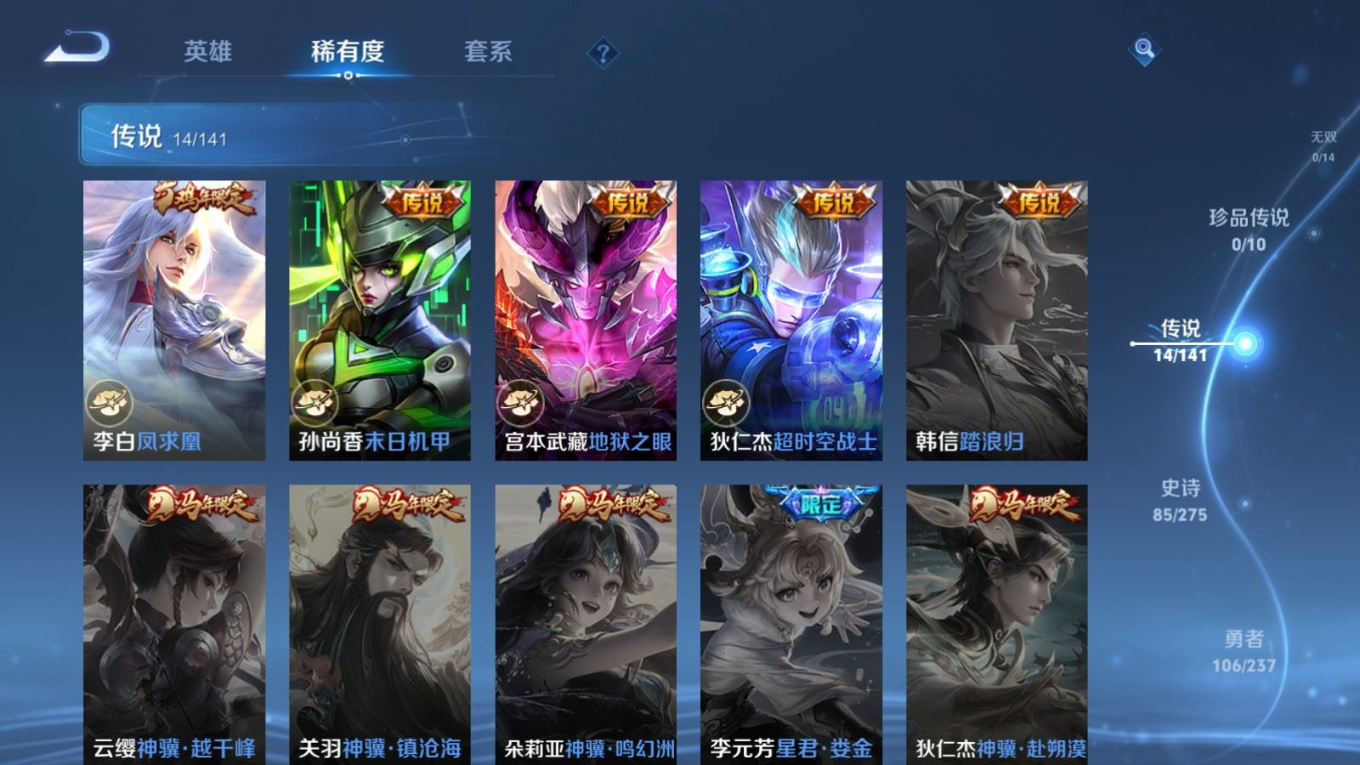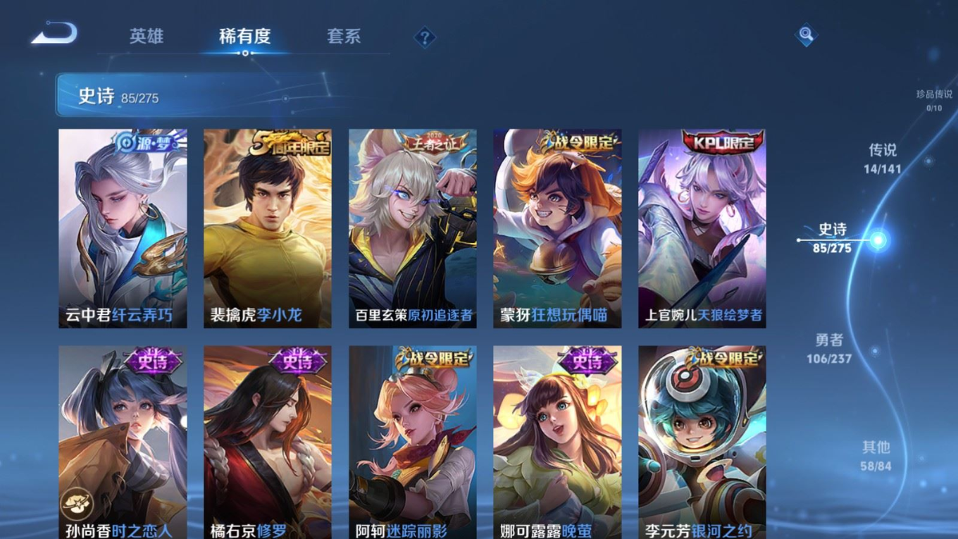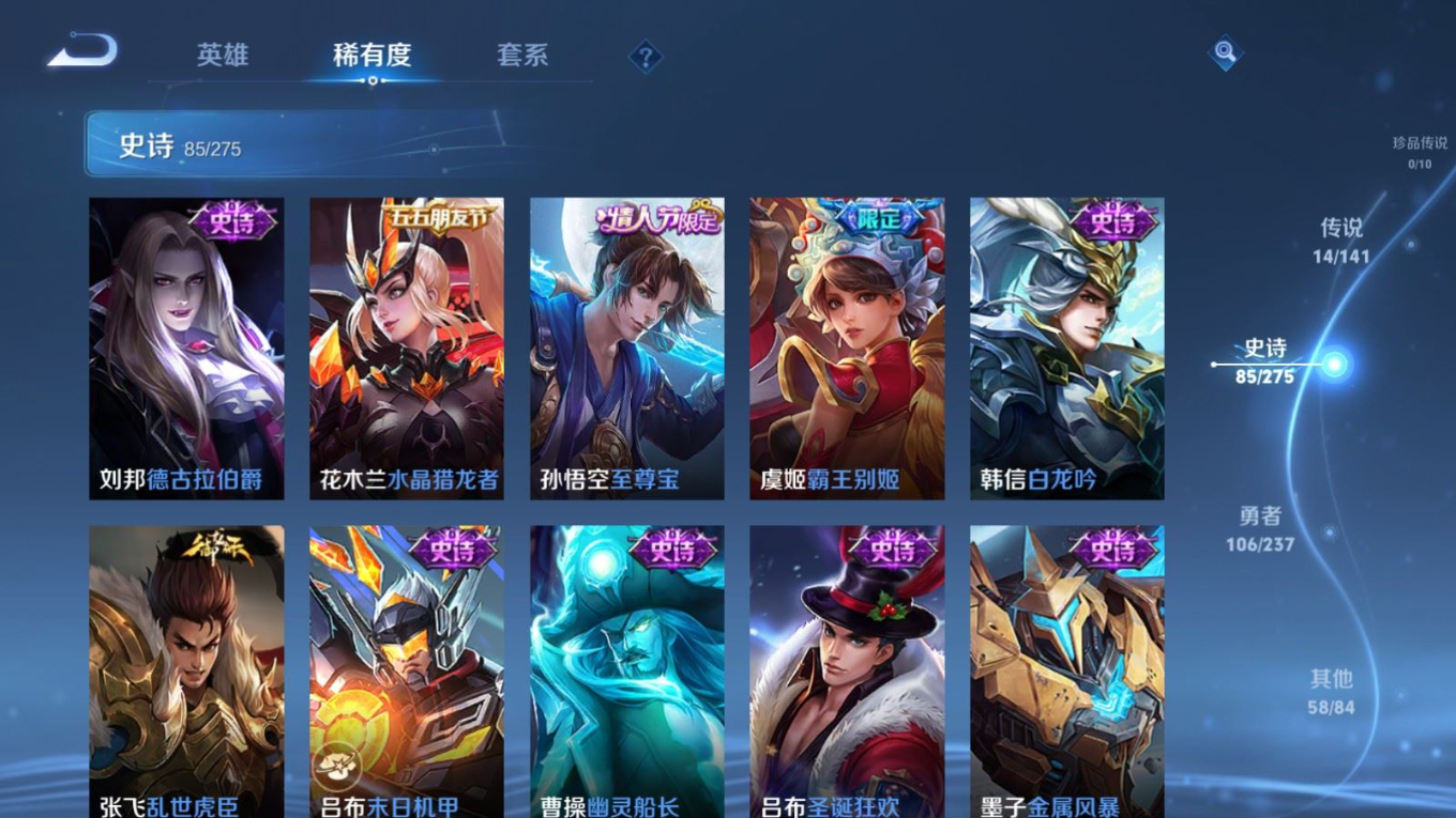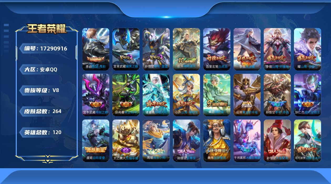 贵族等级:v8皮肤数:264生肖限定9 传说品质14 情人节限定3 荣耀典藏1 英雄数:120