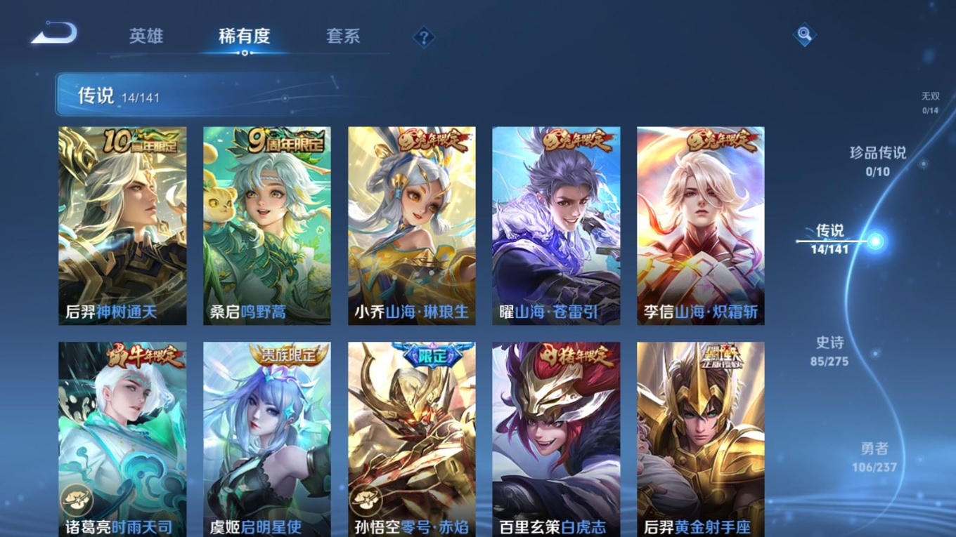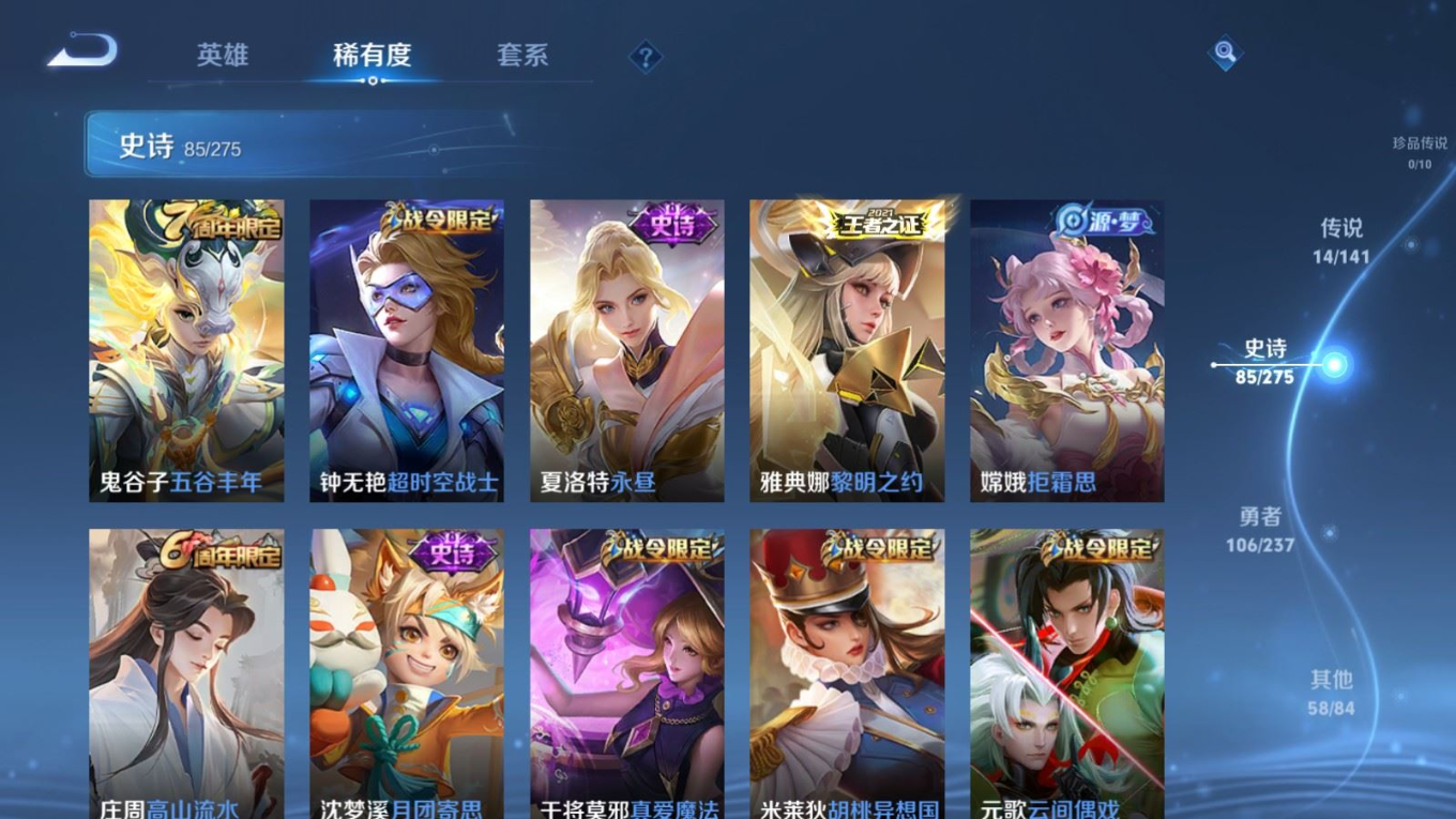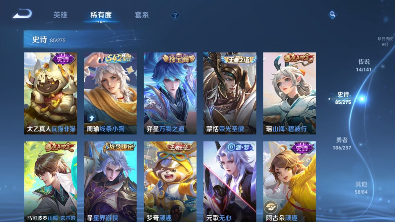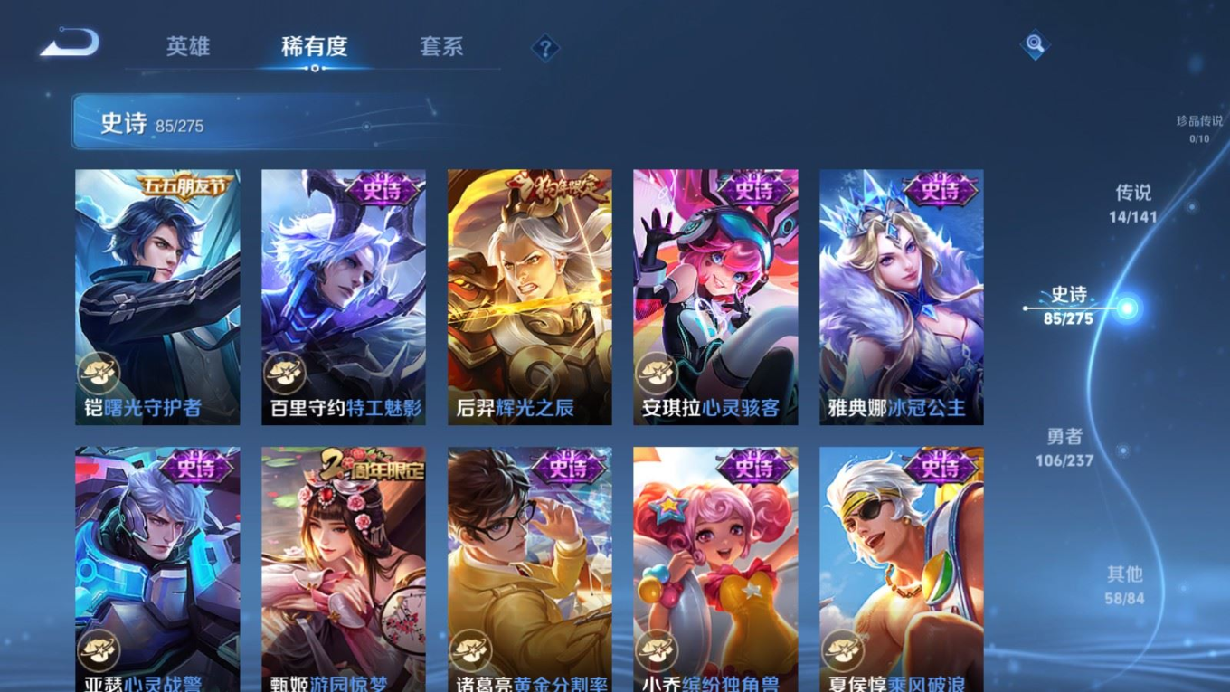 贵族等级:v8皮肤数:264生肖限定9 传说品质14 情人节限定3 荣耀典藏1 英雄数:120