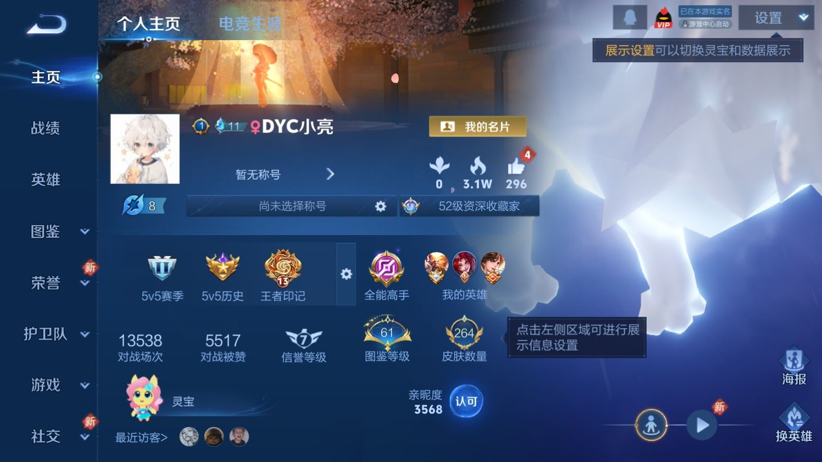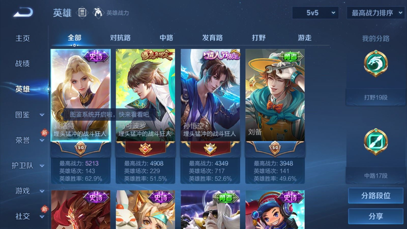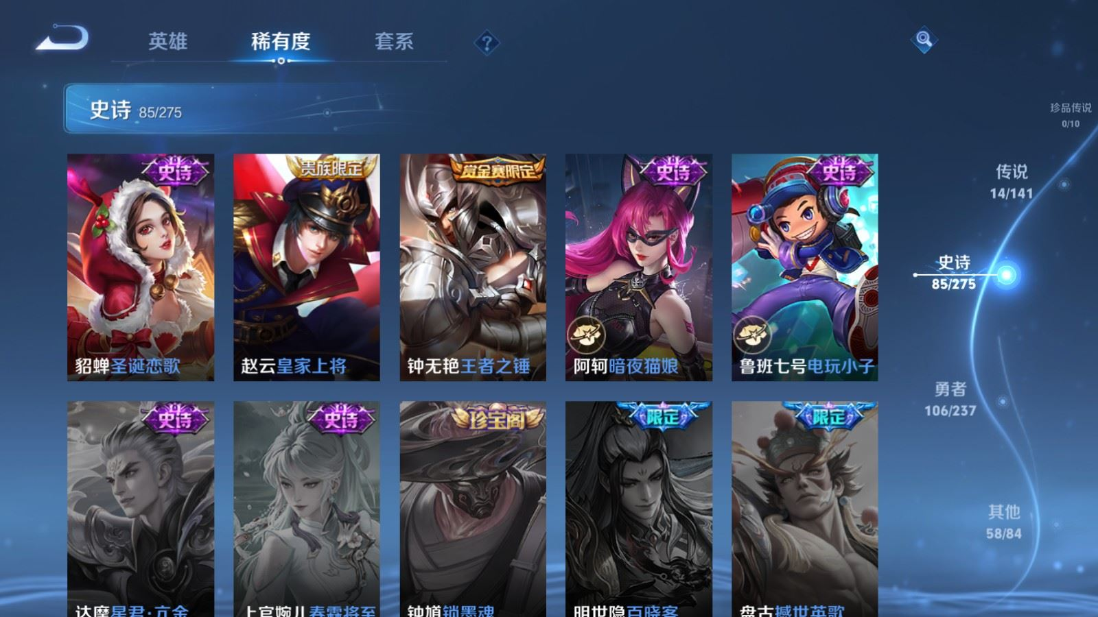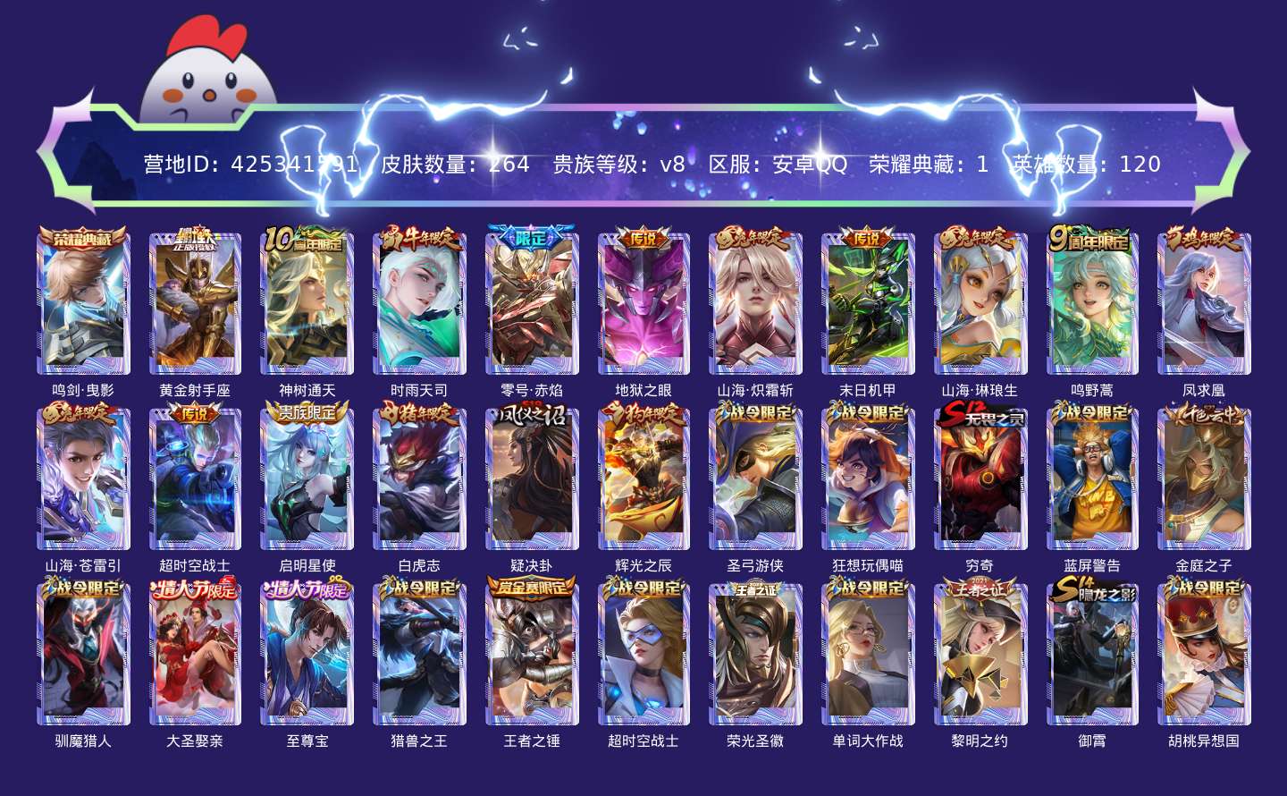 贵族等级:v8皮肤数:264生肖限定9 传说品质14 情人节限定3 荣耀典藏1 英雄数:120