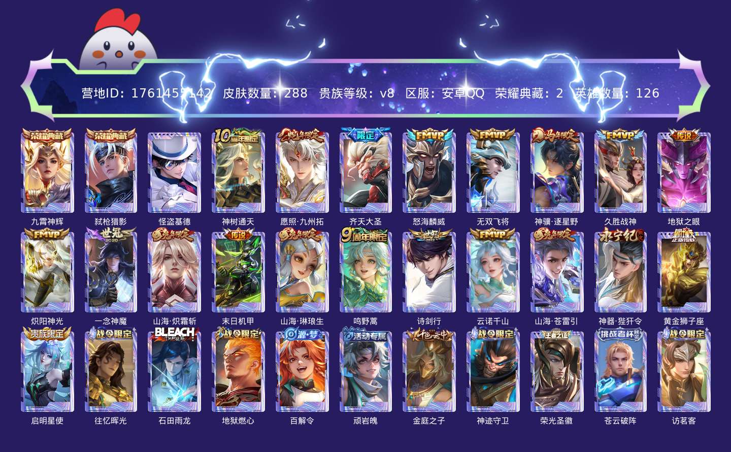 贵族等级:v8皮肤数:288传说品质20 生肖限定8 荣耀典藏2 珍品传说1 英雄数:126