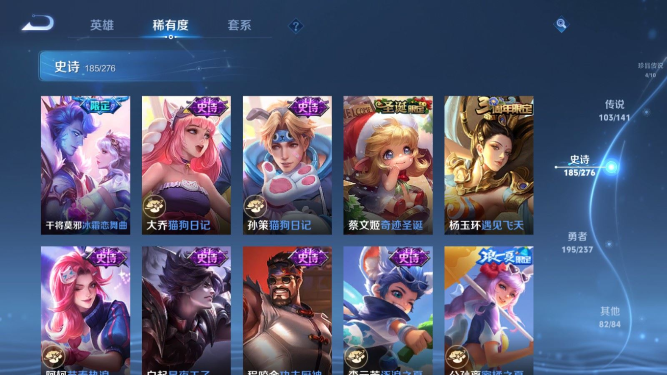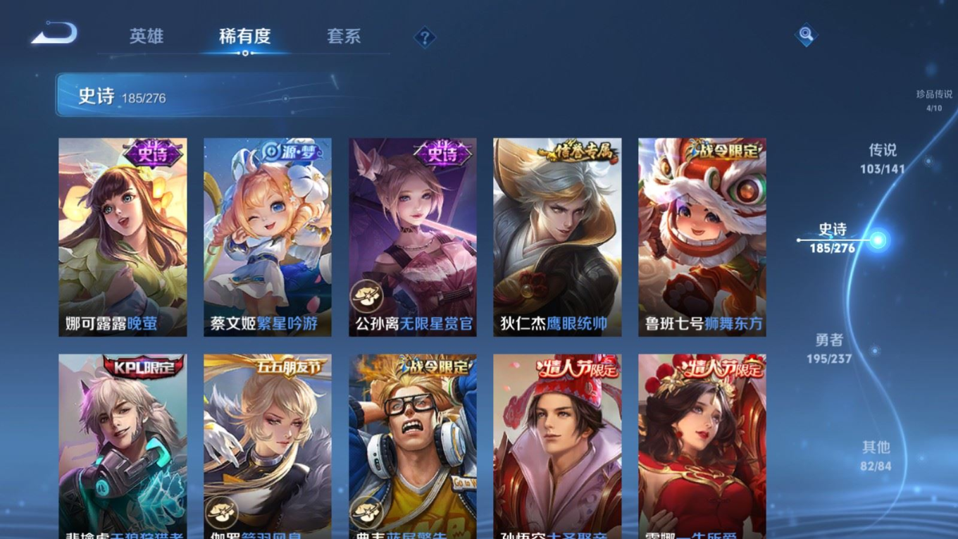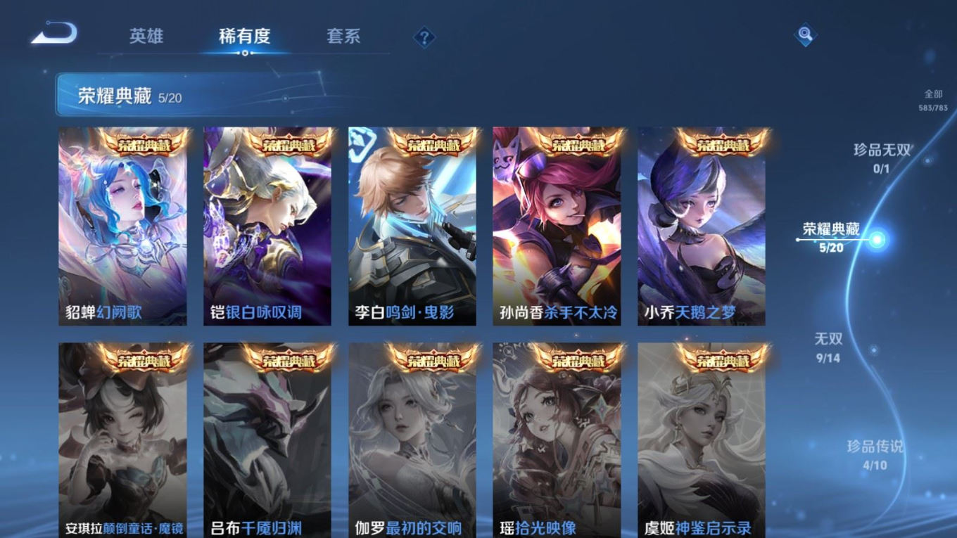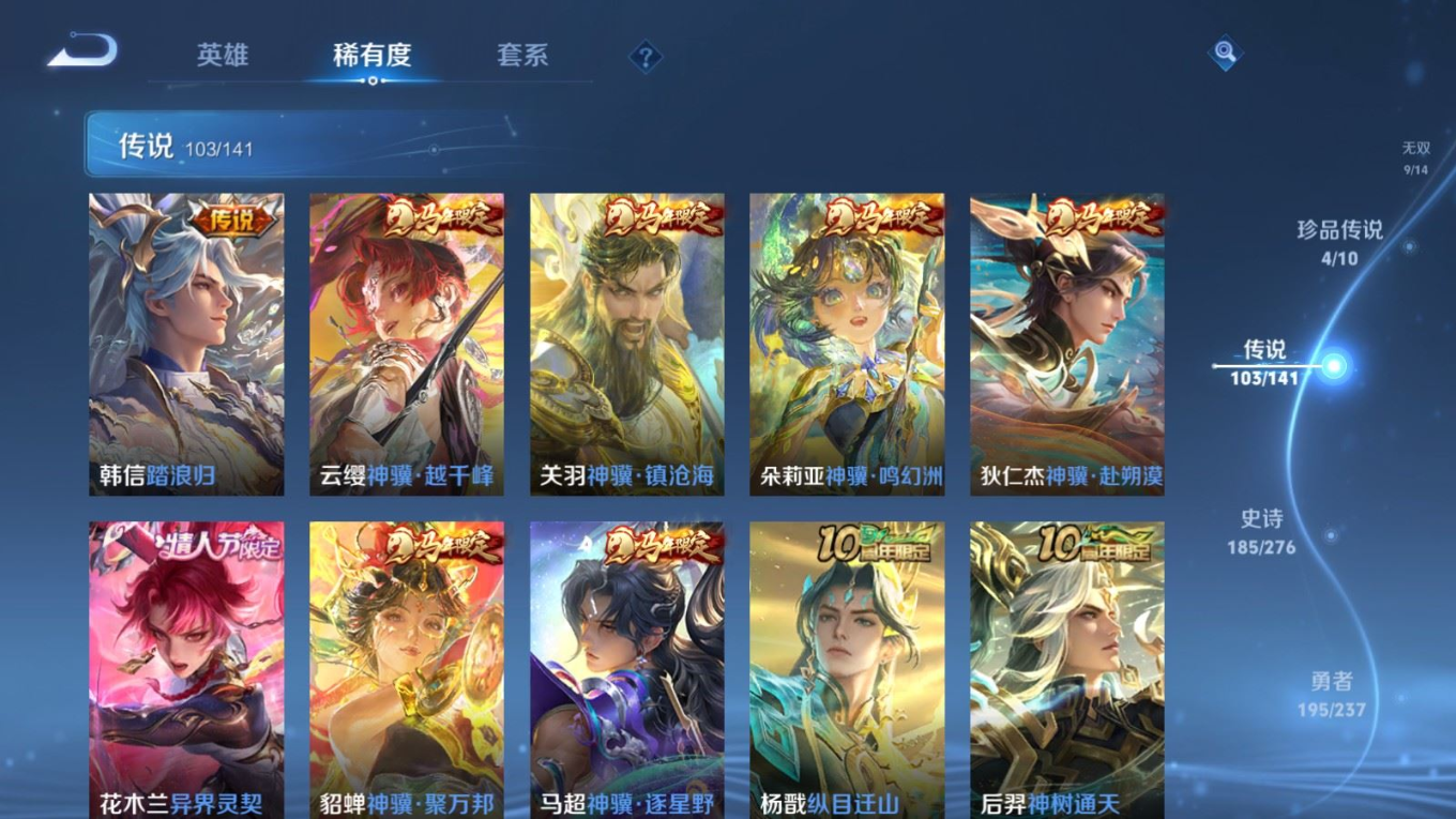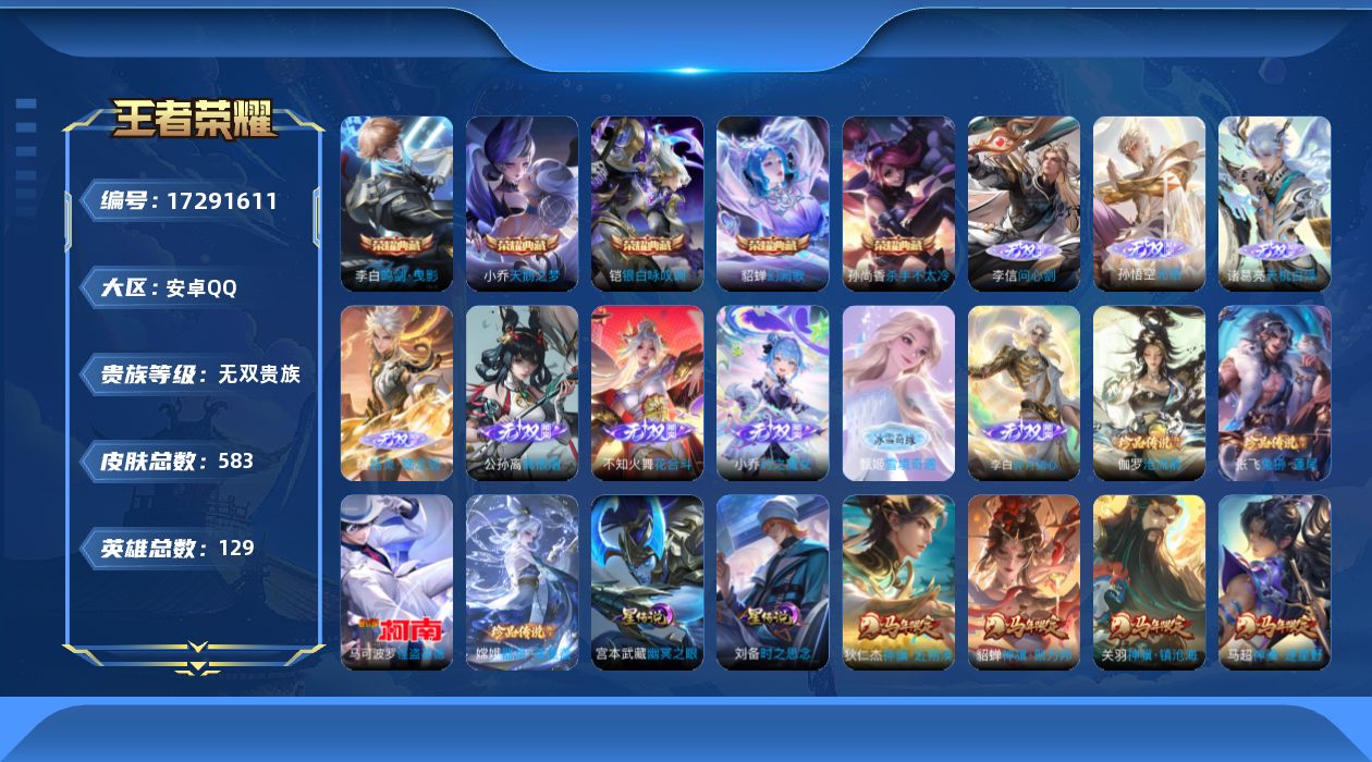 贵族等级:v10皮肤数:583生肖限定34 传说品质103 情人节限定15 无双9 荣耀典藏5 珍品传说4 英雄数:129