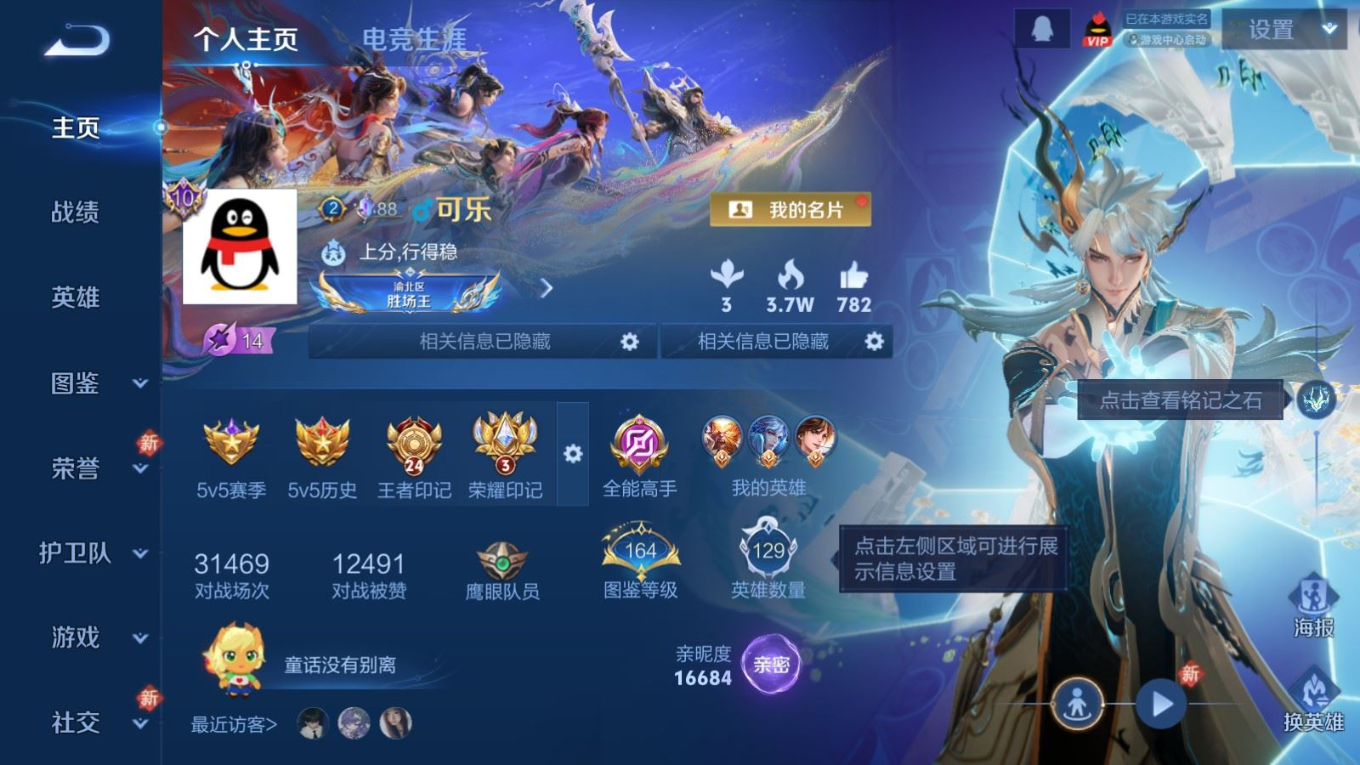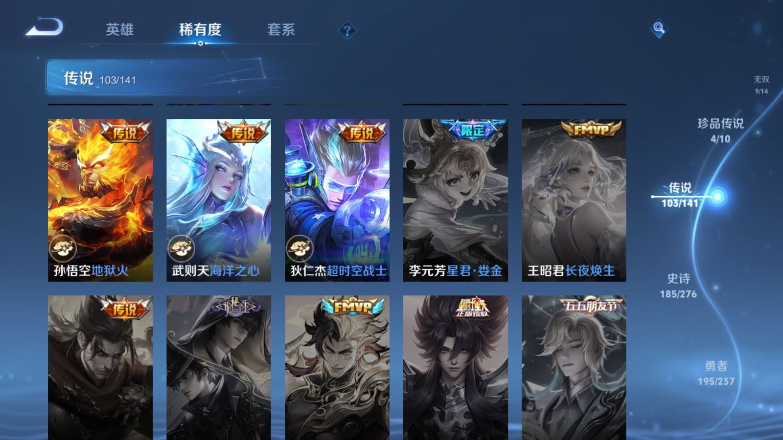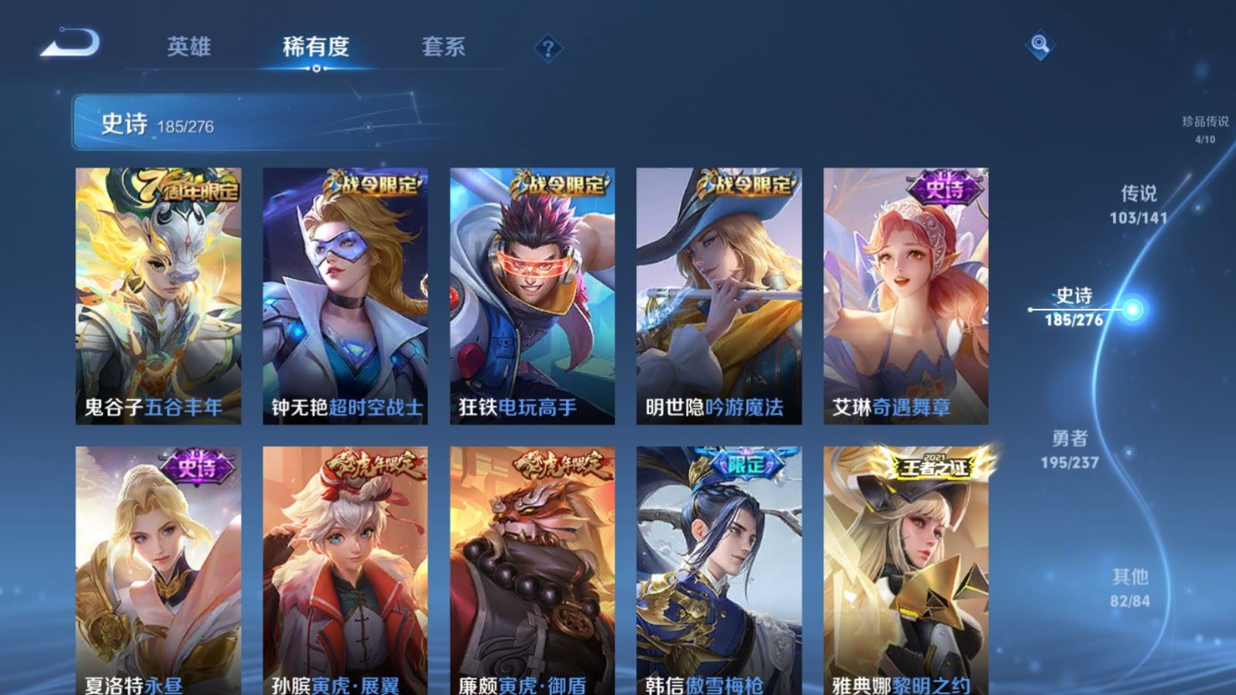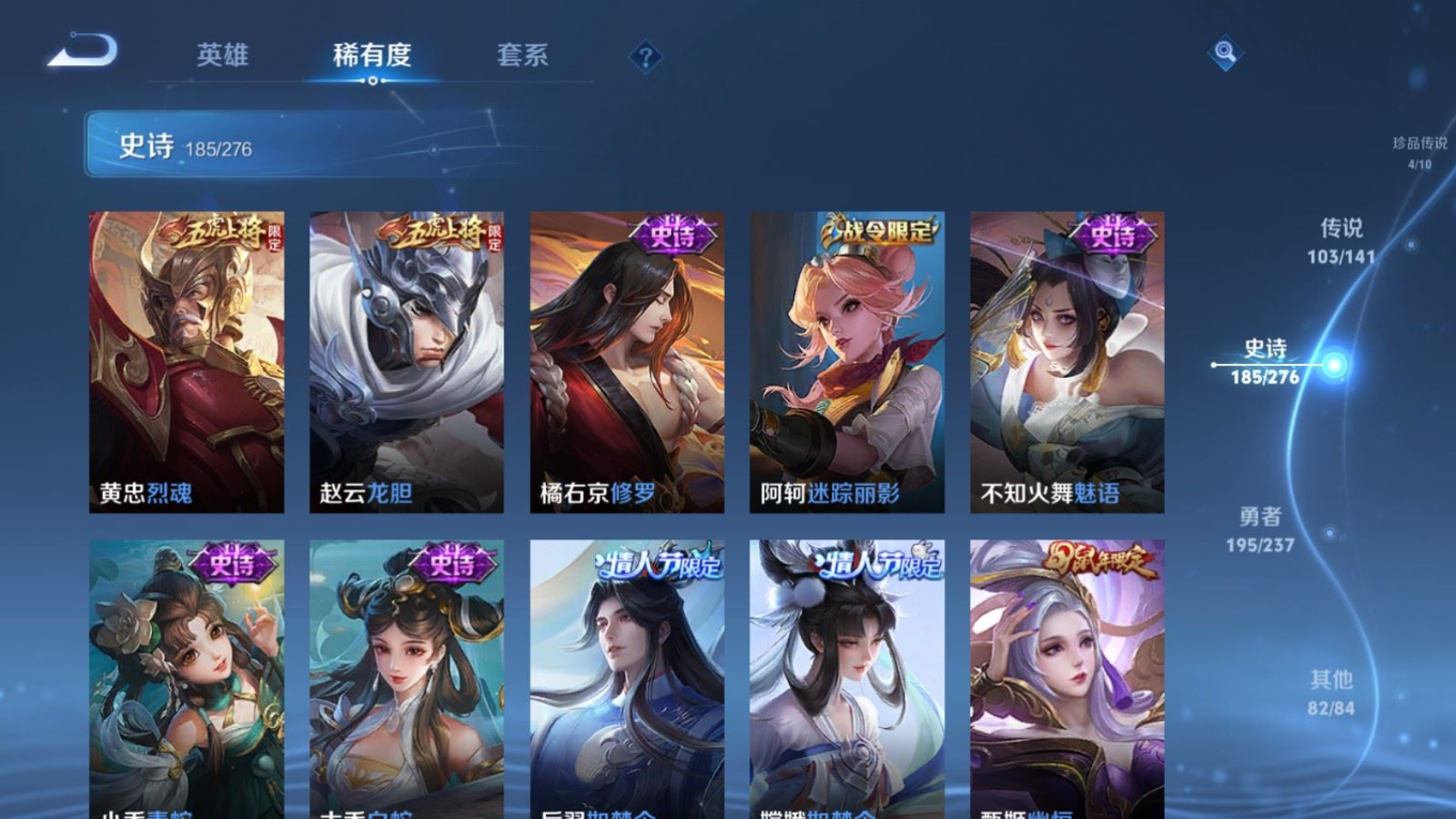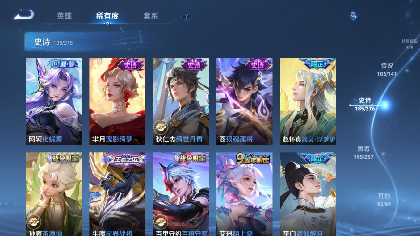 贵族等级:v10皮肤数:583生肖限定34 传说品质103 情人节限定15 无双9 荣耀典藏5 珍品传说4 英雄数:129