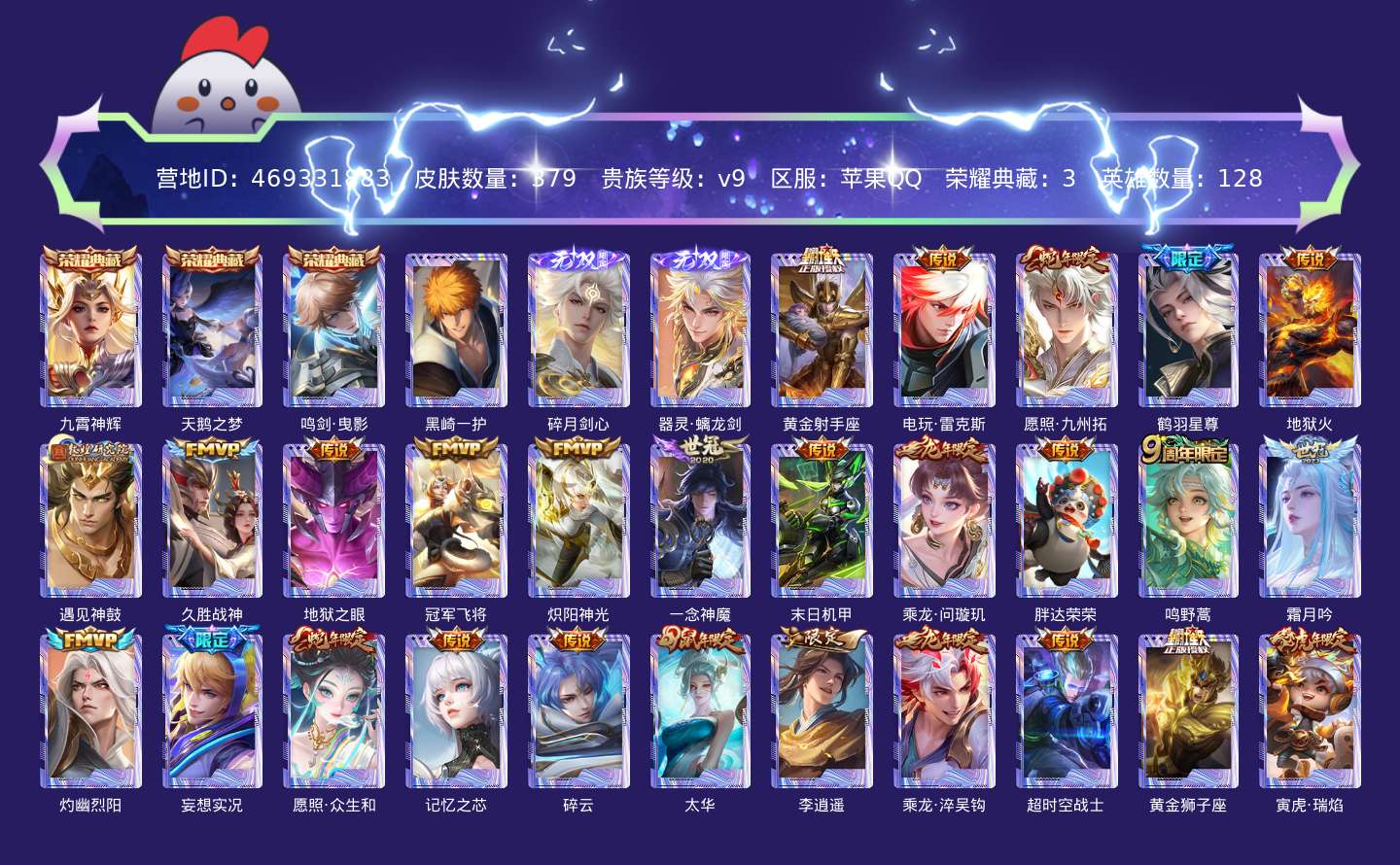 传说品质_后羿_黄金射手座传说品质_澜_电玩·雷克斯传说品质_澜_愿照·九州拓传说品质_诸葛亮_鹤羽星尊传说品质_孙悟空_地狱火传说品质_吕布_遇见神鼓传说品质_干将莫邪_久胜战神传说品质_宫本武藏_地狱之眼传说品质_花木兰_冠军飞将传说品质_镜_炽阳神光传说品质_李信_一念神魔传说品质_孙尚香_末日机甲传说品质_孙尚香_乘龙·问璇玑传说品质_梦奇_胖达荣荣传说品质_桑启_鸣野蒿传说品质_露娜_霜月吟传说品质_东皇太一_灼幽烈阳传说品质_马可波罗_妄想实况传说品质_妲己_愿照·众生和传说品质_公孙离_记忆之芯传说品质_百里守约_碎云传说品质_伽罗_太华传说品质_曜_李逍遥 传说品质_孙策_乘龙·淬吴钩传说品质_狄仁杰_超时空战士传说品质_达摩_黄金狮子座传说品质_鲁班七号_寅虎·瑞焰传说品质_鲁班七号_时之奇旅传说品质_虞姬_启明星使传说品质_百里玄策_白虎志传说品质_赵云_乘龙·铭钟鼎传说品质_裴擒虎_寅虎·赤拳