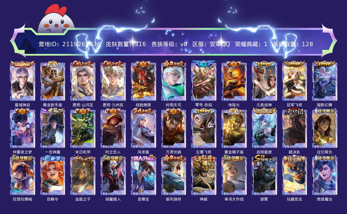 贵族等级:v8皮肤数:316传说品质19 生肖限定6 荣耀典藏1 情人节限定1 英雄数:128