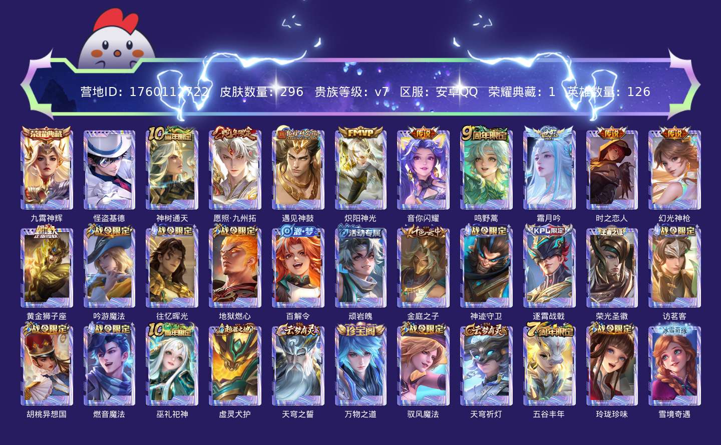 贵族等级:v7皮肤数:296传说品质10 生肖限定1 荣耀典藏1 珍品传说1 英雄数:126