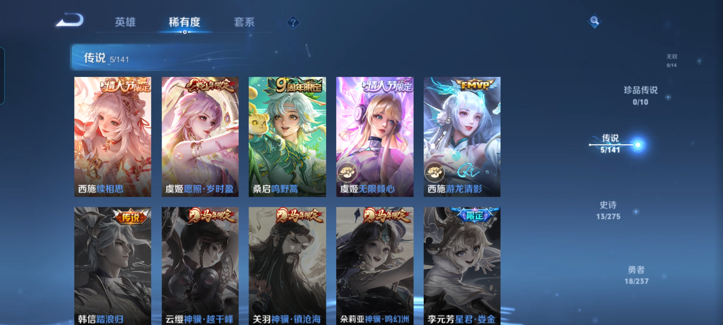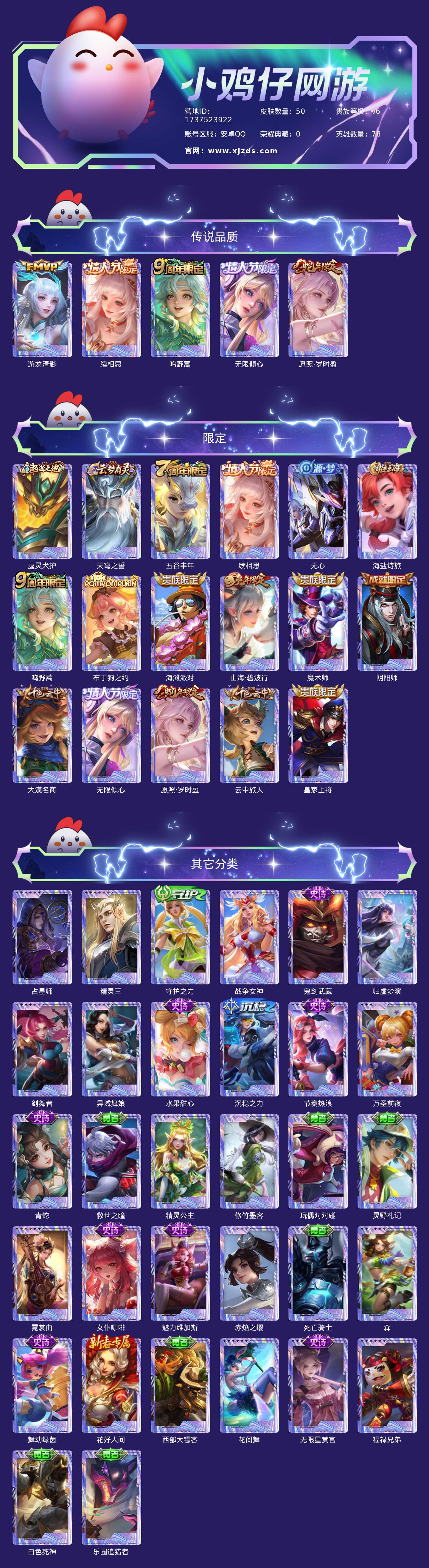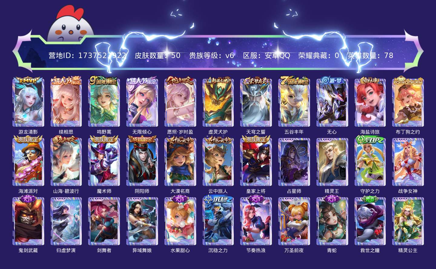 贵族等级:v6皮肤数:50传说品质5 情人节限定2 生肖限定2 英雄数:78