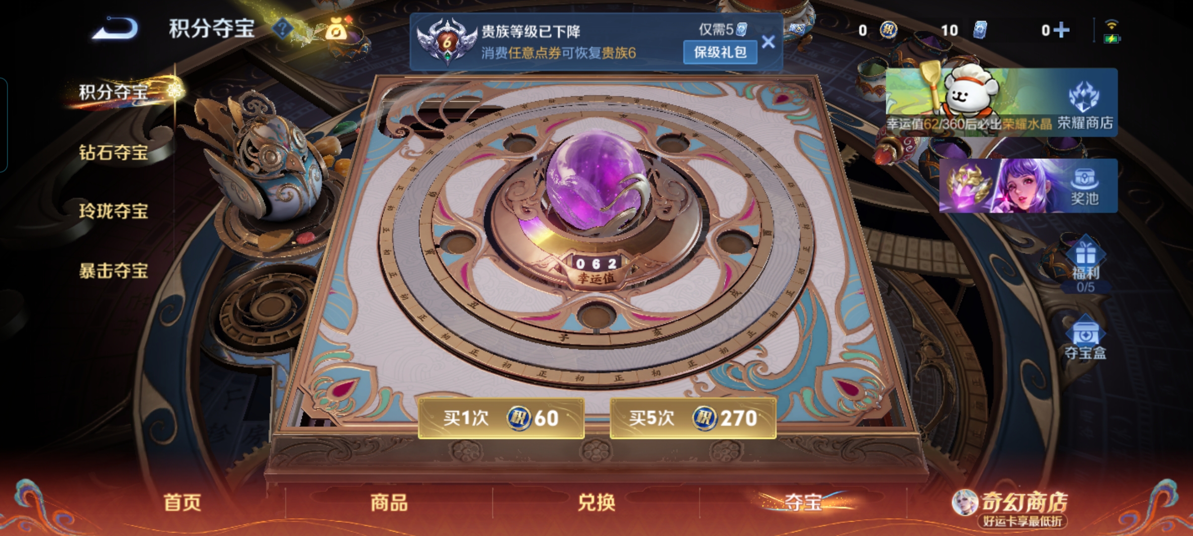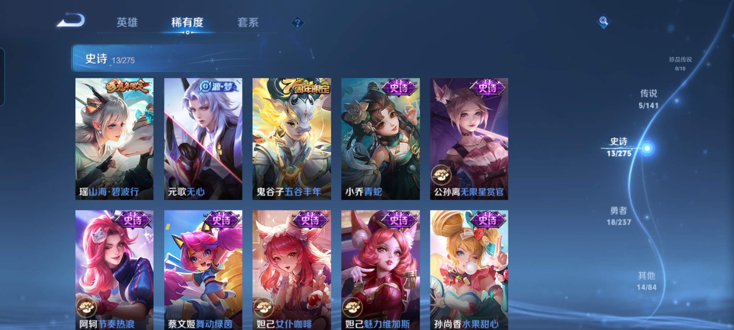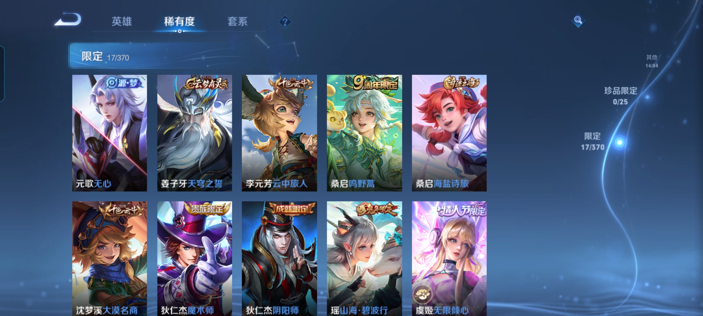 贵族等级:v6皮肤数:50传说品质5 情人节限定2 生肖限定2 英雄数:78