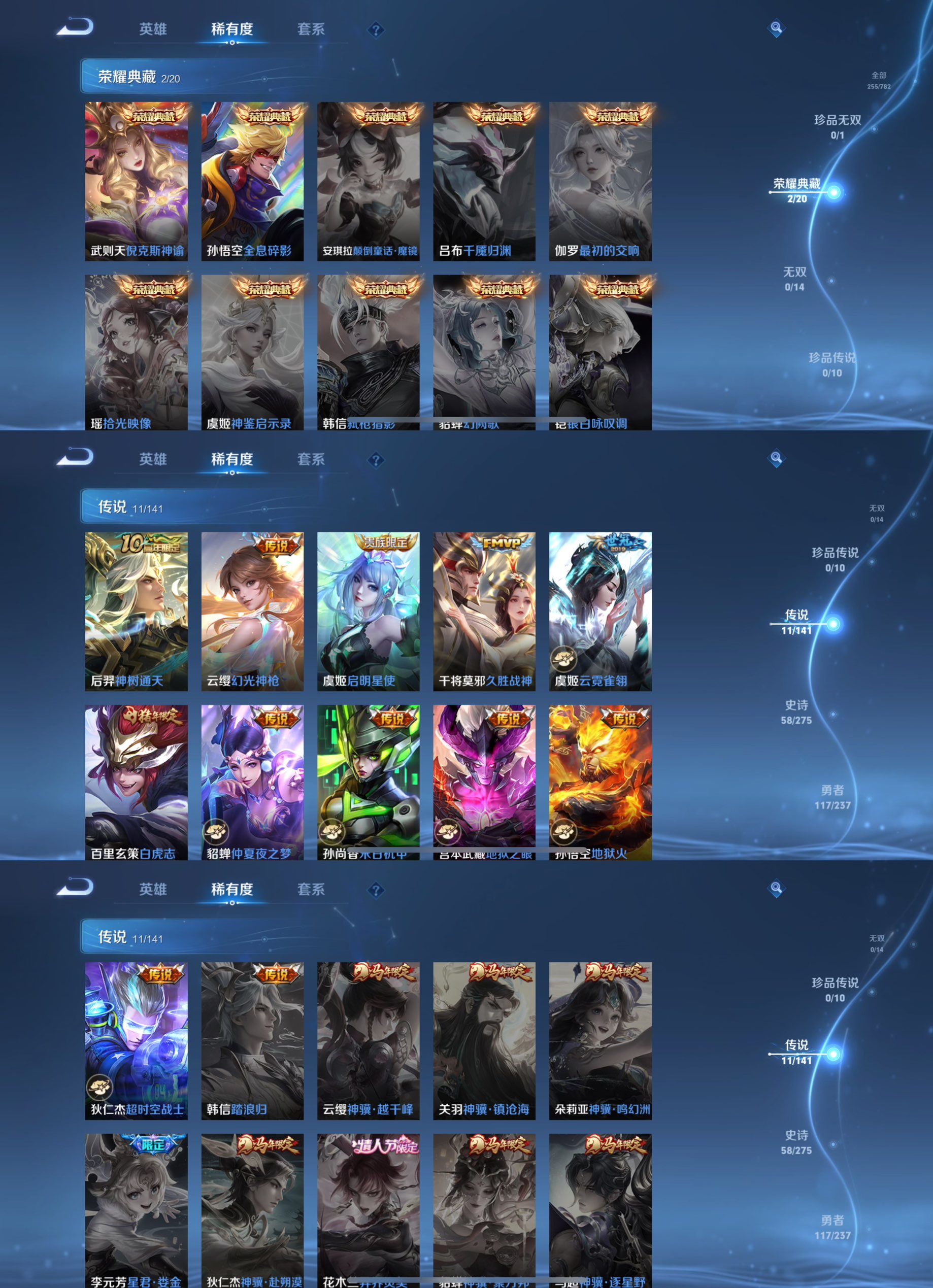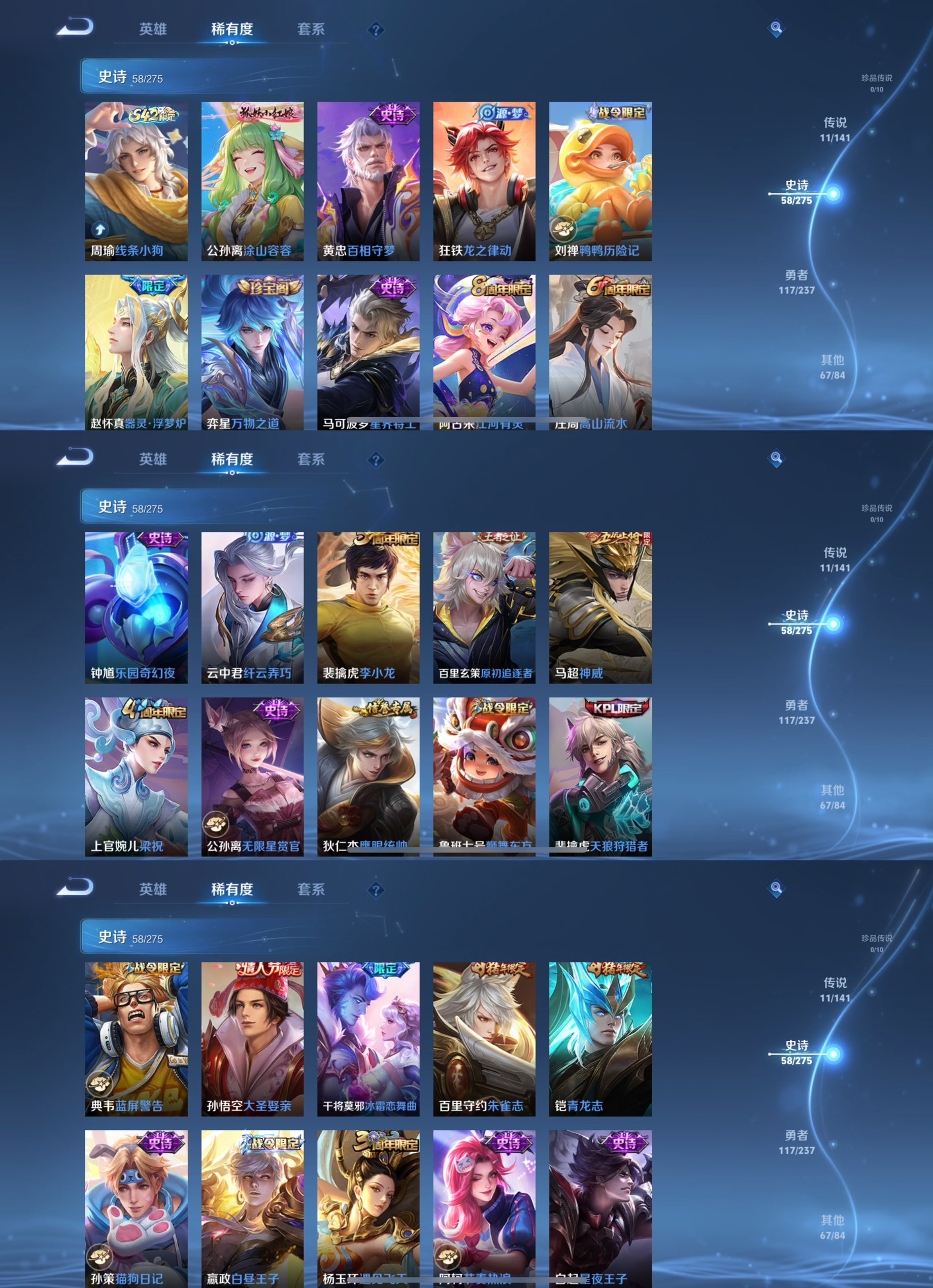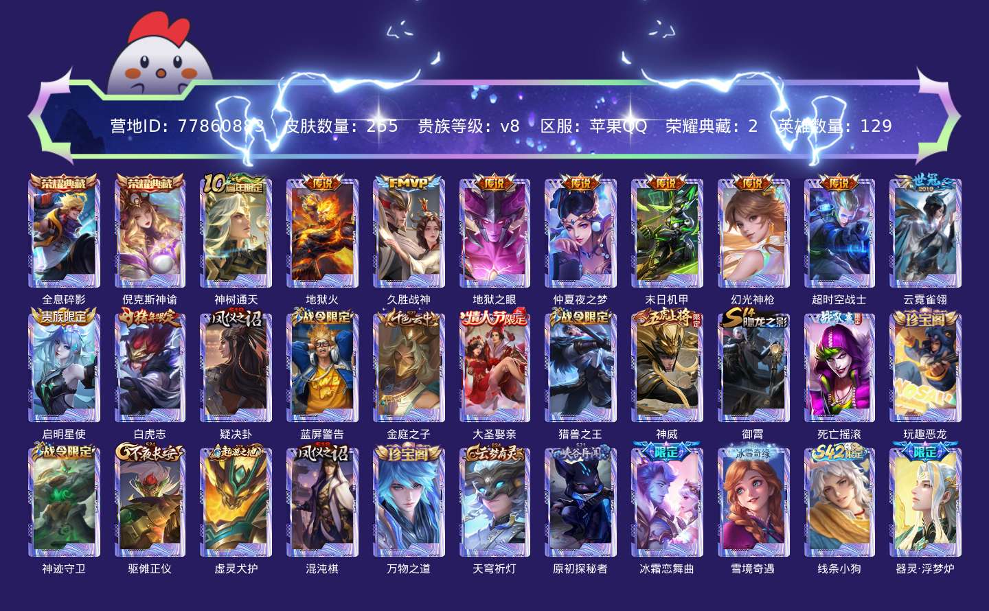 贵族等级:v8皮肤数:255传说品质11 情人节限定1 荣耀典藏2 生肖限定3 英雄数:129