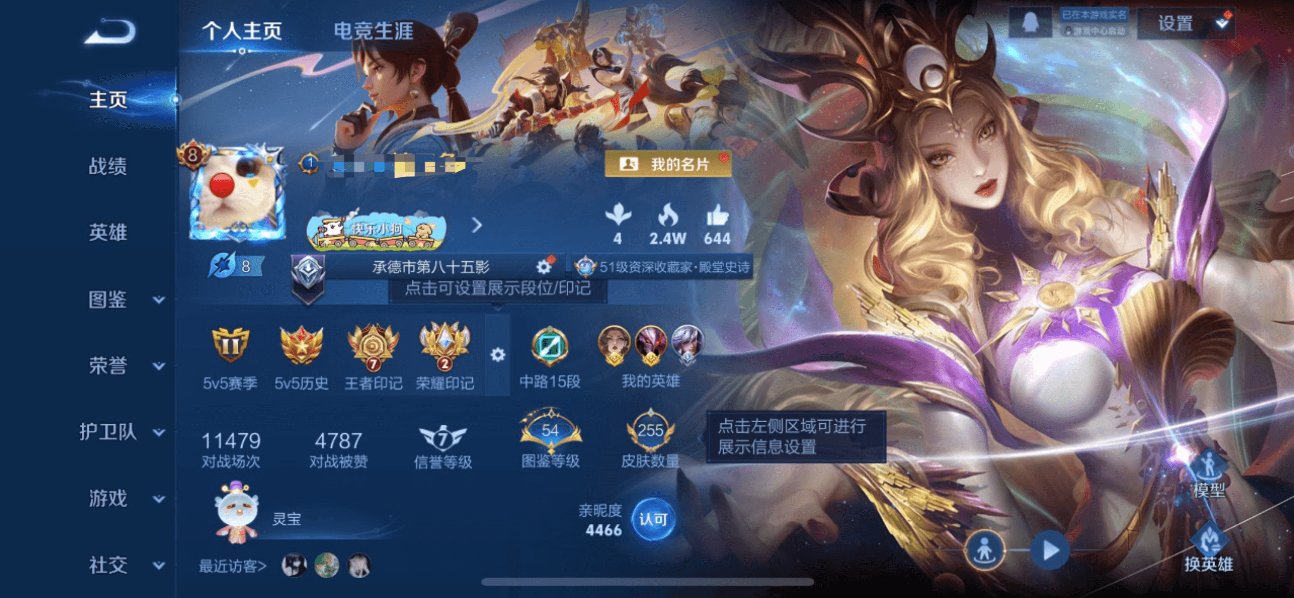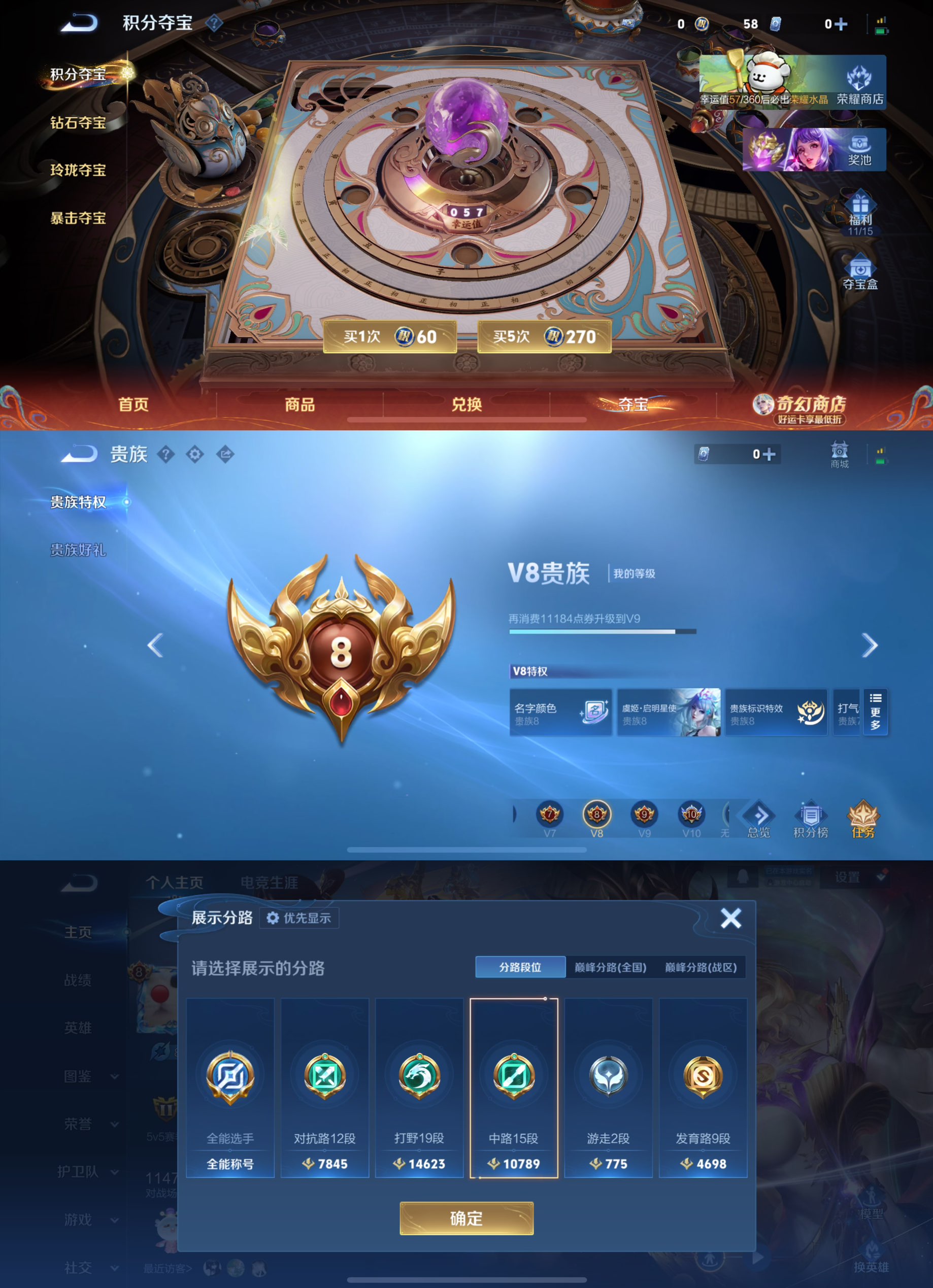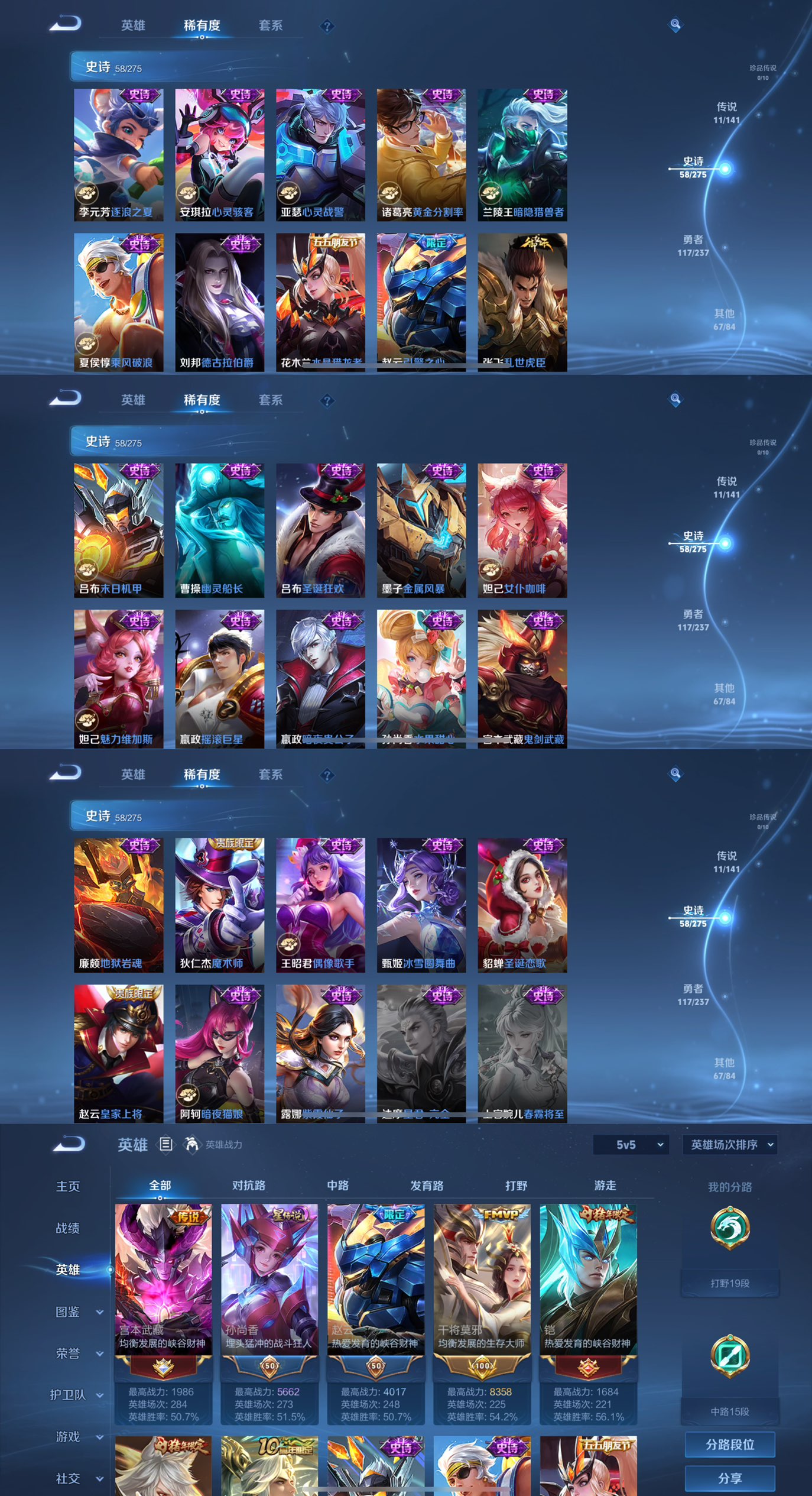 贵族等级:v8皮肤数:255传说品质11 情人节限定1 荣耀典藏2 生肖限定3 英雄数:129