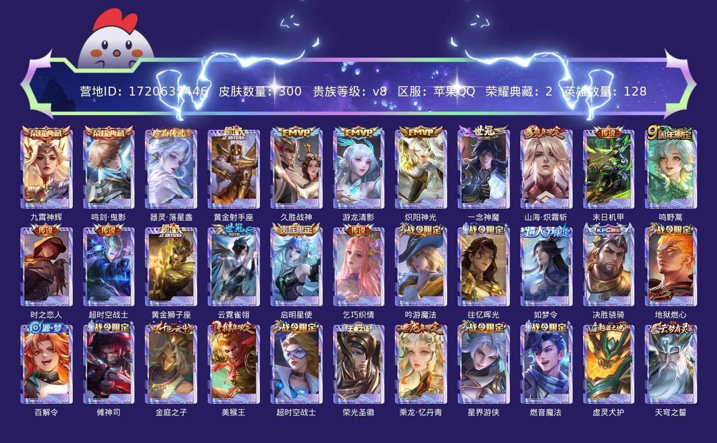 贵族等级:v8皮肤数:300传说品质14 情人节限定1 生肖限定4 荣耀典藏2 珍品传说1 英雄数:128