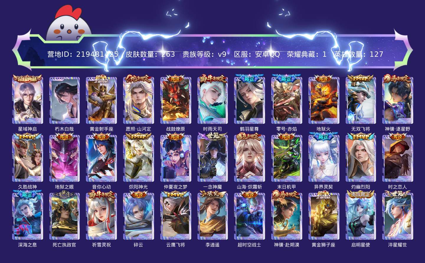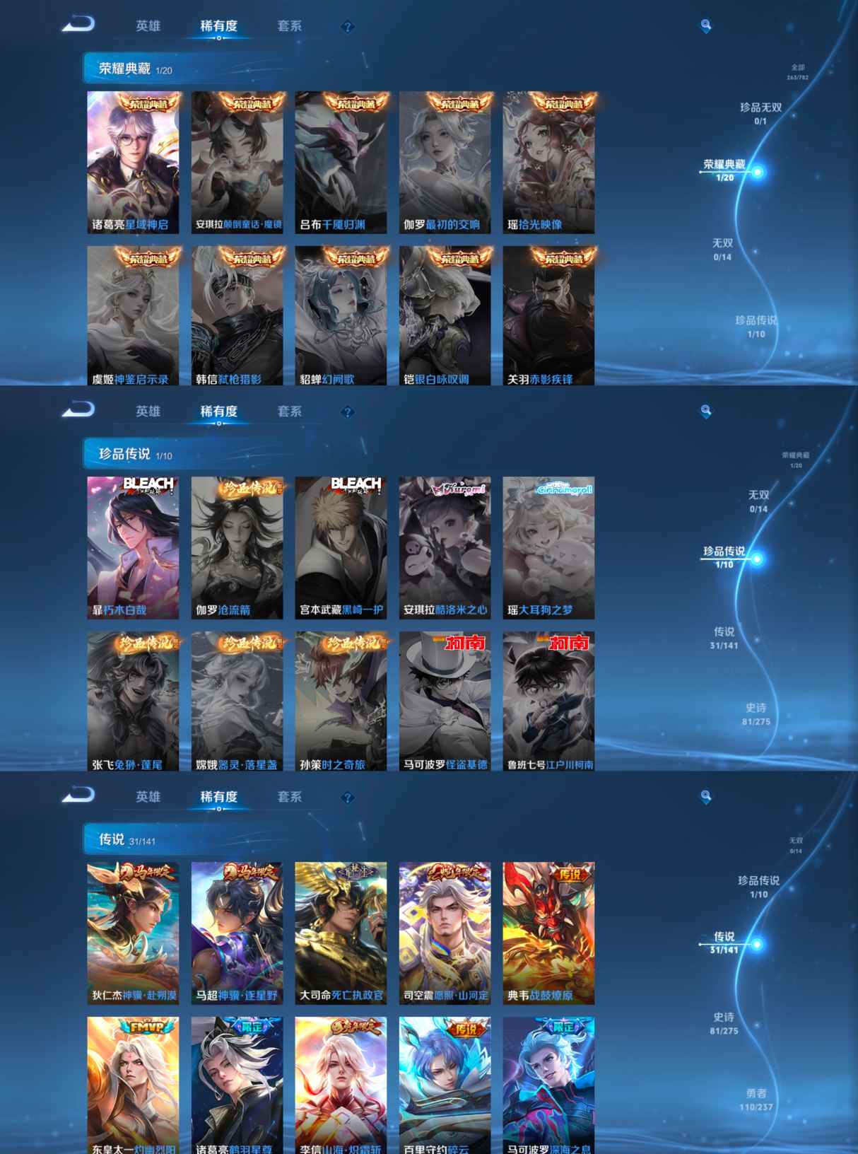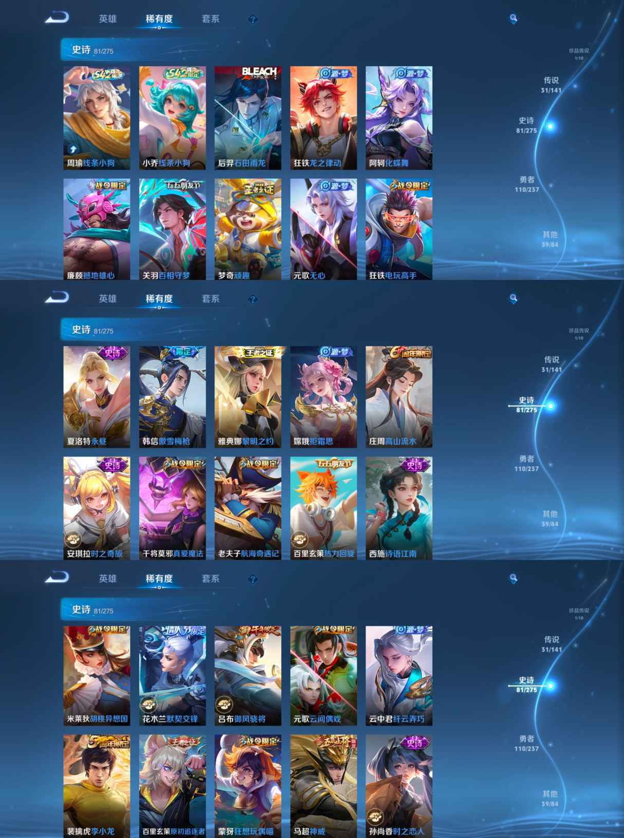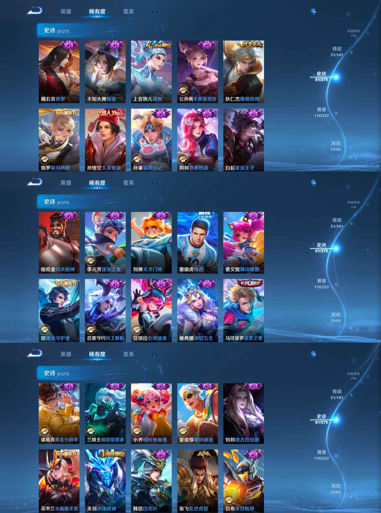 传说品质_后羿_黄金射手座传说品质_司空震_愿照·山河定传说品质_典韦_战鼓燎原传说品质_诸葛亮_时雨天司传说品质_诸葛亮_鹤羽星尊传说品质_孙悟空_零号·赤焰传说品质_孙悟空_地狱火传说品质_马超_无双飞将传说品质_马超_神骥·逐星野传说品质_干将莫邪_久胜战神传说品质_宫本武藏_地狱之眼传说品质_周瑜_音你心动传说品质_镜_炽阳神光传说品质_貂蝉_仲夏夜之梦传说品质_李信_一念神魔传说品质_李信_山海·炽霜斩传说品质_孙尚香_末日机甲传说品质_孙尚香_异界灵契传说品质_东皇太一_灼幽烈阳传说品质_刘备_时之恋人传说品质_马可波罗_深海之息传说品质_大司命_死亡执政官传说品质_公孙离_祈雪灵祝传说品质_百里守约_碎云传说品质_曜_云鹰飞将传说品质_曜_李逍遥 传说品质_狄仁杰_超时空战士传说品质_狄仁杰_神骥·赴朔漠传说品质_达摩_黄金狮子座传说品质_虞姬_启明星使传说品质_赵云_淬星耀世