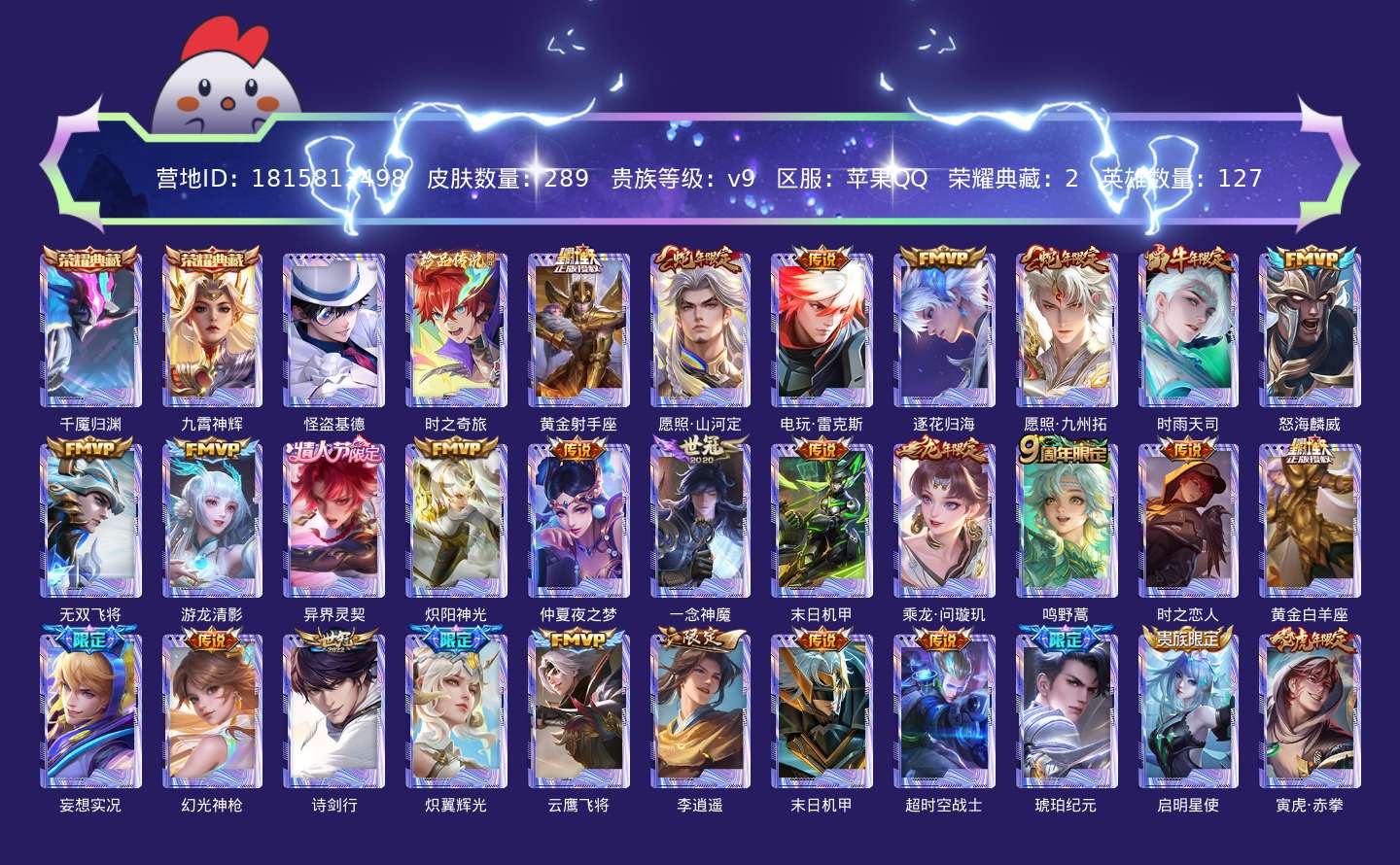 传说品质_后羿_黄金射手座传说品质_司空震_愿照·山河定传说品质_澜_电玩·雷克斯传说品质_澜_逐花归海传说品质_澜_愿照·九州拓传说品质_诸葛亮_时雨天司传说品质_吕布_怒海麟威传说品质_马超_无双飞将传说品质_西施_游龙清影传说品质_花木兰_异界灵契传说品质_镜_炽阳神光传说品质_貂蝉_仲夏夜之梦传说品质_李信_一念神魔传说品质_孙尚香_末日机甲传说品质_孙尚香_乘龙·问璇玑传说品质_桑启_鸣野蒿传说品质_刘备_时之恋人传说品质_张良_黄金白羊座传说品质_马可波罗_妄想实况传说品质_云缨_幻光神枪传说品质_李白_诗剑行传说品质_伽罗_炽翼辉光传说品质_曜_云鹰飞将传说品质_曜_李逍遥 传说品质_孙策_末日机甲传说品质_狄仁杰_超时空战士传说品质_铠_琥珀纪元传说品质_虞姬_启明星使传说品质_裴擒虎_寅虎·赤拳