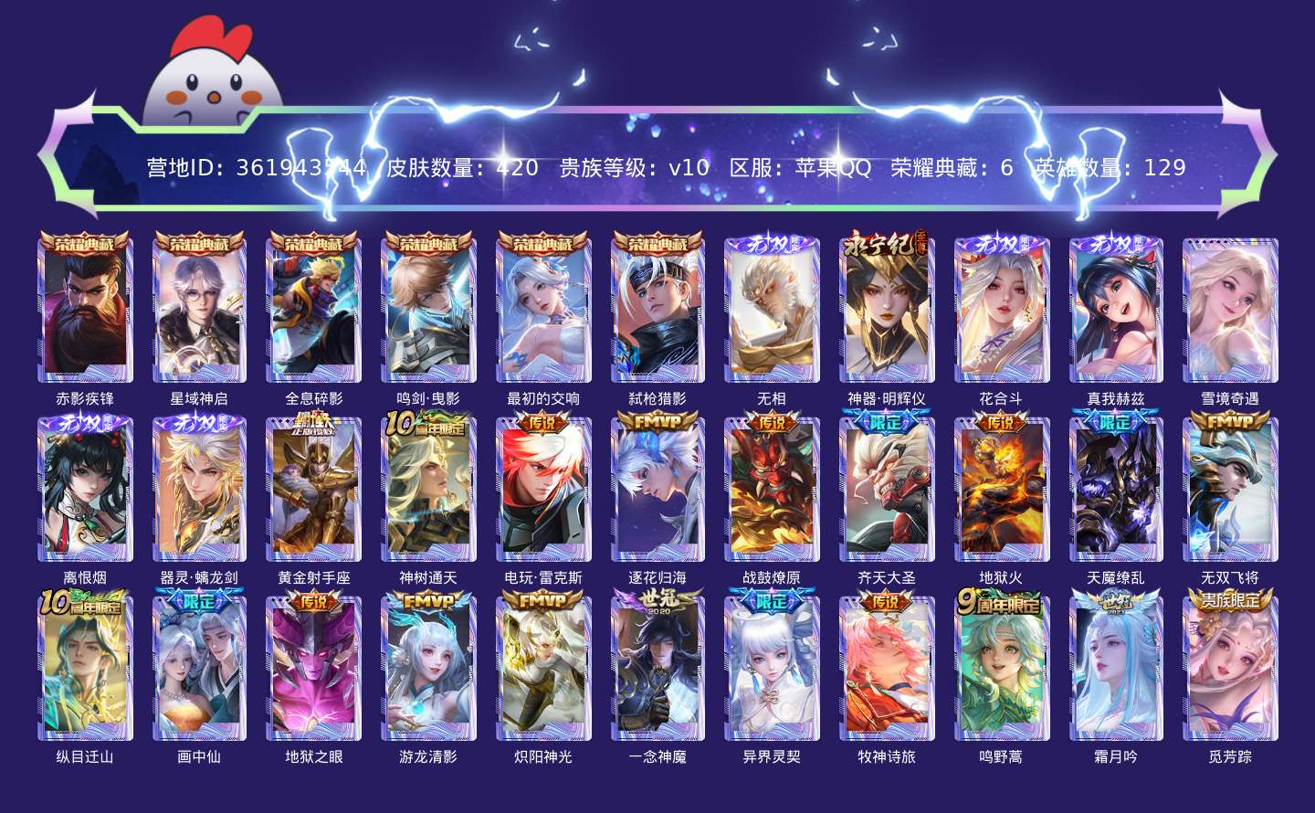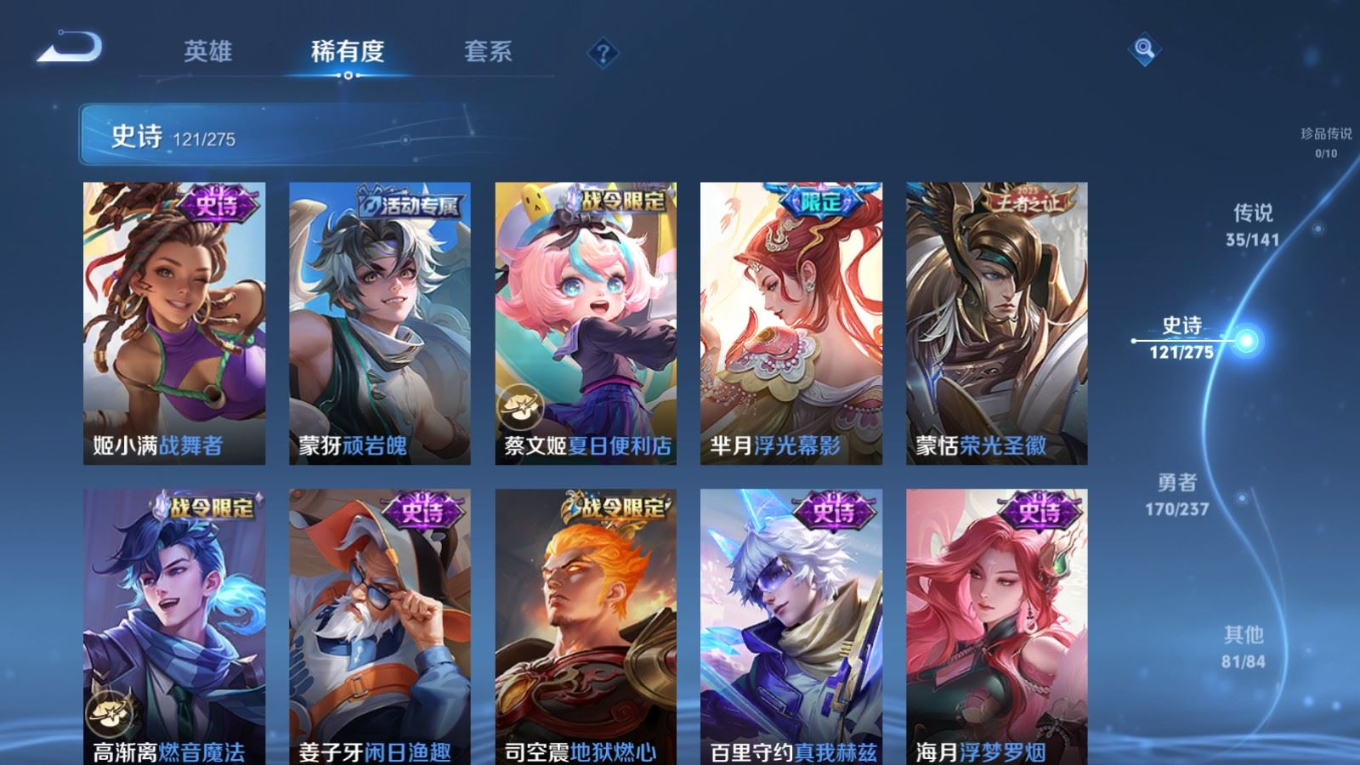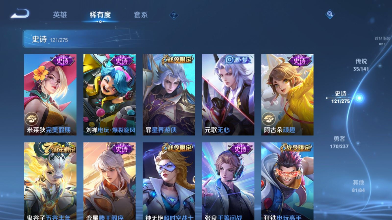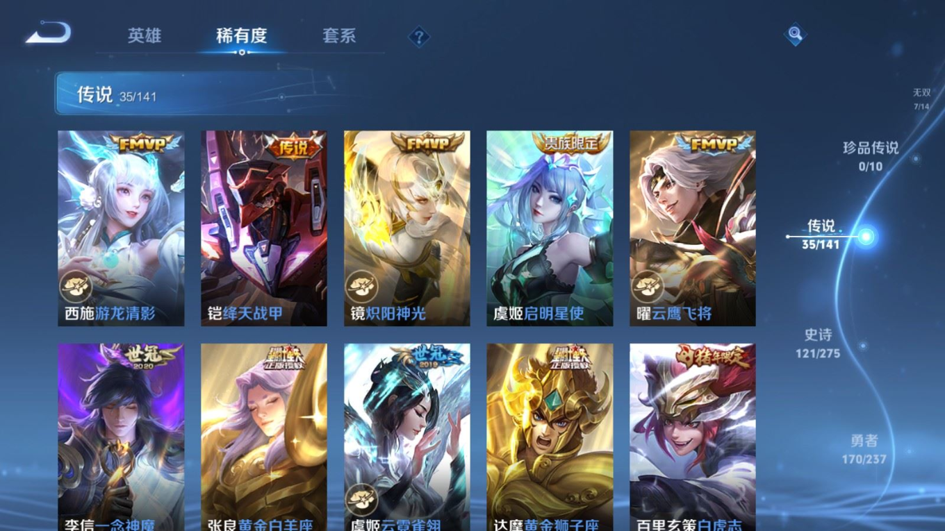 传说品质_后羿_黄金射手座传说品质_后羿_神树通天传说品质_澜_电玩·雷克斯传说品质_澜_逐花归海传说品质_典韦_战鼓燎原传说品质_孙悟空_齐天大圣传说品质_孙悟空_地狱火传说品质_吕布_天魔缭乱传说品质_马超_无双飞将传说品质_杨戬_纵目迁山传说品质_干将莫邪_画中仙传说品质_宫本武藏_地狱之眼传说品质_西施_游龙清影传说品质_镜_炽阳神光传说品质_李信_一念神魔传说品质_孙尚香_异界灵契传说品质_庄周_牧神诗旅传说品质_桑启_鸣野蒿传说品质_露娜_霜月吟传说品质_艾琳_觅芳踪传说品质_张良_黄金白羊座传说品质_妲己_愿照·众生和传说品质_云缨_幻光神枪传说品质_李白_凤求凰传说品质_李白_诗剑行传说品质_百里守约_碎云传说品质_曜_云鹰飞将传说品质_达摩_黄金狮子座传说品质_铠_绛天战甲传说品质_虞姬_云霓雀翎传说品质_虞姬_启明星使传说品质_百里玄策_白虎志传说品质_赵云_淬星耀世传说品质_裴擒虎_祥瑞亨通传说品质_王昭君_乞巧织情