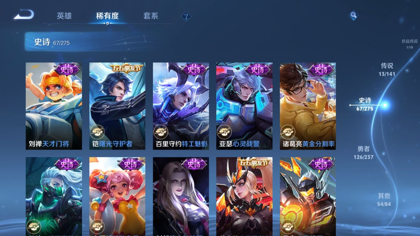 贵族等级:v7皮肤数:263传说品质13 生肖限定3 荣耀典藏1 珍品传说1 无双1 英雄数:127